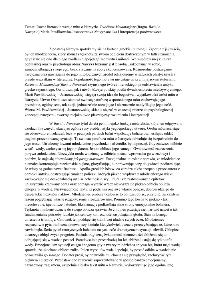 Temat: Różne literackie wersje mitu o Narcyzie. Owidiusz Metamorfozy (fragm. Baśni o Narcyzie),Maria Pawlikowska-Jasnorzewska Narcyz-analiza i interpretacja porównawcza. Z postacią Narcyza spotykamy się na kartach greckiej mitologii. Zgodnie z jej treścią, był on młodzieńcem, który skonał z tęsknoty za swoim odbiciem dostrzeżonym w tafli strumienia, gdyż stało się ono dla niego źródłem niepojętego zachwytu i miłości. We współczesnej kulturze popularnej oraz w psychologii obraz Narcyza tożsamy jest z osobą ,,zakochaną" w sobie, samouwielbiającą swoje ego, bezkrytycznie na sobie skoncentrowaną. Różnorodne postrzeganie narcyzmu oraz nawiązania do jego mitologicznych źródeł odnajdujemy w sztukach plastycznych a przede wszystkim w literaturze. Popularność tego motywu nie ustaję wraz z mijającymi stuleciami. Zarówno Metamorfozy(Baśń o Narcyzie) rzymskiego twórcy literackiego, przedstawiciela antyku grecko-rzymskiego, Owidiusza, jak i utwór Narcyz polskiej poetki dwudziestolecia międzywojennego, Marii Pawlikowskiej – Jasnorzewskiej, sięgają swoją ideą do bogactwa i wyjątkowości treści mitu o Narcyzie. Utwór Owidiusza stanowi swoistą parafrazę wspomnianego mitu-zachowuje jego przesłanie, ogólny sens, tok akcji, jednocześnie rozwijając i nieznacznie modyfikując jego treść. Wiersz M. Pawlikowskiej - Jasnorzewskiej skłania się zaś w znacznej mierze do psychologicznej koncepcji narcyzmu, tworząc niejako dwie płaszczyzny rozumienia i interpretacji. W Baśni o Narcyzie tytuł dzieła pełni niejako funkcję metatekstu, którą ten odgrywa w dziełach lirycznych, ukazując ogólne rysy problematyki yegoepickiego utworu. Osoba mówiąca staje się obserwatorem zdarzeń, lecz w pewnych partiach baśni współczuje bohaterowi, usiłując oddać tragizm prezentowanej sytuacji. Ta swoista parafraza mitu o Narcyzie odwołuje się bezpośrednio do jego treści. Utrudzony łowami młodzieniec przychodzi nad źródło, by odpocząć. Gdy zauważa odbicie w tafli wody, zachwyca się jego pięknem. Jest to oblicze jego samego. Gwałtowność zauroczenia porywa ,młodzieńca. Niezwykła uroda widzianej w odbiciu postaci wprowadza go w zachwyt i podziw, iż staje się nieruchomy jak posąg marmuru. Emocjonalne uniesienie sprawia, że młodzieniec niemalże kontempluje nieziemskie piękno, gloryfikując je- porównując oczy do gwiazd, podkreślając, że włosy są godne nawet Bachusa i Apolla-greckich bóstw, co zdradza także czerpanie przez autora z dorobku antyku, dostrzegając rumiane policzki, których piękno wypływa z młodzieńczego wieku, zachwycając się doskonałością ust i szlachetnością szyi. Pluralizm zastosowanych epitetów uplastycznia kreowany obraz oraz pomaga wyrazić wręcz niewyrażalne piękno odbicia oblicza chłopca w wodzie. Nieświadomość faktu, iż podziwia one swe własne oblicze, doprowadza go do desperackich czynów i aktów. Młodzieniec próbuje ucałować to oblicze, objąć, przytulić, za każdym razem pogłębiając własne rozgoryczenie i rozczarowanie. Pomimo tego kocha to piękno - tak nieuchwytne, tajemnicze i złudne. Eksklamacje podkreślają silne strony emocjonalne bohatera. Tęsknota i miłosne uczucie do swego oblicza sprawia, że chłopiec przestaje się martwić nawet o tak fundamentalne potrzeby ludzkie jak sen czy konieczność zaspokajania głodu. Stan miłosnego uniesienia triumfuje. Człowiek ten poddaje się kłamliwej ułudzie swych oczu. Młodzieniec rozpaczliwie pyta okoliczne drzewa, czy istniało kiedykolwiek uczucie przewyższające te, które nim zawładnęło. Seria pytań retorycznych bohatera nasyca treść dramatyzmem sytuacji, chwili. Chłopiec dostrzega obłęd swych pragnień. Posiada tragiczną świadomość niemożności zbliżenia się do odbijającej się w wodzie postaci. Paradoksalnie przeszkodzą ku ich zbliżeniu staję się tylko tafla wody. Emocjonalizm sytuacji osiąga apogeum gdy z twarzy młodzieńca spływa łza, która mąci wodę i sprawia, że ukochane oblicze znika. Pełen wyrzutów woła i apeluje, by postać odbita w wodzie nie pozostawiła go samego. Bohater prosi, by pozwoliła mu chociaż się przyglądać, zachwycać tym pięknem i cierpieć. Przedstawione zdarzenie zaprezentowane w sposób bardzo emocjonalny, naznaczony tragizmem, uzupełnia niejako tekst mitu o Narcyzie, wykorzystując jego ogólną ideę. Dzieło liryczne Narcyz M. Pawlikowskiej – Jasnorzewskiej, zaledwie czterowersowe, porusza problematykę oscylująca, tak jak u Owidiusza, wokół historii mitologicznego Narcyza. Tytuł, analogicznie jak w wypadku Baśni o Narcyzie jest metatekstem. Kontekst wiersza oraz tytuł wskazują, iż podmiotem lirycznym jest młody chłopiec o narcystycznym usposobieniu i takich też skłonnościach. Być może podmiot utożsamia się z mitologicznym Narcyzem. Czasowniki w formie przeszłej świadczą o tym, że wiersz prezentuje minione wydarzenie z życia osoby mówiącej. Sytuacja liryczna jest analogiczna do utworu rzymskiego twórcy i samego mitu o Narcyzie. Bohater każdego z tych trzech dzieł znajduje się nad wodą, otoczony okoliczną roślinnością i wpatruje się we własne odbicie w tafli wodnej. Jednakże utwór polskiej poetki wyraźnie nawiązuje do psychologicznej koncepcji narcyzmu. Podmiot liryczny poddaje się autorefleksji, która ma swój wyraz w pytaniu retorycznym, wieńczącym wiersz. Pragnie on doszukać się powodów braku miłości innych ludzi wobec niego samego i jego piękna oraz przyczyny udręk z ich strony. Osoba mówiąca, bezkrytycznie zaopatrzona we własna urodę, nie dostrzega jej niedoskonałości. Zahipnotyzowany ułudą własnego piękna wyraża swoje niezrozumienie, wzburzenie i rozgoryczenie, pytając „ czemu mnie nie kochają?”. Utwór M. Pawlikowskiej – Jasnorzewskiej stanowi XX – wieczną, poetycką wizję mitu o Narcyzie. Jednakże Narcyz u wspomnianej poetki nie cierpi tylko z tęsknoty za