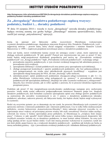 INSTYTUT STUDIÓW PODATKOWYCH http://ksiegowosc.infor.pl/wiadomosci/697204,Za-deregulacje-doradztwa-podatkowego-zaplaca-wszyscypodatnicy-budzet-i-doradcy-podatkowi.html Za „deregulację” doradztwa podatkowego zapłacą wszyscy: podatnicy, budżet i… doradcy podatkowi W dniu 10 sierpnia 2014 r. weszła w życie „deregulacja” zawodu doradcy podatkowego, będąca swoistą zemstą zza grobu byłego „liberalnego” ministra sprawiedliwości, który zasilił już szeregi „antysalonowej” opozycji. ZA „DEREGULACJĘ” DORADZTWA PODATKOWEGO ZAPŁACĄ WSZYSCY: PODATNICY, BUDŻET I… DORADCY PODATKOWI Istotą tej operacji jest faktycznie pełna (oczywiście) liberalizacja wykonywania czynności doradztwa podatkowego, degradacja znaczenia Krajowej Izby Doradców Podatkowych, czyli – najprościej mówiąc – powrót stanu, który chciał osiągnąć wicepremier i minister finansów Leszek Balcerowicz w 1999 r. rządowym projektem nowelizacji ustawy o doradztwie podatkowym. Teraz już każdy, nawet wielokrotnie karany oszust nie umiejący czytać i pisać, może zajmować się obsługą rozliczeń podatkowych. W jaki sposób? Pomysł jest merytorycznie ten sam co przed 15 laty: każdy będzie mógł zarejestrować działalność gospodarczą pod nazwą np. „Prowadzenie ewidencji podatkowych” czy „Księgi podatkowe” bądź „Prowadzenie rozliczeń podatkowych”, wykonując usługi: 1. prowadzenia rejestrów podatkowych, w tym również ewidencji księgowej lub udzielania pomocy w prowadzeniu tych ewidencji, 2. sporządzania deklaracji i zeznań podatkowych oraz pomoc przy sporządzaniu tych deklaracji, 3. obsługi postępowań kontrolnych i sporów podatkowych podmiotów: aby być pełnomocnikiem w tych postępowaniach nie trzeba mieć jakichkolwiek prawnych kwalifikacji – wyjątkiem jest sporządzenie skargi kasacyjnej do NSA, ale tam „docierają” tylko nieliczni, 4. udzielania porad i opinii podatkowych podmiotom zlecającym usługi wymienione w pkt 1) i 2); pełna liberalizacja wykonywania usług polegających na „pomocy” w prowadzeniu ewidencji podatkowych lub sporządzaniu deklaracji, obejmuje nie tylko czynności techniczne („wklepywanie” danych), lecz również porady, jak to robić zgodnie z prawem, bo to przecież dziedzina regulowana przepisami prawa. Podobnie jak przed 15 laty marginalizacja zawodu doradcy podatkowego następuje przy zachowaniu pozorów: wtedy miała zostać całkowicie podporządkowana ministrowi finansów grupa tzw. biegłych doradców podatkowych, dziś formalnie czynności sporządzania opinii oraz obsługi sporów podatkowych są zastrzeżone dla zawodów wymienionych w art. 3 ustawy o doradztwie podatkowym (doradcy podatkowi, adwokaci, radcowie prawni), ale faktycznie każdy, kto będzie chciał, będzie mógł wykonywać te czynności. Rodzi się oczywiste pytanie: po co demontuje się ten rynek, bo przecież liberalizacja tych czynności jest sprzeczna zarówno z interesem podatników jak i interesem publicznym. Czy to tylko fobie niedouczonych polityków, swoisty bolszewizm „konserwatywno-liberalny”, który nakazuje zniszczyć wszystko to, co reprezentuje nieco większy od przeciętnej poziom wiedzy lub etyki zawodowej? Przecież żaden myślący człowiek nie wierzy w bzdury opowiadane przez polityków, że liberalizacja ta „zwiększy ilość miejsc pracy”. Ciekawe w jaki sposób? Jeżeli kilkuset lub nawet kilka tysięcy niedouczonych desperatów lub zwykłych oszustów weźmie się za doradztwo podatkowe, to musi komuś zabrać klientów, bo ceny tych usług spadają od lat i są już bardzo niskie. Czyli inni muszą przestać wykonywać te czynności; rynek ten jest dość płytki, popyt kurczy się, a większość doradców podatkowych – podobnie jak koledzy po fachu za naszą zachodnią granicą – żyje z prowadzenia ewidencji podatkowych i składania deklaracji podatkowych. Materia³y prasowe – 2014 1 INSTYTUT STUDIÓW PODATKOWYCH O co więc naprawdę chodzi twórcom tych przepisów? Sądzę, że o to samo co przed 15 laty. Powiązana z politykami grupa ludzi wywodzących się z kilku „międzynarodowych” (tak się sami nazywają) firm doradczych była zawsze przeciwnikiem tej ustawy o doradztwie podatkowym, bo wprowadzała ona nadzór publiczny nad wykonywaniem tego zawodu. A ci ludzie nie chcą, aby im ktoś patrzył na ręce oraz nie życzą sobie, aby istniało coś, co nazywa się etyką zawodową i odpowiedzialnością dyscyplinarną. Dlaczego? Bo oni zajmują się zwłaszcza „optymalizacją podatkową” a ich strategia biznesowa ma ścisły związek z władzą, gdyż „odważnych operacji” w podatkach nie da się zrobić bez odpowiedniego parasola politycznego. Przed 15 laty na Świętokrzyskiej byli przyjmowani „eksperci” z firmy Arthur Andersen, których nota bene w tym czasie promowała „Gazeta Wyborcza”. Zresztą ludzie ci nigdy nie kryli swojej niechęci do ustawowego przekształcenia zawodu doradcy podatkowego w profesję zaufania publicznego, bo reprezentowali zupełnie inny świat: albo ktoś zajmuje się „agresywnym planowaniem podatkowym”, które zakłada posługiwanie się trudnoudowadnialną fikcją, albo ślubuje „wykonywać ten zawód zgodnie z PRAWEM, WIEDZĄ I ZASADAMI ETYKI ZAWODOWEJ” (art. 8 ustawy o doradztwie podatkowym). Był tu jeszcze jeden czysto praktyczny aspekt: samorząd zawodowy każdego zawodu zawsze będzie w większości składał się z ludzi reprezentujących małe i średnie firmy, którym bardzo daleko do miraży „międzynarodowego biznesu podatkowego” i salonów „czołowych gazet” i gabinetów ministerialnych. Zatem ci ludzie jako członkowie organów Izby – mając ustawowe prerogatywy – mogą potencjalnie zagrozić liderom optymalizacji podatkowej upominając się o przestrzeganie zasad obowiązujących w każdym zawodzie zaufania publicznego, czyli legalizmu i moralności. Zdecydowana większość doradców podatkowych