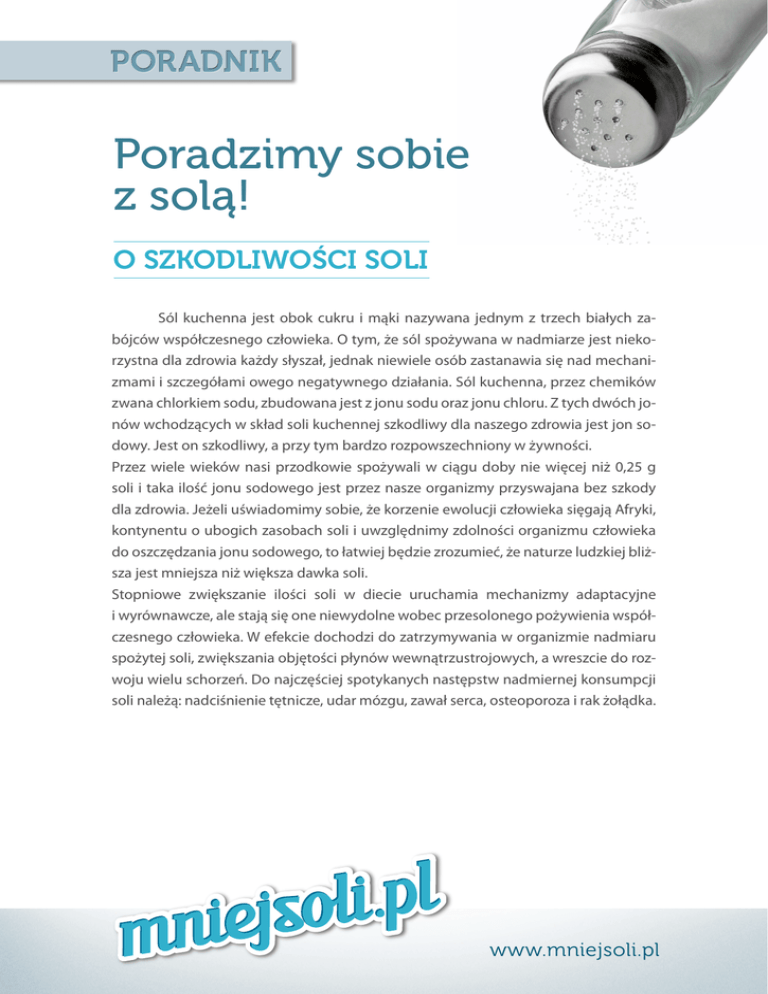 Poradzimy sobie z solą! O SZKODLIWOŚCI SOLI Sól kuchenna jest obok cukru i mąki nazywana jednym z trzech białych zabójców współczesnego człowieka. O tym, że sól spożywana w nadmiarze jest niekorzystna dla zdrowia każdy słyszał, jednak niewiele osób zastanawia się nad mechanizmami i szczegółami owego negatywnego działania. Sól kuchenna, przez chemików zwana chlorkiem sodu, zbudowana jest z jonu sodu oraz jonu chloru. Z tych dwóch jonów wchodzących w skład soli kuchennej szkodliwy dla naszego zdrowia jest jon sodowy. Jest on szkodliwy, a przy tym bardzo rozpowszechniony w żywności. Przez wiele wieków nasi przodkowie spożywali w ciągu doby nie więcej niż 0,25 g soli i taka ilość jonu sodowego jest przez nasze organizmy przyswajana bez szkody dla zdrowia. Jeżeli uświadomimy sobie, że korzenie ewolucji człowieka sięgają Afryki, kontynentu o ubogich zasobach soli i uwzględnimy zdolności organizmu człowieka do oszczędzania jonu sodowego, to łatwiej będzie zrozumieć, że naturze ludzkiej bliższa jest mniejsza niż większa dawka soli. Stopniowe zwiększanie ilości soli w diecie uruchamia mechanizmy adaptacyjne i wyrównawcze, ale stają się one niewydolne wobec przesolonego pożywienia współczesnego człowieka. W efekcie dochodzi do zatrzymywania w organizmie nadmiaru spożytej soli, zwiększania objętości płynów wewnątrzustrojowych, a wreszcie do rozwoju wielu schorzeń. Do najczęściej spotykanych następstw nadmiernej konsumpcji soli należą: nadciśnienie tętnicze, udar mózgu, zawał serca, osteoporoza i rak żołądka. www.mniejsoli.pl GDZIE SIĘ CZAI SÓL? Statystyczny Polak zjada każdego dnia 10-15 g soli. Jest to 2-3 razy więcej niż przewidują zalecenia Światowej Organizacji Zdrowia. Organizacja ta zaleca nieprzekraczanie 5 g soli dziennie; obejmuje to sól pochodzącą ze wszystkich źródeł – tę dodawaną do potraw, jak i znajdującą się w produktach. To co wysypujemy bezpośrednio z solniczki na spożywane potrawy i produkty stanowi około 40% puli jonu sodowego dostarczanego do organizmu współczesnego człowieka. Pozostałe 60% pochodzi z tzw. pozasolniczkowych źródeł sodu: około 25% z wędlin, 20% z pieczywa, 15% z pozostałych produktów spożywczych. Poza solą kuchenną jon sodowy jest częstym składnikiem środków konserwujących oznaczonych literą E. Do najczęściej spotykanych konserwantów należą: E211 – benzoesan sodu (konserwy rybne, napoje gazowane), E301 – askorbinian sodu (wędliny), E316 – izoaskorbinian sodu (wędliny), E325 – mleczan sodu (wędliny), E331 – cytrynian sodu (sery topione, konserwy rybne, napoje gazowane), E401 – alginian sodu (margaryny), E 452i – polifosforan sodu (wędliny), E621 – glutaminian sodu (zupy w proszku, przyprawy), E631 – inozynian sodu (zupy w proszku, przyprawy). Spotykając się z dwoma pojęciami sól i jon sodowy warto zapamiętać, że 1000 mg jonu sodowego odpowiada 2500 mg soli kuchennej. Jeśli więc na etykiecie spotkamy zawartość jonu sodowego wyrażoną w gramach, to aby przeliczyć ją na sól należy podaną liczbę pomnożyć przez 2,5. www.mniejsoli.pl SÓL W WIELKIM MIEŚCIE Tempo i wymagania współczesnego życia zmuszają nas do jedzenia poza domem, korzystania z restauracji oraz spożywania potraw, na przyrządzenie których nie mamy wpływu. Gotowy lunch w restauracji sieciowej zawiera od 1500 do 2200 mg jonu sodowego, co praktycznie wyczerpuje całodobową zalecaną ilość. A przecież na tym jednym posiłku nasz kontakt z solą się nie kończy. Panierki używane do pieczenia mięsa i ryb, sery przetworzone przemysłowo warzywa wchodzące w skład sałatek, przekąski z ryb morskich, ketchup, a nawet pozornie niewinne chipsy, które pogryzamy czekając na osobę, z którą mamy właśnie zjeść lunch w restauracji to prawdziwe bomby solne. Podobnie jest ze wszelkimi gotowymi sosami smakowymią, a nawet niektórymi wodami mineralnymi, które mają słony smak. Przyprawiaj, ale nie dosalaj! Sól w wielu daniach można zastąpić przyprawami, których dodanie poprawia walory smakowe. Podstawowa zasada jest taka, iż należy wybierać przyprawy jednoskładnikowe – jak pieprz, kminek, imbir, kolendra. Należy unikać przypraw wieloskładnikowych, ponieważ często w ich składzie są środki konserwujące zawierające jon sodowy. Na rynku dostępne są też preparaty tzw. soli niskosodowych, w których około 30% jonu sodowego zastępuje się jonem potasowym. Innym sposobem poprawienia smaku potraw bez użycia soli jest dodanie do nich świeżych ziół, jak na przykład posiekanych listków mięty, pietruszki, kolendry czy korzenia imbiru. Przyzwyczajenie się do nowego, mniej słonego smaku wcale nie jest trudne. Wiele osób bez odczuwalnej przykrości przestawia się na mniejszą ilość jonu sodowego w diecie. A korzyści z jej ograniczenia odnoszą ludzie w każdym wieku. Dzieci powinny zjadać mniej soli niż osoby dorosłe. Największe korzyści z ograniczenia spożywania soli czerpią kobiety po czterdziestce. Osoby starsze mogą mieć utrudnione rozpoznawanie smaku słonego, tym bardziej więc powinny zwracać uwagę na to, co jedzą. www.mniejsoli.pl JAK ZMNIEJSZYĆ DAWKĘ SOLI? 1. Zdejmij ze stołu, przy którym spożywasz posiłki solniczkę i schowaj ją w szafce kuchennej. 2. Jeżeli zjadasz śniadanie w domu, to do przygotowania kanapek nie używaj białego pieczywa, lecz wybierz chleb razowy. Zapomnij o bagietce, która ma najwięcej jonu sodowego ze wszystkich rodzajów pieczywa. Nie sięgaj też po różnego rodzaju produkty opatrzone nazwą pieczywa dietetycznego, bo ich długi termin ważności zapewniają substancje chemiczne zawierające jon sodowy. 3. Wybierając wędlinę na kanapkę pamiętaj, że im wędlina jest bardziej sucha, tym zawiera więcej jonu sodowego. 4. Wybierając ser na kanapkę, sięgnij raczej po biały niż żółty. 5. Do smaku dodaj świeży listek bazylii, nie używa