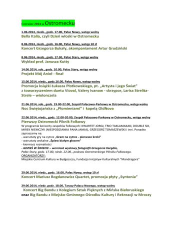 Czerwiec 2014 w Ostromecku 1.06.2014, niedz., godz. 17.00, Pałac Nowy, wstęp wolny Bella Italia, czyli Dzień włoski w Ostromecku 8.06.2014, niedz., godz. 16.00, Pałac Nowy, wstęp 10 zł Koncert Grzegorza Bukały, akompaniament Artur Grudziński 8.06.2014, niedz., godz. 17.30, Pałac Stary, wstęp wolny Wykład prof. Janusza Kutty 14.06.2014, sob., godz. 10.00, Pałac Stary, wstęp wolny Projekt Mój Anioł - finał 15.06.2014, niedz., godz.16.00, Pałac Nowy, wstęp wolny Promocja książki Łukasza Płotkowskiego, pt. „Artysta i jego Świat” z towarzyszeniem duetu Vioval, Valery Ivanow - skrzypce, Larisa StrelitaStrele – wiolonczela 21.06.2014, sob., godz. 19.00-22.00, Zespół Pałacowo-Parkowy w Ostromecku, wstęp wolny Noc Świętojańska z „Płomieniami” i kapelą OldNova 22.06.2014, niedz., godz. 12.00-20.00, Zespół Pałacowo-Parkowy w Ostromecku, wstęp wolny Pierwszy Ostromecki Piknik Folkowy W programie koncerty zespołów folkowych: KWARTET JORGI, TRIO TAKLAMAKAN, DOUBLE SIX, MIREK NIEMCZYK (NIESPODZIANKA PANA JANKA), GRZEGORZ TOMASZEWSKI i inni. Ponadto zapraszamy na: - warsztaty gry na cytrze „Gram na cytrze - pierwsze kroki" - warsztaty wokalne „Śpiew białym głosem” - kiermasz rozmaitości - GDZIEŚ W ŚWIECIE – wernisaż wystawy fotografii Grzegorza Kargóla, Pałac Stary, godz. 17.00, niedz. 22.06., podczas Ostromeckiego Pikniku Folkowego. ORGANIZATORZY: Miejskie Centrum Kultury w Bydgoszczy, Fundacja Inicjatyw Kulturalnych “Mandragora” 29.06.2014, niedz., godz. 16.00, Pałac Nowy, wstęp 10 zł Koncert Mariusz Bogdanowicz Quartet, promocja płyty „Syntonia” 29.06.2014, niedz. godz. 18.00, Tarasy Pałacu Nowego, wstęp wolny Koncert Big Bandu z Kolegium Sztuk Pięknych z Mińska Białoruskiego oraz Big Bandu z Miejsko-Gminnego Ośrodku Kultury i Rekreacji w Mroczy