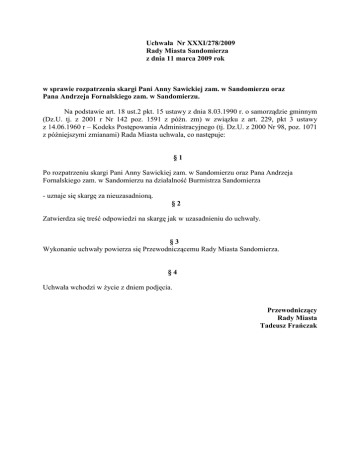 Uchwała Nr XXXI/278/2009 Rady Miasta Sandomierza z dnia 11 marca 2009 rok w sprawie rozpatrzenia skargi Pani Anny Sawickiej zam. w Sandomierzu oraz Pana Andrzeja Fornalskiego zam. w Sandomierzu. Na podstawie art. 18 ust.2 pkt. 15 ustawy z dnia 8.03.1990 r. o samorządzie gminnym (Dz.U. tj. z 2001 r Nr 142 poz. 1591 z późn. zm) w związku z art. 229, pkt 3 ustawy z 14.06.1960 r – Kodeks Postępowania Administracyjnego (tj. Dz.U. z 2000 Nr 98, poz. 1071 z późniejszymi zmianami) Rada Miasta uchwala, co następuje: §1 Po rozpatrzeniu skargi Pani Anny Sawickiej zam. w Sandomierzu oraz Pana Andrzeja Fornalskiego zam. w Sandomierzu na działalność Burmistrza Sandomierza - uznaje się skargę za nieuzasadnioną. §2 Zatwierdza się treść odpowiedzi na skargę jak w uzasadnieniu do uchwały. §3 Wykonanie uchwały powierza się Przewodniczącemu Rady Miasta Sandomierza. §4 Uchwała wchodzi w Ŝycie z dniem podjęcia. Przewodniczący Rady Miasta Tadeusz Frańczak Uzasadnienie Po przeprowadzeniu postępowania wyjaśniającego w sprawie skargi Pani Anny Sawickiej zam. w Sandomierzu oraz Pana Andrzeja Fornalskiego zam. w Sandomierzu na działalność Burmistrza Miasta Sandomierza i Gminy Sandomierz. dot. likwidacji zakazu ruchu i parkowania pojazdów w obrębie Starego Miasta w Sandomierzu ustalono Ŝe: Obowiązujący od dnia 01.05.2007 r. „Projekt stałej organizacji ruchu w obrębie Starego Miasta Sandomierza” obejmuje zabytkowy zespół urbanistyczno-architektoniczny Starego Miasta, który jako dobro kultury narodowej podlega ochronie prawnej. Projekt ten został wprowadzony w związku z przeznaczeniem ciągów komunikacyjnych ulic: Opatowska, Rynek i Mały Rynek dla ruchu pieszego ze względu na liczną rzeszę turystów odwiedzających nasze miasto, jak równieŜ w związku z przeprowadzoną analizą warunków geologiczno-inŜynierskich Wzgórza Sandomierskiego przez AGH w Krakowie, z której wynika, Ŝe nadmierny ruch samochodowy w obrębie Starego Miasta Sandomierza moŜe prowadzić do naruszenia stateczności jego masywu. Zgodnie art. 19 ust. 1 i ust. 2 pkt 4 ustawy z dnia 21 marca 1985r. o drogach publicznych ( tekst jednolity Dz. U. 2007 nr 19, poz. 115) kompetencje zarządcy drogi posiada Burmistrz Miasta Sandomierza. Ograniczenie ruchu pojazdów w rejonie w Starego Miasta Sandomierza zostało wprowadzone poprzez ustawienie m.in. znaków drogowych B-1 „zakaz ruchu w obu kierunkach” na podstawie „Projektu stałej organizacji ruchu w obrębie Starego Miasta Sandomierza”, który zgodnie z § 6 ust. 1 Rozporządzenia Ministra Infrastruktury z dnia 23 września 2003 r. w sprawie szczegółowych warunków zarządzania ruchem na drogach oraz wykonywania nadzoru nad tym zarządzaniem (Dz. U. z 2003 r. Nr 177, poz. 1729), został zatwierdzony do realizacji w dniu 04.04.2007 r. przez zarządzającego ruchem drogowym, tj. Zarząd Dróg Powiatowych w Sandomierzu, po uprzednim zaopiniowaniu przez Burmistrza Miasta Sandomierza i KPP w Sandomierzu. Ograniczenie wjazdu dla osób niepełnosprawnych zostało wprowadzone w związku z nie wyznaczeniem w „Projekcie stałej organizacji ruchu w obrębie Starego Miasta Sandomierza” parkingów na terenie objętym znakiem B-1 „zakaz ruchu w obu kierunkach”, za wyjątkiem wyznaczonego miejsca do parkowania przy ul. Sokolnickiego, które przeznaczone jest dla części mieszkańców Starego Miasta Sandomierza, tj. mieszkańców budynków ul. Opatowska 2, 4, 6, 8, ul. Rynek 11 i 13/14 oraz ul. Sokolnickiego 1. Obowiązujący przed znakiem drogowym B-1 „ zakaz ruchu w obu kierunkach” znak D-40 „strefa zamieszkania” informuje, Ŝe parkowanie moŜe odbywać się jedynie w miejscach do tego celu wyznaczonych, a związku z tym, Ŝe w/w znak drogowy nie figuruje w katalogu znaków, do których mogą się nie stosować osoby niepełnosprawne na podstawie § 33 ust. 2 Rozporządzenia Ministrów Infrastruktury oraz Spraw Wewnętrznych i Administracji z dnia 31 lipca 2002 r. w sprawie znaków i sygnałów drogowych ( Dz. U. z 2002 Nr 170, poz1393 z późn. zm.) oraz brakiem innych wyznaczonych miejsc parkingowych, wprowadzono ograniczenie wjazdu dla osób niepełnosprawnych (dopuszczenie wjazdu pojazdów osób niepełnosprawnych na w/w teren spowodowało by jedynie, iŜ osoby te będą mogły wjechać na teren Starego Miasta bez prawa do zaparkowania pojazdu). Ograniczenie to dotyczy tylko terenu przylegającego do ciągów ulic: Sokolnickiego, Mariacka, Opatowska, Rynek oraz Mały Rynek. Pozostały teren Starego Miasta jest ogólnodostępny, a jego specyfika oraz niewielka powierzchnia pozwala kaŜdemu obywatelowi zaparkować pojazd na wyznaczonych parkingach poza strefą objętą znakiem drogowym B-1, które zlokalizowane są w bliskiej odległości od wybranych miejsc i obiektów. Ponadto najwaŜniejsze urzędy, instytucje i inne obiekty uŜyteczności publicznej, w tym: Urząd Skarbowy, Urząd Miejski, Archiwum Państwowe, Bank Spółdzielczy, Przychodnie Zdrowia , Kuria Diecezjalna, itp. zlokalizowane są poza terenem objętym znakiem B-1 „ zakaz ruchu w obu kierunkach”, a dojazd do nich odbywa się od strony ul. Zamkowej lub ul. Katedralnej. UciąŜliwość dla osób zamieszkałych w ciągu budynków ul. Rynek 13/14 i Sokolnickiego 1 po zmianie organizacji ruchu polega na tym, iŜ parkowanie pojazdów odbywa się na wyznaczonym parkingu po drugiej stronie w/w ciągu budynków i wymaga od mieszkańców dodatkowego przejścia odległości od ok. 50m do 100m. Podobnie wygląda sprawa parkowania pojazdów przez mieszkańców budynków połoŜonych przy ul. Opatowska 2, 4, 6, 8, dla których został wyznaczony parking przy ul. śydowskiej, a uciąŜliwość polega równieŜ na oddaleniu wyznaczonego parkingu od ciągu budynków przy ul. Opatowskiej od ok. 50m do 100m. Zapis o obowiązku parkowania pojazdów na w/w parkingach zawarty jest Opisie Technicznym do „Projektu stałej organizacji ruchu w obrębie Starego Miasta Sandomierza