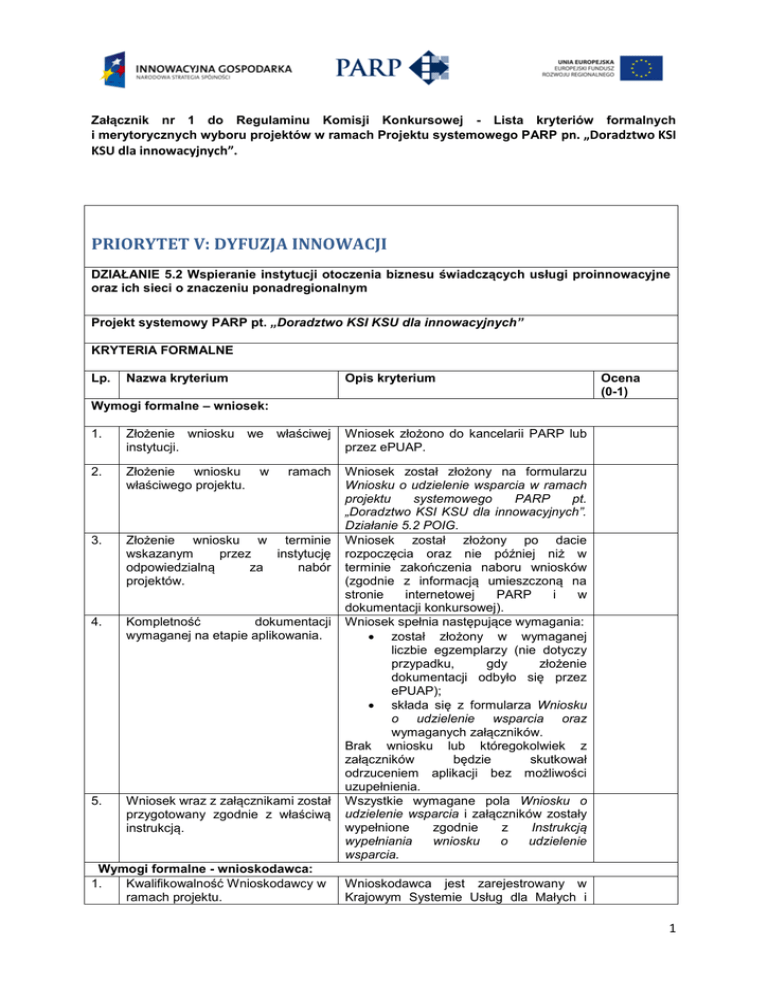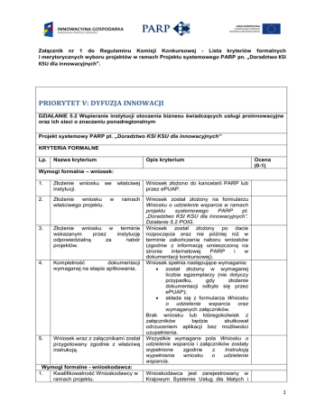 Załącznik nr 1 do Regulaminu Komisji Konkursowej - Lista kryteriów formalnych i merytorycznych wyboru projektów w ramach Projektu systemowego PARP pn. „Doradztwo KSI KSU dla innowacyjnych”. PRIORYTET V: DYFUZJA INNOWACJI DZIAŁANIE 5.2 Wspieranie instytucji otoczenia biznesu świadczących usługi proinnowacyjne oraz ich sieci o znaczeniu ponadregionalnym Projekt systemowy PARP pt. „Doradztwo KSI KSU dla innowacyjnych” KRYTERIA FORMALNE Lp. Nazwa kryterium Opis kryterium Ocena (0-1) Wymogi formalne – wniosek: 1. Złożenie wniosku we instytucji. 2. Złożenie wniosku właściwego projektu. 3. Złożenie wniosku w terminie wskazanym przez instytucję odpowiedzialną za nabór projektów. 4. Kompletność dokumentacji wymaganej na etapie aplikowania. 5. Wniosek wraz z załącznikami został przygotowany zgodnie z właściwą instrukcją. w właściwej Wniosek złożono do kancelarii PARP lub przez ePUAP. ramach Wniosek został złożony na formularzu Wniosku o udzielenie wsparcia w ramach projektu systemowego PARP pt. „Doradztwo KSI KSU dla innowacyjnych”. Działanie 5.2 POIG. Wniosek został złożony po dacie rozpoczęcia oraz nie później niż w terminie zakończenia naboru wniosków (zgodnie z informacją umieszczoną na stronie internetowej PARP i w dokumentacji konkursowej). Wniosek spełnia następujące wymagania: został złożony w wymaganej liczbie egzemplarzy (nie dotyczy przypadku, gdy złożenie dokumentacji odbyło się przez ePUAP); składa się z formularza Wniosku o udzielenie wsparcia oraz wymaganych załączników. Brak wniosku lub któregokolwiek z załączników będzie skutkował odrzuceniem aplikacji bez możliwości uzupełnienia. Wszystkie wymagane pola Wniosku o udzielenie wsparcia i załączników zostały wypełnione zgodnie z Instrukcją wypełniania wniosku o udzielenie wsparcia. Wymogi formalne - wnioskodawca: 1. Kwalifikowalność Wnioskodawcy w ramach projektu. Wnioskodawca jest zarejestrowany w Krajowym Systemie Usług dla Małych i 1 Załącznik nr 1 do Regulaminu Komisji Konkursowej - Lista kryteriów formalnych i merytorycznych wyboru projektów w ramach Projektu systemowego PARP pn. „Doradztwo KSI KSU dla innowacyjnych”. Średnich Przedsiębiorstw w zakresie usług doradczych o charakterze proinnowacyjnym, tj.: spełnia wymagania i poddaje się rygorom określonym w rozporządzeniu Ministra Gospodarki z dnia 24 maja 2011 r., w sprawie Krajowego Systemu Usług dla Małych i Średnich Przedsiębiorstw (Dz. U. Nr 112, poz. 656). 2. Wnioskodawca nie podlega wykluczeniu z ubiegania się o wsparcie na podstawie ustawy o finansach publicznych. Wnioskodawca nie podlega wykluczeniu z ubiegania się o wsparcie na podstawie art. 207 Ustawy z dnia 27 sierpnia 2009 r. o finansach publicznych (Dz. U. Nr 157, poz. 1240 z późn. zm.) Wnioskodawca nie podlega także wykluczeniu z ubiegania się o wsparcie na podstawie art. 211 ustawy z dnia 30 czerwca 2005 r. o finansach publicznych. Kryterium badane na oświadczenia wnioskodawcy. 3. Wnioskodawca nie podlega wykluczeniu z ubiegania się o dofinansowanie na podstawie ustawy z dnia 9 listopada 2000 r. o utworzeniu Polskiej Agencji Rozwoju Przedsiębiorczości. Wymogi formalne - projekt: 1. Projekt jest realizowany na terytorium Rzeczypospolitej Polskiej. 2. Realizacja projektu mieści się w ramach czasowych projektu. 3. Projekt jest zgodny z politykami horyzontalnymi wymienionymi w podstawie Przed podpisaniem umowy PARP zweryfikuje ponadto czy Wnioskodawca nie znajduje się w rejestrze podmiotów wykluczonych. Dokonywane jest sprawdzenie czy Wnioskodawca nie widnieje w wykazie PARP podmiotów niewywiązujących się ze zobowiązań (tj. wykluczonych z ubiegania się o wsparcie na podstawie ustawy z dnia 9 listopada 2000 r. o utworzeniu Polskiej Agencji Rozwoju Przedsiębiorczości (Dz. U. z 2007 r. Nr 42, poz. 275, z późn. zm.)). Wskazane we wniosku miejsce realizacji projektu znajduje się na terytorium Rzeczypospolitej Polskiej. Planowany termin realizacji projektu wskazany we wniosku jest zgodny z terminem określonym dla projektu w Wytycznych dla wnioskodawców ubiegających się o udzielenie wsparcia w ramach projektu systemowego pt. „Doradztwo KSI KSU dla innowacyjnych”, Działanie 5.2 POIG. Wnioskodawca zadeklarował, że projekt jest zgodny (ma co najmniej neutralny 2 Załącznik nr 1 do Regulaminu Komisji Konkursowej - Lista kryteriów formalnych i merytorycznych wyboru projektów w ramach Projektu systemowego PARP pn. „Doradztwo KSI KSU dla innowacyjnych”. art. 16 i 17 Rozporządzenia Rady (WE) nr 1083/2006. 4. Wnioskowana kwota wsparcia jest zgodna z zasadami finansowania projektu. 5. Założone w projekcie wielkości wskaźników produktu spełniają minimalne wymagania określone dla projektu. 6. Wnioskodawca zapewnia realizację projektu przez Zespół Konsultantów KSI KSU posiadających kompetencje niezbędne do świadczenia usług wpływ) z politykami horyzontalnymi horyzontalne UE wymienione w art. 16 i 17 Rozporządzenia Rady (WE) nr 1083/2006. Wnioskodawca właściwie wyliczył wnioskowaną kwotę wsparcia zgodnie z Wytycznymi dla wnioskodawców ubiegających się o udzielenie wsparcia: założone w projekcie maksymalne wartości wydatków kwalifikujących się do objęcia wsparciem na jedną usługę świadczoną na rzecz jednego przedsiębiorcy nie przekroczą – 13 000 zł dla jednego etapu I – audyt innowacyjności oraz 55 000 zł dla jednego etapu II – doradztwo we wdrożeniu innowacji; wnioskowana kwota wsparcia jest zgodna z intensywnością wparcia, o której mowa w § 39 ust. 5 i 6 rozporządzenia Ministra Rozwoju Regionalnego z dnia 2 kwietnia 2012 r. w sprawie udzielania przez Polską Agencję Rozwoju Przedsiębiorczości pomocy finansowej w ramach Programu Operacyjnego Innowacyjna Gospodarka, 2007-2013 (Dz. U. 2012 poz. 438 ) Projekt zakłada realizację: minimum 6 usług doradczych o charakterze proinnowacyjnym składających się z dwóch etapów 
