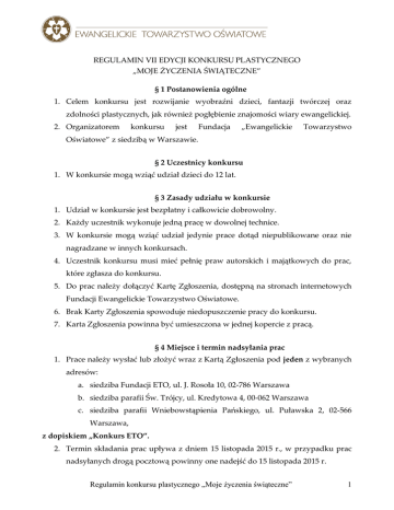 REGULAMIN VII EDYCJI KONKURSU PLASTYCZNEGO „MOJE ŻYCZENIA ŚWIĄTECZNE” § 1 Postanowienia ogólne 1. Celem konkursu jest rozwijanie wyobraźni dzieci, fantazji twórczej oraz zdolności plastycznych, jak również pogłębienie znajomości wiary ewangelickiej. 2. Organizatorem konkursu jest Fundacja „Ewangelickie Towarzystwo Oświatowe” z siedzibą w Warszawie. § 2 Uczestnicy konkursu 1. W konkursie mogą wziąć udział dzieci do 12 lat. § 3 Zasady udziału w konkursie 1. Udział w konkursie jest bezpłatny i całkowicie dobrowolny. 2. Każdy uczestnik wykonuje jedną pracę w dowolnej technice. 3. W konkursie mogą wziąć udział jedynie prace dotąd niepublikowane oraz nie nagradzane w innych konkursach. 4. Uczestnik konkursu musi mieć pełnię praw autorskich i majątkowych do prac, które zgłasza do konkursu. 5. Do prac należy dołączyć Kartę Zgłoszenia, dostępną na stronach internetowych Fundacji Ewangelickie Towarzystwo Oświatowe. 6. Brak Karty Zgłoszenia spowoduje niedopuszczenie pracy do konkursu. 7. Karta Zgłoszenia powinna być umieszczona w jednej kopercie z pracą. § 4 Miejsce i termin nadsyłania prac 1. Prace należy wysłać lub złożyć wraz z Kartą Zgłoszenia pod jeden z wybranych adresów: a. siedziba Fundacji ETO, ul. J. Rosoła 10, 02-786 Warszawa b. siedziba parafii Św. Trójcy, ul. Kredytowa 4, 00-062 Warszawa c. siedziba parafii Wniebowstąpienia Pańskiego, ul. Puławska 2, 02-566 Warszawa, z dopiskiem „Konkurs ETO”. 2. Termin składania prac upływa z dniem 15 listopada 2015 r., w przypadku prac nadsyłanych drogą pocztową powinny one nadejść do 15 listopada 2015 r. Regulamin konkursu plastycznego „Moje życzenia świąteczne” 1 3. Wyniki zostaną opublikowane na stronie internetowej Organizatora. Jednocześnie laureaci i osoby wyróżnione zostaną powiadomieni telefonicznie lub pisemnie o przyznaniu nagrody oraz o miejscu i terminie jej odbioru. Zawiadomienie zostanie skierowane na adres wskazany w Karcie Zgłoszenia. 4. Organizator nie bierze odpowiedzialności za ewentualne uszkodzenia lub zniszczenia źle zabezpieczonych prac. § 5 Jury 1. O wyłonieniu zwycięzców konkursu decyduje powołana w tym celu Komisja, w skład której wchodzą członkowie Rady oraz Zarządu Fundacji „Ewangelickie Towarzystwo Oświatowe”. 2. Konkurs zostanie rozstrzygnięty do dnia 15 grudnia 2015 roku. 3. Spośród zgłoszonych do konkursu prac Komisja wybierze jedną o największym walorze artystycznym oraz edukacyjnym. Komisja podejmuje decyzję o wyłonieniu zwycięzców większością głosów, każdy członek Komisji ma jeden głos. 4. Decyzja Komisji jest ostateczna i nieodwołalna. § 6 Nagrody i wyróżnienia 1. W konkursie zostanie przyznana nagroda dla laureata. 2. Nagrodą jest nagroda rzeczowa o wartości do 200 zł oraz paczka świąteczna. 3. Organizator zastrzega sobie możliwość nie przyznania nagrody głównej lub nie przyznania żadnych wyróżnień. § 7 Prawa autorskie 1. Przesłane prace przechodzą na własność Fundacji „Ewangelickie Towarzystwo Oświatowe” i nie będą odsyłane. 2. Organizator zastrzega sobie prawo do publikowania i reprodukowania prac oraz publicznego ich wystawiania bez wypłacania honorarium autorskiego, zgodnie z treścią oświadczeń złożonych przez uczestnika na Karcie Zgłoszenia. 3. Organizator nie ponosi żadnej odpowiedzialności prawnej z tytułu wad prawnych prac, a w razie skierowania przeciwko Organizatorowi roszczenia przez osobę trzecią ze względu na naruszenie jej praw autorskich, uczestnik konkursu zobowiązuje się ponosić cywilno-prawną odpowiedzialność. Regulamin konkursu plastycznego „Moje życzenia świąteczne” 2 4. Zgłoszenie prac do niniejszego konkursu jest równoznaczne z wyrażeniem zgody na ich wykorzystanie na następujących polach eksploatacji: a. w zakresie utrwalania i zwielokrotniania oraz modyfikowania utworu wytwarzanie egzemplarzy utworu, zapisywanie utworu techniką cyfrową, oraz prawo dostosowania utworu do formatu urządzeń mobilnych, a także w inny sposób, niezbędny dla udostępniania utworu w sieciach komputerowych i multimedialnych, w zakresie korzystania z utworu oraz kompilacji utworu z innymi utworami, b. w zakresie obrotu utworu albo egzemplarzami utworu, na których utwór utrwalono – wprowadzanie do obrotu, publiczne udostępnianie utworu w taki sposób, aby każdy mógł mieć do niego dostęp w miejscu i w czasie przez siebie wybranym, w szczególności za pośrednictwem internetu, sieci multimedialnych. § 8 Postanowienia końcowe 1. Fundacja „Ewangelickie Towarzystwo Oświatowe” zastrzega sobie prawo przerwania, zmiany lub przedłużenia Konkursu w razie wystąpienia przyczyn niezależnych. 2. Organizatorowi przysługuje prawo unieważnienia konkursu bez podania przyczyny. 3. Osoby, które nie spełnią któregokolwiek z wymogów określonych w niniejszym Regulaminie, podadzą nieprawdziwe informacje lub nie wyrażą zgody na oświadczenia nr 1 i nr 2 zamieszczone w Karcie Zgłoszenia, zostaną automatycznie wyłączone z Konkursu. 4. Przystąpienie uczestnika do Konkursu jest równoznaczne z akceptacją treści niniejszego Regulaminu. Regulamin konkursu plastycznego „Moje życzenia świąteczne” 3