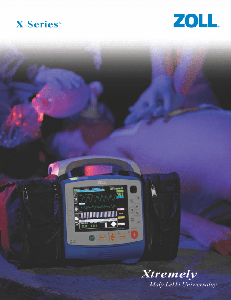 X Series TM Xtremely Mały Lekki Uniwersalny Zdumiewające Możliwości przy niskiej masie i małych wymiarach X Series: 66% Mniejszy Różnicę widać natychmiast. Defibrylator X SeriesTM jest inny niż pozostałe. Przy masie poniżej 6 kilogramów, jest o połowę mniejszy i lżejszy od innego w pełni wyposażonego defibrylatora, i ma znacznie większe możliwości. Ma wszystko, czego mógłbyś kiedykolwiek potrzebować w urządzeniu do bezpiecznej pracy. Zwarta konstrukcja bez kompromisu: w wielkości ekranu , potencjale lub wydajności. ZOLL X Series Oparty o rozwój programu dla potrzeb medycznych: wojska i lotnictwa , X Seria wyznacza nowe standardy wytrzymałości i trwałości, z niespotykaną funkcjonalnością . To łączy najwyższe klinicznie możliwości defibrylacji i stymulacji firmy ZOLL z zaawansowanym monitorowaniem pacjentów. X Series to też pierwszy defibrylator z zintegrowanym WiFi, jedną z trzech opcji połączeniowych. Inną unikalną cecha jest możliwość dzielenia ekranu, która pozwala oglądać EKG w czasie rzeczywistym, równocześnie oglądając zapamiętany 12 odprowadzeniowy zapis, lub jedną z pięciu oddzielnych stron 12 odprowadzeniowego zapisu EKG i wyników analizy. Dzięki wielkiemu, jasnemu, kontrastowemu ekranowi LCD o przeciwstawnych kolorach, z trzema trybami wyświetlania, wszystkie monitorowane parametry są wyraźnie widoczne, niezależnie od oświetlenia zewnętrznego. Dodatkowy ekran dużymi cyframi to jedna z wielu opcji wyświetlania. Akumulator litowo-jonowy zapewnia 6h ciągłej pracy, bez wymiany i konieczności przenoszenia akumulatorów zapasowych. Inny defibrylator X Series: 42% Lżejszy X Se es ZOLL X Series Inny Defibrylator X Series: Duży ekran - Małe wymiary ZOLL X Series Inny Defibrylator Idealny ekran dla ratownictwa X Series Wyświetla do czterech wybranych krzywych i równocześnie 12 odprowadzeń EKG. Monitoruje i wyświetla parametry RKO. Wszystkie informacje może wyświetlać w trybie czarno-białym, kolorowym lub nocnym. Wskaźnik alarmów Gniazdo SpO2 Masimo®rainbow® SET Pulse COOximetry Gniazdo NIBP Welch Allyn with Sure BP® and SmartCuf® Gniazdo kapnometru Oridion Microstream® Przyciski szybkiego dostępu Akumulator litowo-jonowy Wskaźnik WiFi Wskaźnik wyniku testu sprawności Ekran wyświetlania 12 odprowadzeń EKG bieżących i zapamiętanych lub wyniki analizy w czasie rzeczywistym i jednoczesne EKG. Ekran 4 krzywych Jednoczesne wyświetlanie do czterech krzywych, wybranych z EKG, SpO2, EtCO2, IBP, CPR, lub kaskada EKG. Przycisk trybu wyświetlania ekranu Przycisk rejestrowania 24 sekundowych danych liczbowych i krzywej (Snapshot) Ekran saturacji Masimo®rainbow® SET SpO2/SpCO®/SpMet® zapewnia dokładne pomiary saturacji, tlenku węgla i methemoglobiny. Podłączone elektrody CPR Statpadz® do monitorowania, stymulacji, defibrylacji i monitorowania RKO Ekran monitorowania CPR Wyświetla parametry CPR w czasie rzeczywistym Więcej danych, Więcej opcji Pierwszy defibrylator z wbudowanym WiFi, Bluetooth ,® USB i modem. Niezwykle Wszechstronny Zaawansowana Funkcjonalność, Lepsze Połączenia Niezrównana niezawodność Ze względu na swoje przeznaczenie dla służb medycznych w wojsku i transportu powietrznego, Seria X to pierwszy defibrylator dla ratownictwa o stopniu ochrony przed pyłem i woda IP55. Spełnia najbardziej rygorystyczne wymagania odporności na wstrząsy i wibracje. Seria X opcjonalnie może posiadać trzy ciśnienia inwazyjne oraz dwie temperatury, często potrzebne w intensywnej terapii . CPR z ufnością Kiedy dojdzie do resuscytacji defibrylator pomoże polepszyć jakość CPR przez wyświetlanie danych w czasie rzeczywistym, jednocześnie wskazuje jak osiągnąć CPR zgodny z wytycznymi. Zarządzanie STEMI Dla pacjentów ze STEMI, X przyspiesza ich przyjęcie na oddział hemodynamiki, poprzez szybką, dokładną interpretację i transmisję 12 odprowadzeniowego EKG. Drukarka zapewnia standardowy format wydruku 12 odprowadzeniowego EKG, ułatwiając przegląd na miejscu. Programy RescueNet ® oraz RescueNet Medgate obsługują odbiór 12 odprowadzeń w szpitalu. Lepszy pomiar ciśnienia Innowacyjna Technologia NIBP Sure BP® i Smartcuf ® jest uważana za złoty standard pomiaru ciśnienia. Dostępna jest tylko w defibrylatorze Xseries.. Z Sure BP®, otrzymasz wyniki pomiaru ciśnienia w około 15 sekund, ponieważ jest dokonywany podczas napełniania mankietu. Smartcuf synchronizuje pomiar załamkiem R, co poprawia dokładność i niezawodność. Niezrównane możliwości zbierania i transmisji danych Seria X jest zaprojektowane do natychmiastowej komunikacji z RescueNet System Link, który zbiera wszystkie dane systemu ratownictwa, umożliwiając komunikację między ratownikami i szpitalem oraz zapewnienie podgląd na każdym etapie rozmowy w dowolnym miejscu w systemie. To pierwszy defibrylator posiadający jednocześnie zintegrowane WiFi, Bluetooth, USB do obsługi danych. Dane strumieniowe można przesyłać na adres szpitali lub innych odległych miejsc. Funkcja Snapshot, pozwala zapamiętać rzeczywistą krzywą EKG i ważne dane trendu 12 sekund przed zdarzeniem i 12 sekund po zdarzeniu po naciśnięciu przycisku. Seria X ma wystarczającej ilości pamięci do przechowywania danych, zapamiętuje 32 Snapshoty, 24 godzinne zdarzenia lub trendy w odstępach jednominutowych i 1000 znaczników zdarzeń. Zarządzanie akumulatorami SurePower System– Kompleksowe, automatyczne ładowanie baterii, testowanie i dokumentacja sprawności . Obsługuje baterie X Serii i E Serii®. Wyłączny Dystrybutor w Polsce na rynek szpitalny: Lifemed Poland Sp.z o.o. ul. Cybernetyki 19b 02-677 Warszawa Tel. 0 22 862 83 75/76 ZOLL Medical Corporation develops and markets medical devices and software solutions that help advance emergency care and save lives, while increasing clinical and operational efficiencies. With products for defibrillation and monitoring, circulation and CPR feedback, da