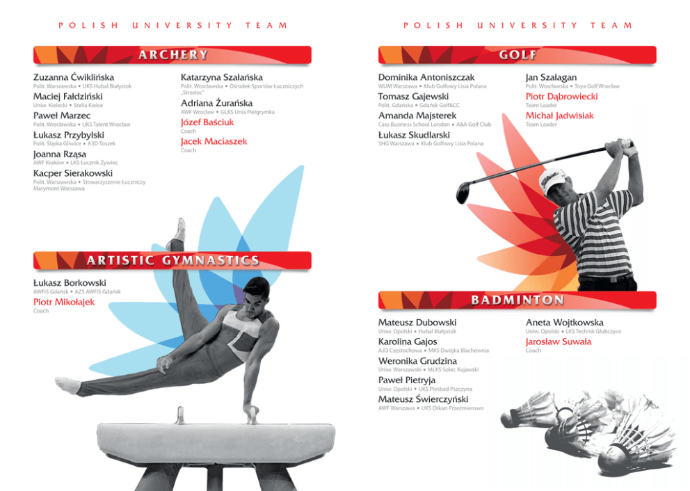 P O L I S H U N I V E R S I T Y T E A M P O L I S H U N I V E R S I T Y ARCHERY T E A M GOLF Zuzanna Ćwiklińska Katarzyna Szałańska Dominika Antoniszczak Jan Szałagan Polit. WarszawskaUKS Hubal Białystok Polit. WrocławskaOśrodek Sportów Łuczniczych „Strzelec” WUM WarszawaKlub Golfowy Lisia Polana Polit. WrocławskaToya Golf Wrocław Tomasz Gajewski Piotr Dąbrowiecki Polit. GdańskaGdańsk Golf&CC Team Leader Amanda Majsterek Michał Jadwisiak Cass Business School LondonA&A Golf Club Team Leader Maciej Fałdziński Uniw. KieleckiStella Kielce Paweł Marzec Polit. WrocławskaUKS Talent Wrocław Łukasz Przybylski Polit. Śląska GliwiceA3D Toszek Adriana Żurańska AWF WrocławGLKS Unia Pielgrymka Józef Baściuk Coach Jacek Maciaszek Łukasz Skudlarski SHG WarszawaKlub Golfowy Lisia Polana Coach Joanna Rząsa AWF KrakówLKS Łucznik Żywiec Kacper Sierakowski Polit. WarszawskaStowarzyszenie Łuczniczy Marymont Warszawa ARTISTIC GYMNASTICS Łukasz Borkowski AWFiS GdańskAZS AWFiS Gdańsk BADMINTON Piotr Mikołajek Coach Mateusz Dubowski Aneta Wojtkowska Uniw. OpolskiHubal Białystok Uniw. OpolskiLKS Technik Głubczyce Karolina Gajos Jarosław Suwała AJD CzęstochowaMKS Dwójka Blachownia Coach Weronika Grudzina Uniw. WarszawskiMLKS Solec Kujawski Paweł Pietryja Uniw. OpolskiUKS Plesbad Pszczyna Mateusz Świerczyński AWF WarszawaUKS Orkan Przeźmierowo