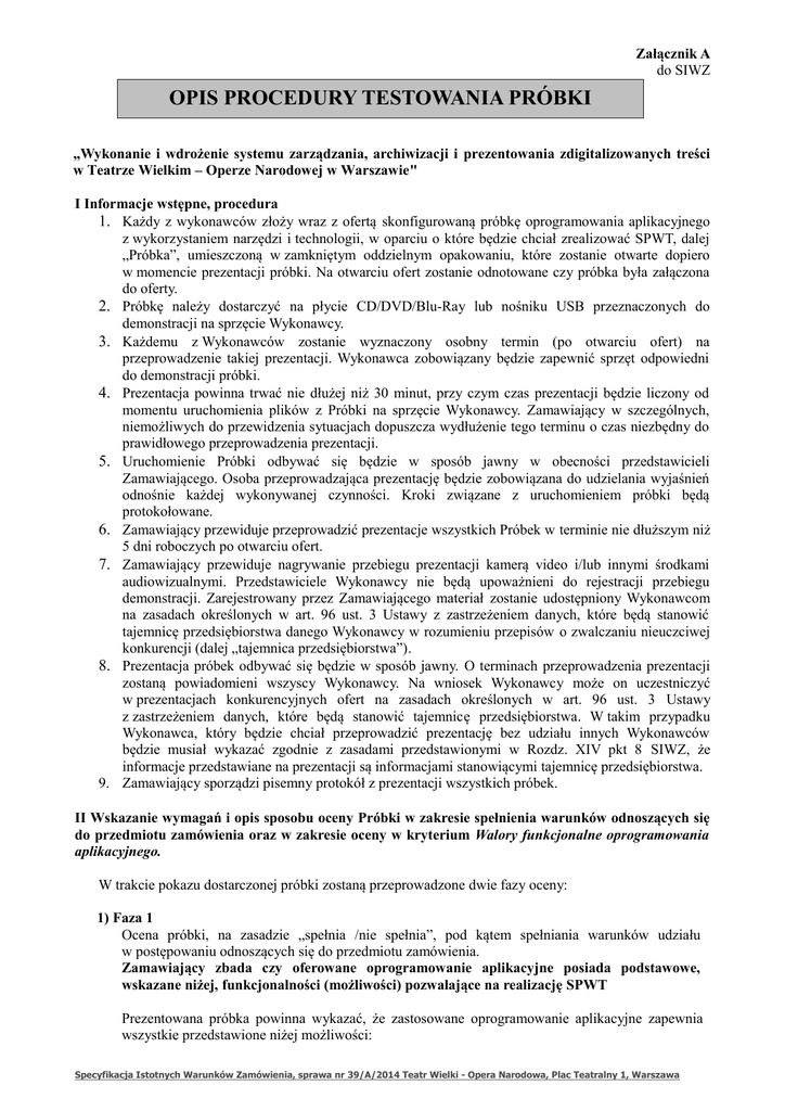 Załącznik A do SIWZ OPIS PROCEDURY TESTOWANIA PRÓBKI „Wykonanie i wdrożenie systemu zarządzania, archiwizacji i prezentowania zdigitalizowanych treści w Teatrze Wielkim – Operze Narodowej w Warszawie" I Informacje wstępne, procedura 1. Każdy z wykonawców złoży wraz z ofertą skonfigurowaną próbkę oprogramowania aplikacyjnego z wykorzystaniem narzędzi i technologii, w oparciu o które będzie chciał zrealizować SPWT, dalej „Próbka”, umieszczoną w zamkniętym oddzielnym opakowaniu, które zostanie otwarte dopiero w momencie prezentacji próbki. Na otwarciu ofert zostanie odnotowane czy próbka była załączona do oferty. 2. Próbkę należy dostarczyć na płycie CD/DVD/Blu-Ray lub nośniku USB przeznaczonych do demonstracji na sprzęcie Wykonawcy. 3. Każdemu z Wykonawców zostanie wyznaczony osobny termin (po otwarciu ofert) na przeprowadzenie takiej prezentacji. Wykonawca zobowiązany będzie zapewnić sprzęt odpowiedni do demonstracji próbki. 4. Prezentacja powinna trwać nie dłużej niż 30 minut, przy czym czas prezentacji będzie liczony od momentu uruchomienia plików z Próbki na sprzęcie Wykonawcy. Zamawiający w szczególnych, niemożliwych do przewidzenia sytuacjach dopuszcza wydłużenie tego terminu o czas niezbędny do prawidłowego przeprowadzenia prezentacji. 5. Uruchomienie Próbki odbywać się będzie w sposób jawny w obecności przedstawicieli Zamawiającego. Osoba przeprowadzająca prezentację będzie zobowiązana do udzielania wyjaśnień odnośnie każdej wykonywanej czynności. Kroki związane z uruchomieniem próbki będą protokołowane. 6. Zamawiający przewiduje przeprowadzić prezentacje wszystkich Próbek w terminie nie dłuższym niż 5 dni roboczych po otwarciu ofert. 7. Zamawiający przewiduje nagrywanie przebiegu prezentacji kamerą video i/lub innymi środkami audiowizualnymi. Przedstawiciele Wykonawcy nie będą upoważnieni do rejestracji przebiegu demonstracji. Zarejestrowany przez Zamawiającego materiał zostanie udostępniony Wykonawcom na zasadach określonych w art. 96 ust. 3 Ustawy z zastrzeżeniem danych, które będą stanowić tajemnicę przedsiębiorstwa danego Wykonawcy w rozumieniu przepisów o zwalczaniu nieuczciwej konkurencji (dalej „tajemnica przedsiębiorstwa”). 8. Prezentacja próbek odbywać się będzie w sposób jawny. O terminach przeprowadzenia prezentacji zostaną powiadomieni wszyscy Wykonawcy. Na wniosek Wykonawcy może on uczestniczyć w prezentacjach konkurencyjnych ofert na zasadach określonych w art. 96 ust. 3 Ustawy z zastrzeżeniem danych, które będą stanowić tajemnicę przedsiębiorstwa. W takim przypadku Wykonawca, który będzie chciał przeprowadzić prezentację bez udziału innych Wykonawców będzie musiał wykazać zgodnie z zasadami przedstawionymi w Rozdz. XIV pkt 8 SIWZ, że informacje przedstawiane na prezentacji są informacjami stanowiącymi tajemnicę przedsiębiorstwa. 9. Zamawiający sporządzi pisemny protokół z prezentacji wszystkich próbek. II Wskazanie wymagań i opis sposobu oceny Próbki w zakresie spełnienia warunków odnoszących się do przedmiotu zamówienia oraz w zakresie oceny w kryterium Walory funkcjonalne oprogramowania aplikacyjnego. W trakcie pokazu dostarczonej próbki zostaną przeprowadzone dwie fazy oceny: 1) Faza 1 Ocena próbki, na zasadzie „spełnia /nie spełnia”, pod kątem spełniania warunków udziału w postępowaniu odnoszących się do przedmiotu zamówienia. Zamawiający zbada czy oferowane oprogramowanie aplikacyjne posiada podstawowe, wskazane niżej, funkcjonalności (możliwości) pozwalające na realizację SPWT Prezentowana próbka powinna wykazać, że zastosowane oprogramowanie aplikacyjne zapewnia wszystkie przedstawione niżej możliwości: Specyfikacja Istotnych Warunków Zamówienia, sprawa nr 39/A/2014 Teatr Wielki - Opera Narodowa, Plac Teatralny 1, Warszawa 1. Możliwość zastosowania narzędzi Wykonawcy do implementacji zasobów Bazy Wiedzy Zamawiającego zgodnie ze szczegółowym opisem przygotowania próbki i prezentacji przedstawionym poniżej w części III. 2. Możliwość edycji danych w formularzach dostosowanych do struktury bazy Zamawiającego. 3. Możliwość nawigacji po strukturze danych. 4. Możliwość wyświetlania zdigitalizowanych plików w warstwie prezentacyjnej i automatycznego generowania wersji pochodnych (np. miniatury, wersje lekkie). 5. Możliwość przypisania atrybutów (metadanych) do pliku graficznego w klasie Multimedia. 6. Możliwość zarządzania uprawnieniami użytkowników w modelu list kontroli dostępu lub analogicznym. 7. Możliwość wersjonowania dokumentów i metadanych. 8. Możliwość ukrywania wybranych pól formularza. W przypadku, gdy chociaż jedna możliwość nie będzie występować oferta będzie podlegać odrzuceniu. Wykonawca, którego oferta zostanie wybrana jako najkorzystniejsza zobowiązany będzie w ciągu 7 dni od dnia zawiadomienia o wyborze oferty uzupełnić prezentację Próbki w Fazie 1) w zakresie wykazania, że oferowane oprogramowanie aplikacyjne zapewni możliwość jego zastosowania do makiet Portalu informacyjnego Zamawiającego. Szczegóły takiej prezentacji podane są poniżej w części III pkt 4 krok „6”. Przez uzupełnienie prezentacji Próbki rozumie się dostarczenie Próbki w zakresie kroku „6” zgodnie z procedurą określoną powyżej w cz. I w pkt 2 i 3 zdanie drugie oraz przeprowadzenie prezentacji, której termin zostanie uzgodniony w trybie roboczym z Zamawiającym. 2) Faza 2 Ocena próbki w kryterium Walory funkcjonalne oprogramowania aplikacyjnego W wyniku tej oceny Wykonawca może otrzymać maksymalnie 30 punktów. Przy ocenie brane będą pod uwagę następujące funkcjonalności: 1. Funkcjonalności edytowania formularzy w zakresie zmiany kolejności pól, układu pól przez użytkownika – max 10 pkt - Możliwość zarówno zmiany pozycji na liście pól w formularzu (1) jak i umiejscowienia pola w dowolnym