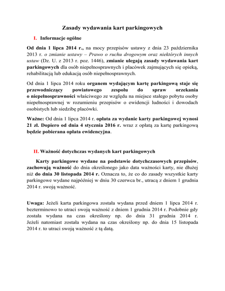 Zasady wydawania kart parkingowych I. Informacje ogólne Od dnia 1 lipca 2014 r., na mocy przepisów ustawy z dnia 23 października 2013 r. o zmianie ustawy – Prawo o ruchu drogowym oraz niektórych innych ustaw (Dz. U. z 2013 r. poz. 1446), zmianie ulegają zasady wydawania kart parkingowych dla osób niepełnosprawnych i placówek zajmujących się opieką, rehabilitacją lub edukacją osób niepełnosprawnych. Od dnia 1 lipca 2014 roku organem wydającym kartę parkingową staje się przewodniczący powiatowego zespołu do spraw orzekania o niepełnosprawności właściwego ze względu na miejsce stałego pobytu osoby niepełnosprawnej w rozumieniu przepisów o ewidencji ludności i dowodach osobistych lub siedzibę placówki. Ważne: Od dnia 1 lipca 2014 r. opłata za wydanie karty parkingowej wynosi 21 zł. Dopiero od dnia 4 stycznia 2016 r. wraz z opłatą za kartę parkingową będzie pobierana opłata ewidencyjna. II. Ważność dotychczas wydanych kart parkingowych Karty parkingowe wydane na podstawie dotychczasowych przepisów, zachowują ważność do dnia określonego jako data ważności karty, nie dłużej niż do dnia 30 listopada 2014 r. Oznacza to, że co do zasady wszystkie karty parkingowe wydane najpóźniej w dniu 30 czerwca br., utracą z dniem 1 grudnia 2014 r. swoją ważność. Uwaga: Jeżeli karta parkingowa została wydana przed dniem 1 lipca 2014 r. bezterminowo to utraci swoją ważność z dniem 1 grudnia 2014 r. Podobnie gdy została wydana na czas określony np. do dnia 31 grudnia 2014 r. Jeżeli natomiast została wydana na czas określony np. do dnia 15 listopada 2014 r. to utraci swoją ważność z tą datą. III. Karta parkingowa dla osoby niepełnosprawnej Od dnia 1 lipca 2014 r. karta parkingowa będzie wydawana wyłącznie: 1) osobie niepełnosprawnej zaliczonej do znacznego albo umiarkowanego stopnia niepełnosprawności mającej znacznie ograniczone możliwości samodzielnego poruszania się; 2) osobie niepełnosprawnej, która nie ukończyła 16 roku życia mającej znacznie ograniczone możliwości samodzielnego poruszania się; Ważne: Od dnia 1 lipca 2014 r. osoba niepełnosprawna zaliczona do lekkiego stopnia niepełnosprawności nie jest uprawniona do uzyskania karty parkingowej. Jeżeli jednak posiada kartę parkingową wydaną przed tą datą to jej karta zachowuje ważność do dnia określonego jako data ważności karty, nie dłużej niż do dnia 30 listopada 2014 r. Osoby niepełnosprawne w stopniu znacznym od dnia 1 lipca 2014 r. uzyskają kartę parkingową na podstawie wydanego od dnia 1 lipca 2014 r. orzeczenia o stopniu niepełnosprawności albo orzeczenia o wskazaniach do ulg i uprawnień, zawierającego wskazanie w zakresie karty parkingowej. Ważne: Wskazanie do karty parkingowej w orzeczeniu o znacznym stopniu niepełnosprawności nie jest uzależnione od symbolu przyczyny niepełnosprawności ale wyłącznie od tego, że osoba niepełnosprawna ma znacznie ograniczone możliwości samodzielnego poruszania się. Uwaga: Zaliczenie do znacznego stopnia niepełnosprawności nie jest tożsame z posiadaniem znacznych ograniczeń w możliwości samodzielnego poruszania się. Wyjątek: Ustawodawca przewidział odstępstwo od zasady, zgodnie z którą karta parkingowa od dnia 1 lipca 2014 r. przysługuje na podstawie orzeczenia o znacznym stopniu niepełnosprawności wydawanego także od 1 lipca 2014 r. Wyjątek dotyczy osób niepełnosprawnych w stopniu znacznym, które posiadają orzeczenia wydane przed 1 lipca 2014 r. wraz z symbolem przyczyny niepełnosprawności 04-O (choroby narządu wzroku), 05-R (upośledzenie narządu ruchu) lub 10-N (choroba neurologiczna). Osoby posiadające tego rodzaju orzeczenia uzyskają kartę parkingową bez konieczności ponownego orzekania się - na podstawie dotychczasowego orzeczenia, jeżeli zawiera ono wskazanie do karty parkingowej. Osoby niepełnosprawne w stopniu umiarkowanym od dnia 1 lipca 2014 r. uzyskają kartę parkingową na podstawie wydanego od dnia 1 lipca 2014 r. orzeczenia o stopniu niepełnosprawności albo orzeczenia o wskazaniach do ulg i uprawnień, zawierającego wskazanie w zakresie karty parkingowej. Ważne: Wskazanie do karty parkingowej w orzeczeniu o umiarkowanym stopniu niepełnosprawności jest uzależnione od symbolu przyczyny niepełnosprawności i tego, że osoba niepełnosprawna ma znacznie ograniczone możliwości samodzielnego poruszania się. Uwaga: Wskazanie do karty parkingowej będą mogły uzyskać wyłącznie osoby mające zarówno znacznie ograniczone możliwości samodzielnego poruszania się jak i przyczynę niepełnosprawności oznaczoną symbolem 04-O (choroby narządu wzroku), 05-R (upośledzenie narządu ruchu) lub 10-N (choroba neurologiczna). Osoby niepełnosprawne, które nie ukończyły 16 roku życia od dnia 1 lipca 2014 r. uzyskają kartę parkingową na podstawie wydanego od dnia 1 lipca 2014 r. orzeczenia o niepełnosprawności zawierającego wskazanie w zakresie karty parkingowej. Uwaga: W przypadku tych osób wskazanie do karty parkingowej nie jest uzależnione od symbolu przyczyny niepełnosprawności ale wyłącznie od tego, że dziecko ma znacznie ograniczone możliwości samodzielnego poruszania się, co ustala się uwzględniając m.in. wiek dziecka. Jeżeli zatem to wiek dziecka w chwili orzekania powoduje, że ma ono trudności w poruszaniu się, nie uzyska ono wskazania do karty parkingowej. Od dnia 1 lipca 2014 r. karta parkingowa wydawana jest wyłącznie na czas określony. Karta parkingowa wydawana jest na okres ważności orzeczenia jednak nie dłużej niż na okres 5 lat. Uwaga: Jeżeli orzeczenie uprawniające do karty parkingowej zostało wydane na czas nieokreślony (bezterminowo) albo na okres dłuższy niż 5 lat to i tak karta parkingowa zostanie wydana wyłącznie na okres 5 lat od dnia jej wydania. Jeżeli orzeczenie po dniu 1 lipca zostanie wydane na czas nieokreślony to karta parkingowa straci swoją ważność po 