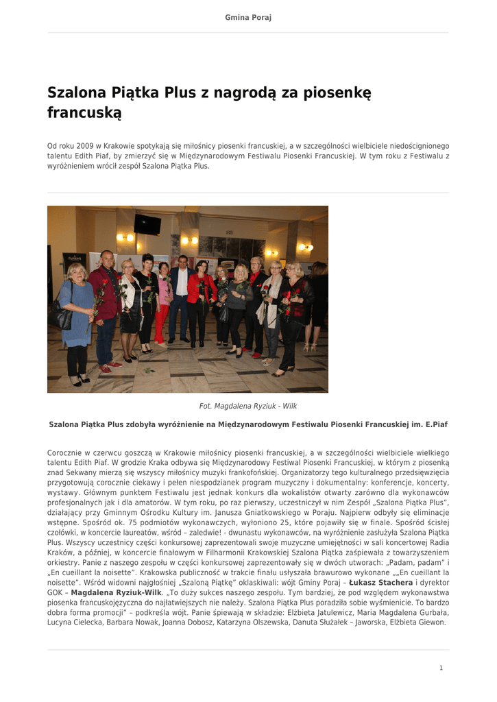 Gmina Poraj Szalona Piątka Plus z nagrodą za piosenkę francuską Od roku 2009 w Krakowie spotykają się miłośnicy piosenki francuskiej, a w szczególności wielbiciele niedoścignionego talentu Edith Piaf, by zmierzyć się w Międzynarodowym Festiwalu Piosenki Francuskiej. W tym roku z Festiwalu z wyróżnieniem wrócił zespół Szalona Piątka Plus. Fot. Magdalena Ryziuk - Wilk Szalona Piątka Plus zdobyła wyróżnienie na Międzynarodowym Festiwalu Piosenki Francuskiej im. E.Piaf Corocznie w czerwcu goszczą w Krakowie miłośnicy piosenki francuskiej, a w szczególności wielbiciele wielkiego talentu Edith Piaf. W grodzie Kraka odbywa się Międzynarodowy Festiwal Piosenki Francuskiej, w którym z piosenką znad Sekwany mierzą się wszyscy miłośnicy muzyki frankofońskiej. Organizatorzy tego kulturalnego przedsięwzięcia przygotowują corocznie ciekawy i pełen niespodzianek program muzyczny i dokumentalny: konferencje, koncerty, wystawy. Głównym punktem Festiwalu jest jednak konkurs dla wokalistów otwarty zarówno dla wykonawców profesjonalnych jak i dla amatorów. W tym roku, po raz pierwszy, uczestniczył w nim Zespół „Szalona Piątka Plus”, działający przy Gminnym Ośrodku Kultury im. Janusza Gniatkowskiego w Poraju. Najpierw odbyły się eliminacje wstępne. Spośród ok. 75 podmiotów wykonawczych, wyłoniono 25, które pojawiły się w finale. Spośród ścisłej czołówki, w koncercie laureatów, wśród – zaledwie! - dwunastu wykonawców, na wyróżnienie zasłużyła Szalona Piątka Plus. Wszyscy uczestnicy części konkursowej zaprezentowali swoje muzyczne umiejętności w sali koncertowej Radia Kraków, a później, w koncercie finałowym w Filharmonii Krakowskiej Szalona Piątka zaśpiewała z towarzyszeniem orkiestry. Panie z naszego zespołu w części konkursowej zaprezentowały się w dwóch utworach: „Padam, padam” i „En cueillant la noisette”. Krakowska publiczność w trakcie finału usłyszała brawurowo wykonane „„En cueillant la noisette”. Wśród widowni najgłośniej „Szaloną Piątkę” oklaskiwali: wójt Gminy Poraj – Łukasz Stachera i dyrektor GOK – Magdalena Ryziuk-Wilk. „To duży sukces naszego zespołu. Tym bardziej, że pod względem wykonawstwa piosenka francuskojęzyczna do najłatwiejszych nie należy. Szalona Piątka Plus poradziła sobie wyśmienicie. To bardzo dobra forma promocji” – podkreśla wójt. Panie śpiewają w składzie: Elżbieta Jatulewicz, Maria Magdalena Gurbała, Lucyna Cielecka, Barbara Nowak, Joanna Dobosz, Katarzyna Olszewska, Danuta Służałek – Jaworska, Elżbieta Giewon. 1