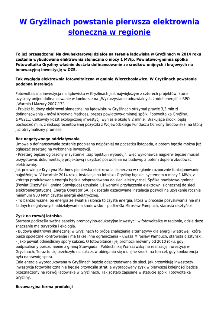 W Gryźlinach powstanie pierwsza elektrownia słoneczna w regionie To już przesądzone! Na dwuhektarowej działce na terenie lądowiska w Gryźlinach w 2014 roku zostanie wybudowana elektrownia słoneczna o mocy 1 MWp. Powiatowo-gminna spółka Fotowoltaika Gryźliny właśnie dostała dofinansowanie ze środków unijnych i krajowych na innowacyjną inwestycję w OZE. Tak wygląda elektrownia fotowoltaiczna w gminie Wierzchosławice. W Gryźlinach powstanie podobna instalacja Fotowoltaiczna inwestycja na lądowisku w Gryźlinach jest największym z czterech projektów, które uzyskały unijne dofinansowanie w konkursie na „Wykorzystanie odnawialnych źródeł energii” z RPO „Warmia i Mazury 2007-13”. - Projekt budowy elektrowni słonecznej na lądowisku w Gryźlinach otrzymał prawie 3,3 mln zł dofinansowania – mówi Krystyna Mathoes, prezes powiatowo-gminnej spółki Fotowoltaika Gryźliny. – Całkowity koszt ekologicznej inwestycji wyniesie około 8,2 mln zł. Brakujące środki będą pochodzić m.in. z niskooprocentowanej pożyczki z Wojewódzkiego Funduszu Ochrony Środowiska, na którą już otrzymaliśmy promesę. Bez negatywnego oddziaływania Umowa o dofinansowanie zostanie podpisana najpóźniej na początku listopada, a potem będzie można już ogłaszać przetarg na wykonanie inwestycji. - Przetarg będzie ogłoszony w systemie „zaprojektuj i wybuduj”, więc wykonawca najpierw będzie musiał przygotować dokumentację projektową i uzyskać pozwolenia na budowę, a potem dopiero zbudować elektrownię. Jak przewiduje Krystyna Mathoes pionierska elektrownia słoneczna w regionie rozpocznie funkcjonowanie najpóźniej w IV kwartale 2014 roku. Instalacja na lotnisku Gryźliny będzie systemem o mocy 1 MWp, z którego produkowana energia będzie odsprzedawana do sieci elektrycznej. Spółka powiatowo-gminna (Powiat Olsztyński i gmina Stawiguda) uzyskała już warunki przyłączenia elektrowni słonecznej do sieci elektroenergetycznej Energa Operator SA. Jak zostało oszacowane instalacja pozwoli na uzyskanie rocznie minimum 900 MWh czystej energii elektrycznej. - To bardzo ważne, bo energia ze światła i słońca to czysta energia, która w procesie pozyskiwania nie ma żadnych negatywnych oddziaływań na środowisko – podkreśla Mirosław Pampuch, starosta olsztyński. Zysk na rozwój lotniska Starosta podkreśla ważne aspekty promocyjno-edukacyjne inwestycji w fotowoltaikę w regionie, gdzie duże znaczenie ma turystyka i ekologia. - Budowa elektrowni słonecznej w Gryźlinach to próba znalezienia alternatywy dla energii wiatrowej, która budzi społeczne kontrowersje i ma także inne ograniczenia – uważa Mirosław Pampuch, starosta olsztyński. – Jako powiat odnieśliśmy spory sukces. O fotowoltaice i jej promocji mówimy od 2010 roku, gdy podpisaliśmy porozumienie z gminą Stawiguda i Politechniką Warszawską na realizację inwestycji w Gryźlinach. Teraz to się przełożyło na sukces w ubieganiu się o unijne środki na ten cel, gdy konkurencja była naprawdę spora. Cała energia wyprodukowana w Gryźlinach będzie odsprzedawana do sieci. Jak przewidują inwestorzy inwestycja fotowoltaiczna nie będzie przynosiła strat, a wypracowany zysk w pierwszej kolejności będzie przeznaczony na rozwój lądowiska w Gryźlinach. Tak zostało zapisane w statucie spółki Fotowoltaika Gryźliny. Bezawaryjna forma produkcji Jak mówi Krystyna Mathoes elektrownia zostanie wybudowana na dwuhektarowej działce wyodrębnionej z lądowiska w Gryźlinach. - Powierzchnia paneli zajmie około 6 tys. metrów kwadratowych – mówi prezes spółki FG, która podkreśla pozytywną rolę Politechniki Warszawskiej przy całej inwestycji. – Naukowcy przyczynili się do decyzji o realizacji inwestycji, dodatkowo opracowali koncepcję i pierwszą wersję programu funkcjonalno-użytkowego. Projekt w Gryźlinach ma szansę być przykładem jak władze lokalne wprowadzają nowoczesne technologie, dbając o przyszłość energetyczną i ochronę środowiska. - Zależy nam także na rozpropagowaniu czystej i co ważne niemal bezawaryjnej formy produkcji energii, jaką jest fotowoltaika – mówi Krystyna Mathoes. Fot: Archiwum spółki Energia Wierzchosławice Drukuj