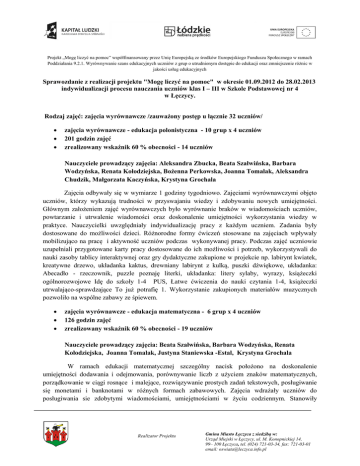 Projekt „Mogę liczyć na pomoc” współfinansowany przez Unię Europejską ze środków Europejskiego Funduszu Społecznego w ramach Poddziałania 9.2.1. Wyrównywanie szans edukacyjnych uczniów z grup o utrudnionym dostępie do edukacji oraz zmniejszenie różnic w jakości usług edukacyjnych Sprawozdanie z realizacji projektu "Mogę liczyć na pomoc" w okresie 01.09.2012 do 28.02.2013 indywidualizacji procesu nauczania uczniów klas I – III w Szkole Podstawowej nr 4 w Łęczycy. Rodzaj zajęć: zajęcia wyrównawcze /zauważony postęp u łącznie 32 uczniów/ zajęcia wyrównawcze - edukacja polonistyczna - 10 grup x 4 uczniów 201 godzin zajęć zrealizowany wskaźnik 60 % obecności - 14 uczniów Nauczyciele prowadzący zajęcia: Aleksandra Zbucka, Beata Szałwińska, Barbara Wodzyńska, Renata Kołodziejska, Bożenna Perkowska, Joanna Tomalak, Aleksandra Chudzik, Małgorzata Kaczyńska, Krystyna Grochala Zajęcia odbywały się w wymiarze 1 godziny tygodniowo. Zajęciami wyrównawczymi objęto uczniów, którzy wykazują trudności w przyswajaniu wiedzy i zdobywaniu nowych umiejętności. Głównym założeniem zajęć wyrównawczych było wyrównanie braków w wiadomościach uczniów, powtarzanie i utrwalenie wiadomości oraz doskonalenie umiejętności wykorzystania wiedzy w praktyce. Nauczycielki uwzględniały indywidualizację pracy z każdym uczniem. Zadania były dostosowane do możliwości dzieci. Różnorodne formy ćwiczeń stosowane na zajęciach wpływały mobilizująco na pracę i aktywność uczniów podczas wykonywanej pracy. Podczas zajęć uczniowie uzupełniali przygotowane karty pracy dostosowane do ich możliwości i potrzeb, wykorzystywali do nauki zasoby tablicy interaktywnej oraz gry dydaktyczne zakupione w projekcie np. labirynt kwiatek, kreatywne drzewo, układanka kaktus, drewniany labirynt z kulką, puszki dźwiękowe, układanka: Abecadło - rzeczownik, puzzle poznaję literki, układanka: litery sylaby, wyrazy, książeczki ogólnorozwojowe Idę do szkoły 1-4 PUS, Łatwe ćwiczenia do nauki czytania 1-4, książeczki utrwalająco-sprawdzające To już potrafię 1. Wykorzystanie zakupionych materiałów muzycznych pozwoliło na wspólne zabawy ze śpiewem. zajęcia wyrównawcze - edukacja matematyczna - 6 grup x 4 uczniów 126 godzin zajęć zrealizowany wskaźnik 60 % obecności - 19 uczniów Nauczyciele prowadzący zajęcia: Beata Szałwińska, Barbara Wodzyńska, Renata Kołodziejska, Joanna Tomalak, Justyna Staniewska -Estal, Krystyna Grochala W ramach edukacji matematycznej szczególny nacisk położono na doskonalenie umiejętności dodawania i odejmowania, porównywanie liczb z użyciem znaków matematycznych, porządkowanie w ciągi rosnące i malejące, rozwiązywanie prostych zadań tekstowych, posługiwanie się monetami i banknotami w różnych formach zabawowych. Zajęcia wdrażały uczniów do posługiwania sie zdobytymi wiadomościami, umiejętnościami w życiu codziennym. Stanowiły Realizator Projektu Gmina Miasto Łęczyca z siedzibą w: Urząd Miejski w Łęczycy, ul. M. Konopnickiej 14, 99– 100 Łęczyca, tel. (024) 721-03-34, fax: 721-03-01 email: [email protected] niezbędną formę pomocy dla uczęszczających na nie uczniów, którzy zdobywali wiedzę poprzez zabawę, doświadczenie wykorzystując różne środki i pomoce typu: liczymy z guzikami, korale matematyczne, wielkie zakupy, poczta, liczmany warzywa, monety, kolorowe liczby, składany zegar, ślimak, klocki śnieżynki, klocki listki, samochody. Udział w zajęciach pozwolił uczniom na pracę w małej grupie, wzmacniał wiarę we własne siły, pozwalał osiągać sukcesy. zajęcia wyrównawcze - język angielski - 2 grupy, 1 grupa - 8 uczniów, 1 grupa - 5 uczniów 42 godziny zajęć zrealizowany wskaźnik 60 % obecności - 10 uczniów Nauczyciel prowadzący zajęcia: Małgorzata Czaplij Głównym zadaniem realizowanym na dodatkowych zajęciach nauki języka angielskiego było przygotowanie uczniów do rozumienia i formułowania (najpierw powtarzania, potem także tworzenia) prostych wypowiedzi w języku angielskim. W zakresie słownictwa uczniowie poznali następujące grupy leksykalne, w klasie drugiej :nazwy przedmiotów z najbliższego otoczenia, przybory szkolne, nazwy czynności, zabawki, kolory, czynności wykonywane w czasie wolnym, zwierzęta na farmie, zwierzęta domowe, typy pogody, dni tygodnia, słownictwo związane ze świętami, w klasie trzeciej: przybory szkolne, nazwy miesięcy, nazwy części garderoby, części ciała zwierząt, nazwy i zwyczaje dzikich zwierząt, W celu podniesienia wyników w nauce zastosowano różnorodne metody nauczania: komunikacyjną, pantomimę, metodę reagowania całym ciałem oraz wybrane metody aktywizujące. Nauczyciel przygotowywał dla uczestników karty pracy dostosowane do indywidualnych możliwości uczniów oraz wykorzystywał zakupione w projekcie środki dydaktyczne, które były atrakcyjną formą zabawy i pracy dla uczniów: alfabet angielski, puzzle z alfabetem angielskim, bingo obrazkowe, alfabet angielski -bingo, bingo angielskie- ubrania, wyrazy podstawowe, żywność, przedmioty szkolne, zwierzęta, angielskie puzzle- obrazy i słowa. Rodzaj zajęć: zajęcia korekcyjno-kompensacyjne /zauważony postęp u łącznie 6 uczniów/ zajęcia korekcyjno-kompensacyjne - 6 grup x 3 uczniów 120 godzin zajęć zrealizowany wskaźnik 60 % obecności - 7 uczniów Nauczyciel prowadzący zajęcia: Iwona Jędrzejczak Zajęcia skierowane były do uczniów mających trudności w opanowaniu umiejętności czytania i pisania spowodowanych deficytami rozwoju funkcji percepcyjno-motorycznych jako jednej z przyczyn niepowodzeń szkolnych. Na zajęciach ćwiczono zaburzone funkcje analizatora wzrokowego, słuchowego i kinestetyczno- ruchowego. Stosowano ćwiczenia usprawniające analizę i syntezę słuchową i wzrokową, a także sprawność ruchową i koordynację wzrokowo- ruchową. Usprawniano umiejętność czy