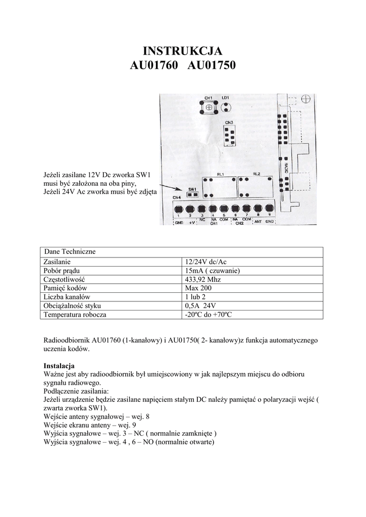 INSTRUKCJA AU01760 AU01750 Jeżeli zasilane 12V Dc zworka SW1 musi być założona na oba piny, Jeżeli 24V Ac zworka musi być zdjęta Dane Techniczne Zasilanie Pobór prądu Częstotliwość Pamięć kodów Liczba kanałów Obciążalność styku Temperatura robocza 12/24V dc/Ac 15mA ( czuwanie) 433,92 Mhz Max 200 1 lub 2 0,5A 24V -20ºC do +70ºC Radioodbiornik AU01760 (1-kanałowy) i AU01750( 2- kanałowy)z funkcja automatycznego uczenia kodów. Instalacja Ważne jest aby radioodbiornik był umiejscowiony w jak najlepszym miejscu do odbioru sygnału radiowego. Podłączenie zasilania: Jeżeli urządzenie będzie zasilane napięciem stałym DC należy pamiętać o polaryzacji wejść ( zwarta zworka SW1). Wejście anteny sygnałowej – wej. 8 Wejście ekranu anteny – wej. 9 Wyjścia sygnałowe – wej. 3 – NC ( normalnie zamknięte ) Wyjścia sygnałowe – wej. 4 , 6 – NO (normalnie otwarte) RADIOODBIORNIK AU01750/1760 Uczenie kodów Włącz zasilanie urządzenia i sprawdź czy czerwona dioda elektroluminescencyjna LED zaświeciła się natychmiast w tym momencie sygnalizując, że zespół sterownika jest gotowy na przyjęcie do uczenia się kodów (z automatycznym rozpoznaniem tych ustawionych na przełączniku DIP lub Rolling Codes). Obecnie może być wciśnięty jeden z klawiszy na nadajniku (1,2,3,4). Gdy kod zostanie zapamiętany można wydać rozkaz zespołowi odbiornika. Bez ponownego wciskania klawisza CH1, można „uczyć” dalszych kodów tej samej rodziny, jeden po drugim. Po nauczeniu ostatniego z kodów zaczekaj aż dioda LED zgaśnie (około 6 sekund) wskazując na to, że system zakończył pobieranie kodów z nadajnika i jest gotowy do normalnej pracy. Uwaga Po nauczeniu się pierwszego z kodów, system będzie akceptował kody tylko z tej rodziny kodów (tzn. jeśli pierwszy był z rodziny Rolling Codes z niej też musza być następne). W przypadku nadajników z przełącznikiem DIP, tylko jeden zdalny nadajnik zostanie zapamiętany Reset pamięci W przypadku popełnienia błędu albo konieczności skasowania wszystkich kodów, wciśnij klawisz CH1 (zaświeci czerwona dioda LED) i przytrzymaj go w tym położeniu aż do jej zgaśnięcia. Zwolnienie klawisza, spowoduje błyskanie diody (wskazujące, że pamięć jest pusta), po czym dioda powróci do emisji światła ciągłego. System jest gotowy do uczenia się nowych kodów (tak z przełącznika DIP jak i Rolling Codes). W wersji dwukanałowej (AU01750) sygnał z pierwszego klawisza nadajnika (który ustawiony jest na kanał pierwszy) spowoduje automatyczne nauczenie się przez system sygnał drugiego klawisza (który ustawiony jest na kanał drugi). W przypadku odebrania sygnału z klawisza 2 na kanale pierwszym nadajnika w chwili wciśnięcia klawisza otwarcie powodowane jest przez obydwa kanały Uczenie nadajnika bez dostępu do zespołu sterującego Przez jednoczesne wciśnięcie klawiszy 1 oraz 2. Przy zezwoleniu systemowi na ustawienie nadajnika w trybie ręcznym (przez wciśniecie klawisza S1) można zezwolić na przeniesienia kodów do innych nadajników tej samej rodziny poprzez jednoczesne wciśnięcie klawiszy 1 oraz 2 w nadajniku już „nauczonym”. W konsekwencji wciśnięcie klawisza drugiego (nowego) nadajnika powoduje „samo-uczenie” (przeniesienia danych). Przy poprawnym zapamiętaniu kodów przez nowy nadajnik efektem jest przesuwanie bramy. 2/3 RADIOODBIORNIK AU01750/1760 KARTA GWARANCYJNA Pieczęć sprzedawcy Nazwa urządzenia............................................... ............................................................................ …......................................................................... data i podpis Data zakupu........................................................ ADNOTACJE O DOKONANYCH NAPRAWACH data zgłoszenia reklamacji data wykonania naprawy zakres naprawy / określenie przyczyn podpis WARUNKI GWARANCJI Producent gwarantuje sprawne działanie urządzenia, pod warunkiem stosowania się do warunków opisanych w instrukcji obsługi i udziela na nie 24 miesięcznej gwarancji, licząc od daty zakupu uwidocznionej w niniejszym dokumencie. W przypadku wystąpienia wady pisemna reklamacja powinna być zgłoszona w okresie trwania gwarancji. Obowiązki gwaranta wykonuje dystrybutor lub producent. Niniejszą gwarancją objęte są usterki spowodowane wadliwymi materiałami, błędami technologii wykonania. Usterki ujawnione w okresie gwarancyjnym będą usunięte przez dystrybutora lub producenta w terminie ustalonym przez strony. Warunkiem rozpatrzenia reklamacji jest przedstawienie prawidłowo wypełnionej karty gwarancyjnej oraz dowodu zakupu. Gwarancja nie obejmuje usterek powstałych w wyniku: użytkowania niezgodnego z instrukcją obsługi dokonywania napraw przez osoby nieuprawnione dokonywania modyfikacji uszkodzeń mechanicznych, fizycznych, chemicznych, spowodowanych siłami i czynnikami zewnętrznymi DYSTRYBUTOR Astat Sp. z o. o. ul. Dąbrowskiego 441, 60-451 Poznań, tel. (061) 848 88 71, faks (061) 848 82 76, e-mail: [email protected] Konto bankowe: BOŚ S.A. O/Poznań nr 69 1540 1056 2001 8310 1156 0002 Regon: 630033055 NIP: 781-00-23-663 Sąd Rejonowy w Poznaniu XXI Wydział KRS, Nr wpisu 0000094291, wys. kapitału zakładowego: 200 000,00 PLN 3/3