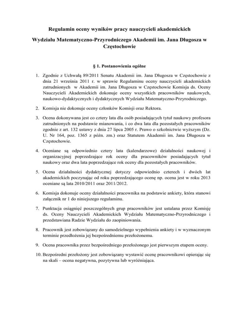Regulamin oceny wyników pracy nauczycieli akademickich Wydziału Matematyczno-Przyrodniczego Akademii im. Jana Długosza w Częstochowie § 1. Postanowienia ogólne 1. Zgodnie z Uchwałą 89/2011 Senatu Akademii im. Jana Długosza w Częstochowie z dnia 21 września 2011 r. w sprawie Regulaminu oceny nauczycieli akademickich zatrudnionych w Akademii im. Jana Długosza w Częstochowie Komisja ds. Oceny Nauczycieli Akademickich dokonuje oceny wszystkich pracowników naukowych, naukowo-dydaktycznych i dydaktycznych Wydziału Matematyczno-Przyrodniczego. 2. Komisja nie dokonuje oceny członków Komisji oraz Rektora. 3. Ocena dokonywana jest co cztery lata dla osób posiadających tytuł naukowy profesora zatrudnionych na podstawie mianowania, i co dwa lata dla pozostałych pracowników zgodnie z art. 132 ustawy z dnia 27 lipca 2005 r. Prawo o szkolnictwie wyższym (Dz. U. Nr 164, poz. 1365 z późn. zm.) oraz Statutem Akademii im. Jana Długosza w Częstochowie. 4. Oceniane są odpowiednio cztery lata (kalendarzowe) działalności naukowej i organizacyjnej poprzedzające rok oceny dla pracowników posiadających tytuł naukowy oraz dwa lata poprzedzające rok oceny dla pozostałych pracowników. 5. Ocena działalności dydaktycznej dotyczy odpowiednio czterech i dwóch lat akademickich poczynając od roku poprzedzającego ocenę np. ocena jest w roku 2013 oceniane są lata 2010/2011 oraz 2011/2012. 6. Komisja dokonuje oceny działalności pracownika na podstawie ankiety, która stanowi załącznik nr 1 do niniejszego regulaminu. 7. Punktacja osiągnięć poszczególnych grup pracowników jest ustalana przez Komisję ds. Oceny Nauczycieli Akademickich Wydziału Matematyczno-Przyrodniczego i przedstawiana Radzie Wydziału do zaopiniowania. 8. Pracownik jest zobowiązany do samodzielnego wypełnienia ankiety i w wyznaczonym terminie przedłożenia jej bezpośredniemu przełożonemu. 9. Ocena pracownika przez bezpośredniego przełożonego jest pierwszym etapem oceny. 10. Bezpośredni przełożony jest zobowiązany wystawić ocenę pracownikowi opierając się na skali – ocena negatywna, pozytywna lub wyróżniająca. 11. Bezpośredni przełożony jest zobowiązany do analizy ankiet studenckich wypełnionych dla podległych mu pracowników i wystawieniu oceny opartej na wynikach tych ankiet oraz hospitacji zajęć prowadzonych przez pracownika. 12. Bezpośredni przełożony składa ankiety wszystkich podległych mu pracowników Wydziałowej Komisji ds. Oceny Nauczycieli Akademickich. 13. Kierownicy katedr, zakładów i zespołów składają swoje ankiety do Dyrektora odpowiedniego Instytutu, którego ocena jest pierwszym etapem procedury. Dyrektor ocenia wymienionych tu pracowników zgodnie z punktami 10 i 11. 14. Dyrektor ma obowiązek dostarczyć ankiety kierowników katedr, zakładów i zespołów Wydziałowej Komisji ds. Oceny Nauczycieli Akademickich w wyznaczonym terminie. 15. Bezpośrednim przełożonym dyrektorów instytutów jest Dziekan Wydziału, który dokonuje ich pierwszej oceny zgodnie z punktami 10 i 11, a następnie dostarcza ankiety do Wydziałowej Komisji ds. Oceny Nauczycieli Akademickich. 16. Komisja może poprosić osobę ocenianą o złożenie wyjaśnień i/lub wystąpienie przed Komisją. 17. Przewodniczący Wydziałowej Komisji ds. Oceny Nauczycieli Akademickich jest zobowiązany przedstawić ocenę ocenionemu nauczycielowi na piśmie w ciągu 14 dni od daty wystawienia oceny. 18. Wyniki oceny Komisja przedkłada Dziekanowi Wydziału w formie sprawozdania. 19. Pracownikowi przysługuje, w terminie 14 dni od dnia przedstawienia mu oceny, odwołanie do Uczelnianej Odwoławczej Komisji Oceniającej, która rozpoznaje odwołanie w terminie 30 dni od dnia jego złożenia. Ocena Uczelnianej Odwoławczej Komisji Oceniającej jest ostateczna. 20. Zarówno Komisja jak i bezpośredni przełożony kierują się w ocenie kryteriami zawartymi w § 2. § 2. Kryteria oceny 1. Za każdą z działalności: naukową, dydaktyczną i organizacyjną pracownik otrzymuje jedną z ocen cząstkowych: negatywną, pozytywną lub wyróżniającą. 2. Warunkiem uzyskania oceny pozytywnej za działalność naukową jest: a) w przypadku pracowników bez stopnia naukowego zatrudnionych na stanowiskach naukowych lub naukowo-dydaktycznych spełnienie przynajmniej jednego z warunków: • odpowiednie zaawansowanie pracy doktorskiej, potwierdzone przez promotora lub opiekuna naukowego, • autorstwo lub współautorstwo co najmniej dwóch rozdziałów monografii, • opublikowanie co najmniej dwóch publikacji naukowych w czasopiśmie zamieszczonym w wykazie czasopism punktowanych Ministerstwa Nauki i Szkolnictwa Wyższego, • opublikowanie w ocenianym okresie minimum jednego artykułu w czasopismach z tak zwanej listy filadelfijskiej lub European Reference Index for the Humanities (ERIH), b) w przypadku pracowników posiadających stopień naukowy zatrudnionych na stanowiskach naukowych lub naukowo-dydaktycznych spełnienie przynajmniej jednego z warunków: • opublikowanie w ocenianym okresie minimum jednego artykułu w czasopismach z tak zwanej listy filadelfijskiej lub ERIH, • opublikowanie co najmniej dwóch publikacji naukowych w czasopiśmie zamieszczonym w wykazie czasopism punktowanych Ministerstwa Nauki i Szkolnictwa Wyższego, • autorstwo lub współautorstwo monografii naukowej w ocenianym okresie, • autorstwo lub współautorstwo co najmniej dwóch rozdziałów monografii, • prace redakcyjne nad wydawnictwami o charakterze naukowym (średnio w każdym roku jedna), • promotorstwo lub recenzje pracy kwalifikacyjnej na stopień lub tytuł naukowy (średnio w każdym roku jedna), c) w przypadku pracowników z tytułem profesora spełnienie przynajmniej jednego z warunków: • opublikowanie w ocenianym okresie minimum dwóch artykułu w czasopismach z tak zwanej listy filadelfijskiej lub ERIH, • opublikowanie co najmniej czterech publikacji naukowych w czasopiśmie zamieszczonym w