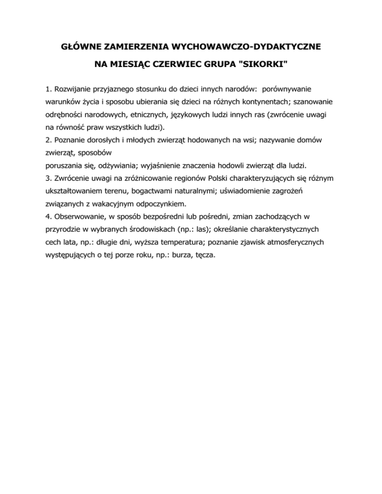 GŁÓWNE ZAMIERZENIA WYCHOWAWCZO-DYDAKTYCZNE NA MIESIĄC CZERWIEC GRUPA "SIKORKI" 1. Rozwijanie przyjaznego stosunku do dzieci innych narodów: porównywanie warunków życia i sposobu ubierania się dzieci na różnych kontynentach; szanowanie odrębności narodowych, etnicznych, językowych ludzi innych ras (zwrócenie uwagi na równość praw wszystkich ludzi). 2. Poznanie dorosłych i młodych zwierząt hodowanych na wsi; nazywanie domów zwierząt, sposobów poruszania się, odżywiania; wyjaśnienie znaczenia hodowli zwierząt dla ludzi. 3. Zwrócenie uwagi na zróżnicowanie regionów Polski charakteryzujących się różnym ukształtowaniem terenu, bogactwami naturalnymi; uświadomienie zagrożeń związanych z wakacyjnym odpoczynkiem. 4. Obserwowanie, w sposób bezpośredni lub pośredni, zmian zachodzących w przyrodzie w wybranych środowiskach (np.: las); określanie charakterystycznych cech lata, np.: długie dni, wyższa temperatura; poznanie zjawisk atmosferycznych występujących o tej porze roku, np.: burza, tęcza. PIOSENKA „Lato płynie do nas” 1. Raz, dwa, raz i dwa, słońce idzie drogą, z góry chmurki biegną dwie, śpieszą się jak mogą. Ref. Hop!Hop!- Słychać w koło. Hop! Hop!- Echo woła. Po jeziorze łódka mknie, lato płynie do nas. 2. Raz, dwa, raz i dwa, nadszedł czas zabawy, pędzi, goni w polu wiatr, chce się z nami bawić. Ref. Hop!Hop! Słychać w koło… 3. Raz, dwa, raz i dwa, wiatr wesoło pląsa, w górze, w chmurze, w ciszy pól dzwoni śpiew skowronka. Ref. Hop!Hop! Słychać w koło… słowa: K. Zuchora muzyka: K. Kwiatkowska WIERSZ „Na wakacjach” Wakacyjne miesiące na wyprawy zapraszają. Wakacyjne miesiące leniuchować pozwalają. Na mazurskich jeziorach wszyscy chcemy pożeglować. Zbierać grzyby, jagody i po łąkach maszerować. Po wakacjach się spotkamy o wrażeniach opowiemy. Teraz prędko się żegnamy no i wyruszamy w świat. B. Forma