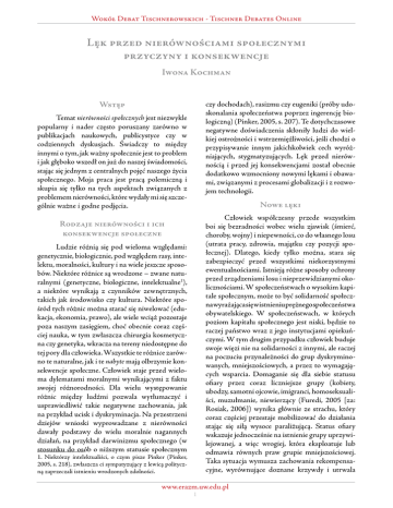 Wokół Debat Tischnerowskich - Tischner Debates Online Lęk przed nierównościami społecznymi przyczyny i konsekwencje Iwona Kochman Wstęp czy dochodach), rasizmu czy eugeniki (próby udoskonalania społeczeństwa poprzez ingerencję biologiczną) (Pinker, 2005, s. 207). Te dotychczasowe negatywne doświadczenia skłoniły ludzi do wielkiej ostrożności i wstrzemięźliwości, jeśli chodzi o przypisywanie innym jakichkolwiek cech wyróżniających, stygmatyzujących. Lęk przed nierównością i przed jej konsekwencjami został obecnie dodatkowo wzmocniony nowymi lękami i obawami, związanymi z procesami globalizacji i z rozwojem technologii. Temat nierówności społecznych jest niezwykle popularny i nader często poruszany zarówno w publikacjach naukowych, publicystyce czy w codziennych dyskusjach. Świadczy to między innymi o tym, jak ważny społecznie jest to problem i jak głęboko wszedł on już do naszej świadomości, stając się jednym z centralnych pojęć naszego życia społecznego. Moja praca jest pracą polemiczną i skupia się tylko na tych aspektach związanych z problemem nierówności, które wydały mi się szczególnie ważne i godne podjęcia. Nowe lęki Człowiek współczesny przede wszystkim boi się bezradności wobec wielu zjawisk (śmierć, choroby, wojny) i niepewności, co do własnego losu (utrata pracy, zdrowia, majątku czy pozycji społecznej). Dlatego, kiedy tylko można, stara się zabezpieczyć przed wszystkimi niekorzystnymi ewentualnościami. Istnieją różne sposoby ochrony przed zrządzeniami losu i nieprzewidzianymi okolicznościami. W społeczeństwach o wysokim kapitale społecznym, może to być solidarność społeczna wyrażająca się w istnieniu prężnego społeczeństwa obywatelskiego. W społeczeństwach, w których poziom kapitału społecznego jest niski, będzie to raczej państwo wraz z jego instytucjami opiekuńczymi. W tym drugim przypadku człowiek buduje swoje więzi nie na solidarności z innymi, ale raczej na poczuciu przynależności do grup dyskryminowanych, mniejszościowych, a przez to wymagających wsparcia. Domaganie się dla siebie statusu ofiary przez coraz liczniejsze grupy (kobiety, ubodzy, samotni ojcowie, imigranci, homoseksualiści, muzułmanie, niewierzący (Furedi, 2005 [za: Rosiak, 2006]) wynika głównie ze strachu, który coraz częściej przestaje mobilizować do działania stając się siłą wysoce paraliżującą. Status ofiary wskazuje jednocześnie na istnienie grupy uprzywilejowanej, a więc wrogiej, która eksploatuje lub odmawia równych praw grupie mniejszościowej. Taka sytuacja wymusza zachowania rekompensacyjne, wyrównujące doznane krzywdy i utrwala Rodzaje nierówności i ich konsekwencje społeczne Ludzie różnią się pod wieloma względami: genetycznie, biologicznie, pod względem rasy, intelektu, moralności, kultury i na wiele jeszcze sposobów. Niektóre różnice są wrodzone – zwane naturalnymi (genetyczne, biologiczne, intelektualne), a niektóre wynikają z czynników zewnętrznych, takich jak środowisko czy kultura. Niektóre spośród tych różnic można starać się niwelować (edukacja, ekonomia, prawo), ale wiele wciąż pozostaje poza naszym zasięgiem, choć obecnie coraz częściej nauka, w tym zwłaszcza chirurgia kosmetyczna czy genetyka, wkracza na tereny niedostępne do tej pory dla człowieka. Wszystkie te różnice zarówno te naturalne, jak i te nabyte mają olbrzymie konsekwencje społeczne. Człowiek staje przed wieloma dylematami moralnymi wynikającymi z faktu swojej różnorodności. Dla wielu występowanie różnic między ludźmi pozwala wytłumaczyć i usprawiedliwić takie negatywne zachowania, jak na przykład ucisk i dyskryminacja. Na przestrzeni dziejów wnioski wyprowadzane z nierówności dawały podstawy do wielu moralnie nagannych działań, na przykład darwinizmu społecznego (w stosunku do osób o niższym statusie społecznym . Niektórzy intelektualiści, o czym pisze Pinker (Pinker, 2005, s. 218), zwłaszcza ci sympatyzujący z lewicą polityczną zaprzeczali istnieniu wrodzonych zdolności. www.erazm.uw.edu.pl Wokół Debat Tischnerowskich - Tischner Debates Online przekonanie o istnieniu nierówności, które w powszechnej opinii są czymś głęboko niesprawiedliwym i krzywdzącym, i które wymagają niezwłocznej interwencji z zewnątrz. Myślenie tymi kategoriami paradoksalnie utrwala więc z jednej strony postawy egalitarne, z drugiej zaś wrogie w stosunku do innych grup. Z kolei zdanie się na działania wspomagające powoduje to, iż człowiek zaczynać budować swoją tożsamość na przekonaniu o własnej bezradności i na stałym lęku o swój los. W konsekwencji strach powoduje, że ludzie boją się nawet własnych wyborów, które skłonni są pozostawić innym, na przykład państwu. W związku z tymi licznymi – dawnymi i nowymi – obawami czy fobiami, obecnie możemy zaobserwować dwie tendencje w sposobie radzenia sobie z rozmaitymi nierównościami. ożywia nadzieja, a niebezpieczeństwo powstrzymuje od działania, wszyscy poddajemy się żądzom i ulegamy pokusie przyjemności ( Johnson, [za: Pinker, 2005, s. 208]). Inny cytat, który potwierdza to założenie brzmi: Wszyscy ludzie mają podobną naturę, to środowisko sprawia, że tak bardzo się różnią (Konfucjusz [ za: Pinker, 2005, s. 208]). Tak więc różnorodność wynika tu głównie z różnic środowiskowych, ale samo jądro natury ludzkiej pozostaje wspólne. W związku z tym wszyscy mają być traktowani w jednakowy sposób, mają mieć te same prawa, które odpowiadają na wspólne potrzeby. Zasady te uznajemy za zdobycze cywilizacyjne świata zachodniego. Powyższe mechanizmy napotykają jednak na pewien opór i ścierają się z innymi, równie silnymi jako one same, będącymi także produktem kultury zachodniej. Są to przede wszystkim: indywidualizm, pragnienie wyróżnienia się i zdobycia nagród za zasługi uzyskane w wyniku współ