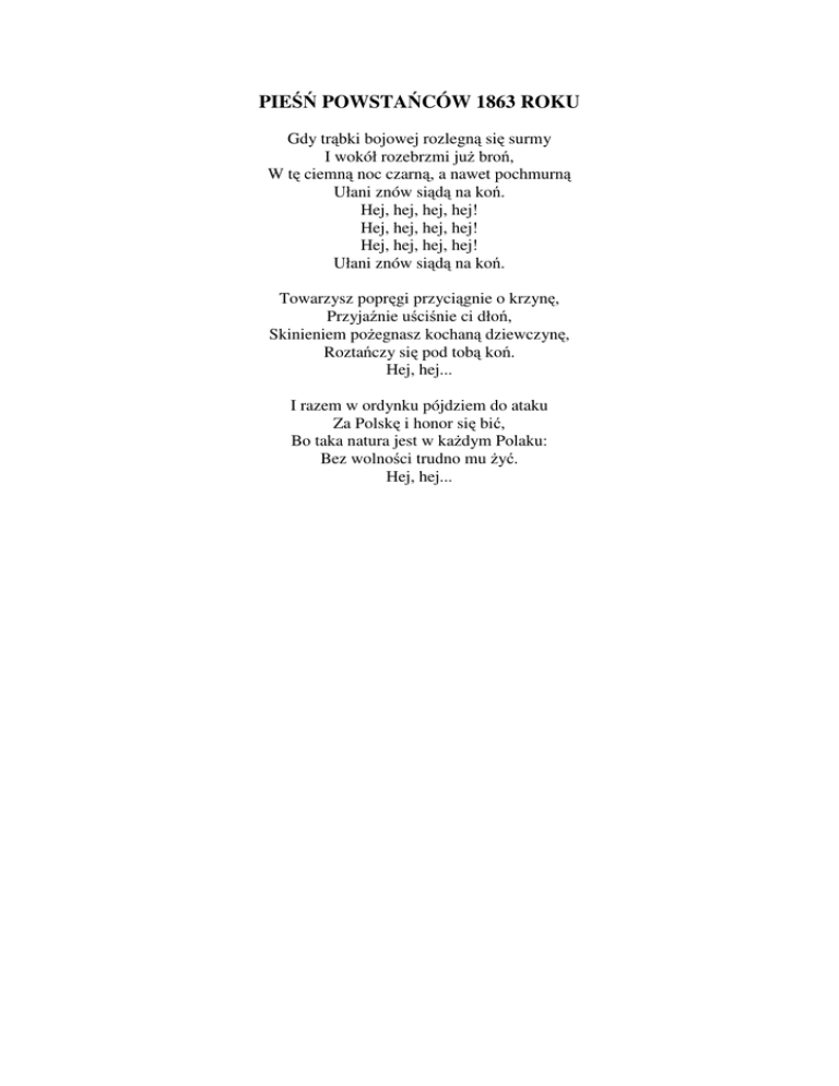 PIEŚŃ POWSTAŃCÓW 1863 ROKU Gdy trąbki bojowej rozlegną się surmy I wokół rozebrzmi już broń, W tę ciemną noc czarną, a nawet pochmurną Ułani znów siądą na koń. Hej, hej, hej, hej! Hej, hej, hej, hej! Hej, hej, hej, hej! Ułani znów siądą na koń. Towarzysz popręgi przyciągnie o krzynę, Przyjaźnie uściśnie ci dłoń, Skinieniem pożegnasz kochaną dziewczynę, Roztańczy się pod tobą koń. Hej, hej... I razem w ordynku pójdziem do ataku Za Polskę i honor się bić, Bo taka natura jest w każdym Polaku: Bez wolności trudno mu żyć. Hej, hej...