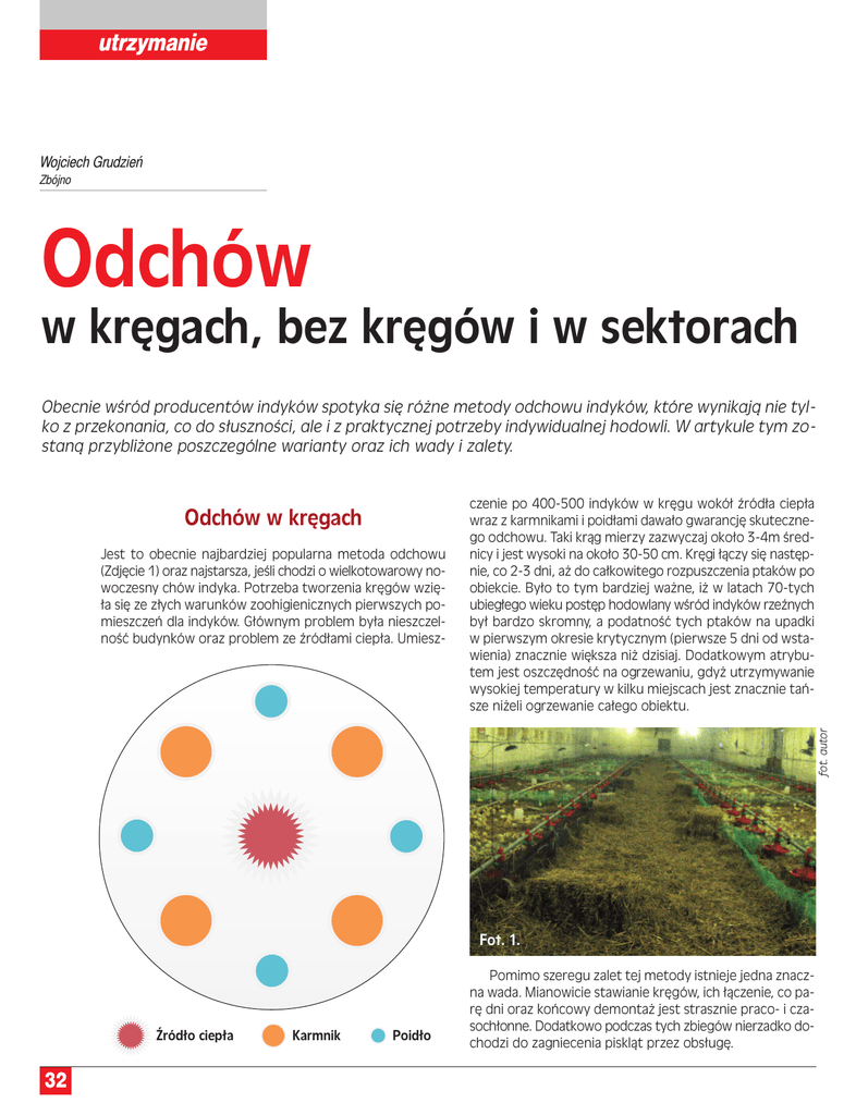 utrzymanie Wojciech Grudzień Zbójno Odchów w kręgach, bez kręgów i w sektorach Obecnie wśród producentów indyków spotyka się różne metody odchowu indyków, które wynikają nie tylko z przekonania, co do słuszności, ale i z praktycznej potrzeby indywidualnej hodowli. W artykule tym zostaną przybliżone poszczególne warianty oraz ich wady i zalety. Odchów w kręgach fot. autor Jest to obecnie najbardziej popularna metoda odchowu (Zdjęcie 1) oraz najstarsza, jeśli chodzi o wielkotowarowy nowoczesny chów indyka. Potrzeba tworzenia kręgów wzięła się ze złych warunków zoohigienicznych pierwszych pomieszczeń dla indyków. Głównym problem była nieszczelność budynków oraz problem ze źródłami ciepła. Umiesz- czenie po 400-500 indyków w kręgu wokół źródła ciepła wraz z karmnikami i poidłami dawało gwarancję skutecznego odchowu. Taki krąg mierzy zazwyczaj około 3-4m średnicy i jest wysoki na około 30-50 cm. Kręgi łączy się następnie, co 2-3 dni, aż do całkowitego rozpuszczenia ptaków po obiekcie. Było to tym bardziej ważne, iż w latach 70-tych ubiegłego wieku postęp hodowlany wśród indyków rzeźnych był bardzo skromny, a podatność tych ptaków na upadki w pierwszym okresie krytycznym (pierwsze 5 dni od wstawienia) znacznie większa niż dzisiaj. Dodatkowym atrybutem jest oszczędność na ogrzewaniu, gdyż utrzymywanie wysokiej temperatury w kilku miejscach jest znacznie tańsze niżeli ogrzewanie całego obiektu. Fot. 1. Źródło ciepła 32 Karmnik Poidło Pomimo szeregu zalet tej metody istnieje jedna znaczna wada. Mianowicie stawianie kręgów, ich łączenie, co parę dni oraz końcowy demontaż jest strasznie praco- i czasochłonne. Dodatkowo podczas tych zbiegów nierzadko dochodzi do zagniecenia piskląt przez obsługę. utrzymanie Pomimo tej wady hodowcy chętnie stosują tą metodę, gdyż zapewnia tak naprawdę najlepszy sposób obserwacji ptaków, ich zachowania oraz ewentualnych niedoborów. Należy także zauważyć, iż w przypadku stad rodzicielskich stosowany jest wyłącznie odchów w kręgach. Odchów bez kręgów fot. Kartzfehn Jest to zdecydowanie najprostsza i najmniej utrudniona forma odchowu, którą powszechnie stosuje się u kurcząt brojlerów. Uważa się obecnie, iż postęp hodowlany wśród indyków rzeźnych oraz jakość budynków jest tak zaawansowana, że można z powodzeniem stosować tą metodę. Jednak pomimo tych zalet jest to najmniej popularna metoda. Prawdopodobnie przyczyną jest z jednej strony przekonanie, iż indyki bez kręgów będą nadmiernie padać, zaś z drugiej du- Fot. 2. że koszty ogrzewania całego pomieszczenia (szczególnie jeżeli jest dużo nieszczelności). Obecnie w dobrze przygotowanych budynkach nie obserwuje się istotnych różnic pomiędzy odchowem w kręgach i bez kręgów. Niewątpliwie tą metodę odchowu stosują hodowcy, którzy nie dysponują znaczną ilością personelu, by móc stawiać kręgi czy sektory. Odchów w sektorach Jest to najmłodsza metoda odchowu, którą powszechnie stosuje się w Niemczech i Francji. Sektor to swoisty kompromis pomiędzy odchowem w kręgach i bez. Sektory są de facto „kręgami”, ale o dużo większym obszarze i kształcie foremnym (kwadrat, wielokąt, prostokąt). W związku z tym odchowuje się w nich znacznie większą ilość pisklątnawet do 2000 sztuk (Zdjęcie 2). W pozostałych kwestiach nie różni się od kręgu. Metoda ta łączy wady i zalety poprzednich form odchowu indyków. Jest jednak mniej kłopotliwa niż odchów w kręgach oraz może być tańsza od odchowu bezkręgowego. Zasadniczą wadą jednak tej metody jest tendencja ptaków do skupiania się w sektorach w grupy, co sprzyja róż- 33 nym technopatiom. Jednak przy równomiernym ogrzaniu i oświetleniu pomieszczenia praktycznie tego problemu się nie obserwuje. Wybór technologii odchowu pomimo wymienionych wad i zalet powinien być jednak oparty także o pozostałe parametry, nie ujęte w artykule, a wynikające z indywidualnych sytuacji oraz zdolności ekonomicznych producentów indyków.