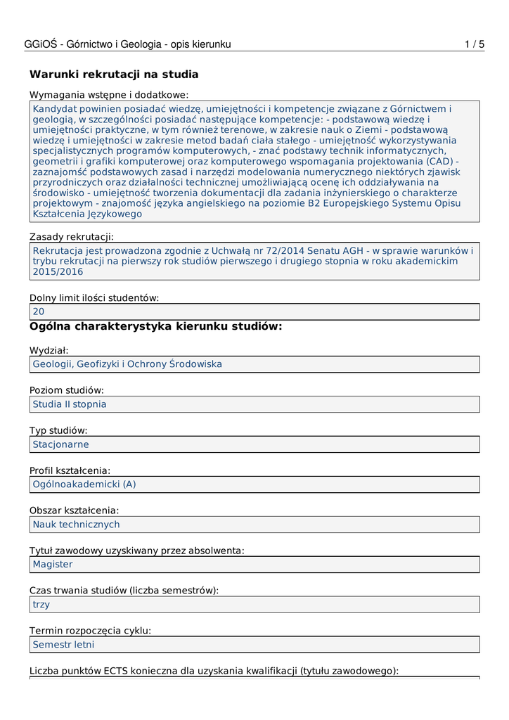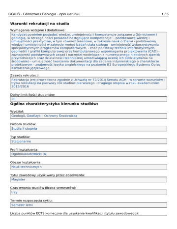 GGiOŚ - Górnictwo i Geologia - opis kierunku 1/5 Warunki rekrutacji na studia Wymagania wstępne i dodatkowe: Kandydat powinien posiadać wiedzę, umiejętności i kompetencje związane z Górnictwem i geologią, w szczególności posiadać następujące kompetencje: - podstawową wiedzę i umiejętności praktyczne, w tym również terenowe, w zakresie nauk o Ziemi - podstawową wiedzę i umiejętności w zakresie metod badań ciała stałego - umiejętność wykorzystywania specjalistycznych programów komputerowych, - znać podstawy technik informatycznych, geometrii i grafiki komputerowej oraz komputerowego wspomagania projektowania (CAD) zaznajomść podstawowych zasad i narzędzi modelowania numerycznego niektórych zjawisk przyrodniczych oraz działalności technicznej umożliwiającą ocenę ich oddziaływania na środowisko - umiejętność tworzenia dokumentacji dla zadania inżynierskiego o charakterze projektowym - znajomość języka angielskiego na poziomie B2 Europejskiego Systemu Opisu Kształcenia Językowego Zasady rekrutacji: Rekrutacja jest prowadzona zgodnie z Uchwałą nr 72/2014 Senatu AGH - w sprawie warunków i trybu rekrutacji na pierwszy rok studiów pierwszego i drugiego stopnia w roku akademickim 2015/2016 Dolny limit ilości studentów: 20 Ogólna charakterystyka kierunku studiów: Wydział: Geologii, Geofizyki i Ochrony Środowiska Poziom studiów: Studia II stopnia Typ studiów: Stacjonarne Profil kształcenia: Ogólnoakademicki (A) Obszar kształcenia: Nauk technicznych Tytuł zawodowy uzyskiwany przez absolwenta: Magister Czas trwania studiów (liczba semestrów): trzy Termin rozpoczęcia cyklu: Semestr letni Liczba punktów ECTS konieczna dla uzyskania kwalifikacji (tytułu zawodowego): GGiOŚ - Górnictwo i Geologia - opis kierunku 91 2/5 GGiOŚ - Górnictwo i Geologia - opis kierunku 3/5 Dziedziny nauk, do których odnoszą się zakładane efekty kształcenia: Dyscypliny naukowe, do których odnoszą się zakładane efekty kształcenia: Związek kierunku studiów ze strategią rozwoju AGH oraz misją AGH: Kierunek ma charakter zorientowany pod potrzeby przemysłu i gospodarki narodowej a kształcenie odbywa się m.in. przez udział studentów w nowatorskich badaniach co dobrze wpisuje się w misję Akademii Górniczo-Hutniczej służącej nauce, gospodarce i społeczeństwu przez kształcenie studentów i rozwój kadry naukowej oraz prowadzenie badań naukowych. Nazwa specjalności: Mineralogia stosowana z gemmologią Zasady dotyczące struktury studiów (zasady studiowania) Dopuszczalny deficyt punktowy: 10 Semestry kontrolne: drugi Zasady wpisu na kolejny semestr: Aby uzyskać wpis na kolejny semestr należy złożyć w dziekanacie w terminie wskazanym przez Dziekana indeks, jednocześnie zgodnie z paragrafem 17 pkt. 8 Regulaminu studiów AGH, deficyt punktów nie może przekraczać wartości określonej w punkcie powyżej. Dodatkowo, warunkiem wpisu na semestr drugi jest wybór tematu pracy magisterskiej. Warunkiem zaliczenia semestru kontrolnego jest wypełnienie przez studenta dodatkowych wymagań o którch jest mowa w paragrafie 7 ust. 11 Regulaminu studiów AGH. Studia indywidualne: Szczegółowe warunki kwalifikacji reguluje §9 Regulaminu Studiów Akademii GórniczoHutniczej im. Stanisława Staszica. Zasady ustalania końcowej oceny studiów: Końcową oceną studiów II stopnia jest średnia ważona: a/ oceny pracy dyplomowej, będącej średnią arytmetyczną ocen pracy wystawionej przez promotora i recenzenta (z wagą 0,2), b/ średniej ocen ze studiów, obliczonej zgodnie z Regulaminem Studiów §14 (z wagą 0,6), c/ GGiOŚ - Inżynieria Środowiska - opis kierunku 3 / 5 Inne: oceny egzaminu dyplomowego magisterskiego, ustalonej przez komisję, będącej średnią arytmetyczną części pisemnej egzaminu dyplomowego magisterskiego, prezentacji pracy dyplomowej magisterskiej i odpowiedzi na pytania związane z obroną pracy (z wagą 0,2). Inne: Zasady prowadzenia procesu dyplomowania: 1. Warunkiem ukończenia studiów jest złożenie egzaminu dyplomowego. 2. Do egzaminu dyplomowego dopuszczony jest student, który: 1) zaliczył wszystkie przewidziane programem przedmioty i praktyki; 2) złożył pracę dyplomową; 3) złożył wszystkie wymagane przez GGiOŚ - Górnictwo i Geologia - opis kierunku 4/5 Dziekana Wydziału dokumenty. 3. Egzamin dyplomowy odbywa się przed Komisją powoływaną przez Dziekana Wydziału zgodnie z wytycznymi Rady Wydziału. Komisji przewodniczy Dziekan Wydziału lub osoba przez niego upoważniona. 4. Egzamin dyplomowy obejmuje: 1) prezentację pracy dyplomowej, 2) dyskusję nad pracą, 3) sprawdzenie poziomu wiedzy z zakresu kierunku studiów. 5. Rada Wydziału określa szczegółowe zasady dyplomowania, w szczególności: 1) zasady wyboru przez studentów i zatwierdzania tematów prac dyplomowych oraz ich opiekunów, 2) rygory czasowe, 3) zasady powoływania recenzentów, 4) wytyczne dotyczące zakresu i przebiegu egzaminu dyplomowego. 6. Oceny egzaminu dyplomowego dokonuje Komisja na niejawnej części swego posiedzenia. Ocena egzaminu dyplomowego ustalana jest jako średnia arytmetyczna ze wszystkich ocen cząstkowych uzyskanych za prezentację pracy i odpowiedzi na wszystkie postawione pytania. Oceny cząstkowe ustalają zadający pytania. Wobec pozytywnego wyniku egzaminu dyplomowego Komisja podejmuje decyzję o uzyskaniu właściwego tytułu zawodowego i dyplomu ukończenia studiów ustalając ocenę końcową – wynik ukończenia studiów. 7. Wynik ukończenia studiów wyższych w Uczelni, wpisywany do dyplomu oraz suplementu ustalany jest jako średnia ważona następujących ocen: 1) średniej oceny ze studiów, obliczonej zgodnie z § 14 Regulaminu Studiów AGH, 2) końcowej oceny pracy, ustalonej zgodnie z § 24 ust. 9; 3) oceny egzaminu dyplomowego, ustalonej przez Komisję. 8. Wagi ocen, o których mowa w ust. 11 ustala Rada Wydziału, przy czym średnia ocena ze studiów uwzględniana jest z wag