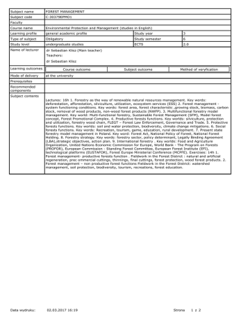 Subject name FOREST MANAGEMENT Subject code C:30379EPMO1 Faculty Course name Environmental Protection and Management (studies in English) Learning profile general academic profile Study year 3 Type of subject Obligatory Study semester 6 Study level undergraduate studies ECTS 2.0 Name of lecturer dr Sebastian Klisz (Main teacher) Teachers: dr Sebastian Klisz Learning outcomes Mode of delivery Course outcome Subject outcome Method of veryfication at the university Prerequisites Recommended components Subject contents Lectures: 16h 1. Forestry as the way of renewable natural resources management. Key words: deforestation, afforestation, silviculture, utilization, ecosystem services (ESS) 2. Forest management system functioning conditions. Key words: forest area, forest characteristic ,growing stock, biomass, carbon stock, removal of wood products, non-wood forest products (NWFP). 3. Multifunctional forestry model management. Key world: Multi-functional forestry, Sustainable Forest Management (SFM), Model forest concept, Forest Promotional Complex. 4. Productive forests functions. Key worlds: silviculture, protection and utilization, forestry wood chain, FLEGT – Forest Law Enforcement, Governance and Trade. 5. Protective forests functions. Key worlds: soil and water protection, biodiversity, climate change mitigations. 6. Social forests functions. Key words: Recreation, tourism, game, education, rural development. 7. Present state forestry model management in Poland. Key word: Forest Act, National Policy of Forest, National Forest Holding. 8. Forestry strategy. Key words: forestry sector, policy determinant, Legally Binding Agreement (LBA),strategic objectives, action plan. 9. International forestry . Key worlds: Food and Agriculture Organization, United Nations Economic Commission for Europe, World Bank - The Program on Forests (PROFOR), European Commission - Standing Forest Committee, European Forest Institute (EFI), technological platforms (EUSTAFOR), Forest Europe Ministerial Conference (MCPFE). Exercises: 14h 1. Forest management- productive forests function . Fieldwork in the Forest District : natural and artificial regeneration, prec ommercial cuttings, thinnings, final cuttings, forest protection, wood forest products. 2. Forest management – non productive forest functions Fieldwork in the Forest District: watershed management, soil protection, biodiversity, tourism, recreations, forest education. Data wydruku: 02.03.2017 16:19 Strona 1 z 2 Recommended and required reading Required reading 1. Forestry 2011, Central Statistic Office, Warsaw 2011 2. The State of the World’s Forests 2011, FAO, Rome 2011 3. Climate change for Forest Policy Maker, FAO Rome 2011 4. Partnerships to Success in Sustainable Forest Management, International Model Forest Network, Canada, Ontario 2005 5. Forestry Resources Assessment 2010, FAO, Rome 2010 6. Gane Michael ,Forest Strategy Strategic Management and Sustainable Development for the Forest Sector, Springer, Dordrecht, The Netherland 2007 7. Ecosystem Services in European State Forest, EUSTAFOR, June 2011 8. TEEB – The Economics of Ecosystems and Biodiversity for National and International Policy Makers Summary: Responding to the Value of Nature2009, Wesseling, Germany 9. European Forestry in the Face of Climate Change Eustafor Guidelines, EUSTAFOR, December 2010 10. Mobilisation and efficient use of wood residues for energy generation, Report to the Standing Forestry Committee by the Standing Forestry Committee ad hoc Working Group II, July 2008 11. UNECE, FAO, The European Forest Sector Outlook Study II 2010-2030, Geneva 2011 12. The Forestry Wood Chain: The impact of EU research (1998-2004), European Communities 2004 13. Tosia - a tool for sustainability impact assessment of the forest-wood chain, EFORWOOD 2009 14. A Srategic Research Agenda for Innovation, Competitivness and Quality of Life Forest – Based Sector Technology Platform Brussels 2006 15. FAO, Forest products annual market review 2010-2011, Geneva Timber and Forest Study Paper 27, Geneva 2011 16. Review of instruments and valuation methods for multifunctional forest policy, POLFOREX, Warsaw 2009 17. Work Programme , MCPFE, November 2007, Warsaw 18. Payment for Ecosystem Services Getting Started A Primer, The Katoomba Group, 2008 19. UE Forest Action Plan, Communication from the Commission to the Council and The European Parliament, Brussels, 15.06. 2006 20. National Policy of Forest, Agencja Reklamowo – Wydawnicza Arkadiusz Grzegorczyk Warszawa 1997 21. Lasy w Polsce 2011, Centrum Informacyjne Lasów Państwowy , Warszawa 2011 22. Ustawa o lasach z dnia 28.09.1991 z późniejszymi zmianami, Dziennik Ustaw z 2011 roku Nr 12 poz. 59 23. Fronczak K. Poland’s green treasurehouse, Centrum Informacyjne Lasów Państwowych, Warszawa 2003 24. Bernadzki E. Lasy i leśnictwo krajów Unii Europejskiej, Centrum Informacyjne Lasów Państwowych, Warszawa 2006 25. Sierota Z. Quo vadis, for estry, Instytut Badawczy Leśnictwa Sękocin Stary 2007 26. Żylicz T. Ekonomia Środowiska i zasobów naturalnych, PWE, Warszawa 2004 27. Yrjola T., Forest management guidelines and practices in Finland, Sweden and Norway European Forest Institude, Internal Report No. 11, EFI Finland 2002 28. PROFOR. Forest Institutions In Transition. Experiences and Lessons from Eastern Europe, PROFR at the World Bank, Washington 2005 29. Ostrom E., Gardner R., Walker J., Rules, Games and Common-Pool-Resources, The University of Michigan Press, Michigan March 1994 30. Hamilton H., Slash and Burn in the history of the Swedish Forests, Rural Development Network 21, Overseas Development Institute, London 1997, 31. Forestry Commission England Forest Strategy, Forestry Commission 2000 32. Nogalski B. Klisz S. Koncepcje I metody zarządzania zasobami leśnymi Polska i Świat, CeDeWu, Warszawa 2012 Recommeded reading Not required Lesson type and method of instruction Lesson type Number of study hours Lecture Tutorial Laborato