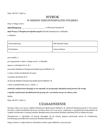 Sygn. akt IX U 1936/14 WYROK W IMIENIU RZECZYPOSPOLITEJ POLSKIEJ Dnia 17 lutego 2016 r. Sąd Okręgowy___________________ w Gliwicach Wydział IX Sąd Pracy i Ubezpieczeń Społecznych Ośrodek Zamiejscowy w Rybniku w składzie: Przewodniczący: SSO Mariola Łącka Protokolant: Joanna Metera przy udziale ./. po rozpoznaniu w dniu 17 lutego 2016 r. w Rybniku sprawy z odwołania M. S. (S.) przeciwko Zakładowi Ubezpieczeń Społecznych Oddział w R. o rentę z tytułu niezdolności do pracy na skutek odwołania M. S. od decyzji Zakładu Ubezpieczeń Społecznych Oddział w R. z dnia 14 października 2014 r. Znak (...) zmienia zaskarżona decyzję w ten sposób, że przyznaje ubezpieczonej prawo do renty z tytułu częściowej niezdolności do pracy od 1 września 2014r na okres 3 lat. Sędzia Sygn. akt IX U 1936/14 UZASADNIENIE Decyzją z dnia 14.10.2014r. Zakład Ubezpieczeń Społecznych Oddział w R. odmówił ubezpieczonej M. S. (S.) prawa do renty z tytułu niezdolności do pracy na dalszy okres od 01.09.2014r., podnosząc w uzasadnieniu brak podstaw do wypłaty świadczenia w sytuacji uznania ubezpieczonej orzeczeniem Komisji Lekarskiej ZUS za zdolną do pracy. Ubezpieczona w odwołaniu od decyzji domagała się jej zmiany poprzez przyznanie prawa do świadczenia, kwestionując prawidłowość orzeczenia Komisji Lekarskiej. Organ rentowy w odpowiedzi na odwołanie wniósł o jego oddalenie z przyczyn jak w zaskarżonej decyzji. Rozpoznając sprawę Sąd ustalił co następuje: Ubezpieczona M. S. urodziła się w dniu (...) Posiada wykształcenie średnie – pracownik administracyjno – biurowy, technik turystyki. Ukończyła studium z zakresu księgowości. W wieku nastoletnim ubezpieczona została poddana operacji usztywnienia kręgosłupa w związku z zaawansowaną skoliozą. Po zakończeniu nauki zatrudniła się L. M. jako pracownik działu dekoracji – sprzedawca. Pracowała tam do 2006r., kiedy to uległa wypadkowi w pracy. Na skutek wysiłku fizycznego doszło do popękania haków utrzymujących pręty stabilizujące kręgosłup, które rozerwały mięśnie oraz struktury nerwowe. Ubezpieczona został poddana skomplikowanej operacji usunięcia wszystkich dziesięciu haków oraz prętów. Zdarzenie zostało uznane za wypadek przy pracy. Po kilku miesiącach rehabilitacji wróciła do zatrudnienia, jednakże na skutek panujących w miejscu pracy przeciągów doszło do zapalenia wszystkich tych mięśni przykręgosłupowych, gdzie były szwy. Po wyczerpaniu okresu zasiłkowego została zwolniona przez pracodawcę. Następnie założyła własną działalność gospodarczą – sklep odzieżowy, jednak musiała z niego zrezygnować, ponieważ często bywało tak, że nie była w stanie podnieść się z łóżka i iść do pracy. Stan zdrowia po usunięciu stabilizacji kręgosłupa ulegał systematycznemu pogorszeniu. Dopiero od pewnego czasu tworzą się mięśnie, które podtrzymują kręgosłup. Ma zaleconą stałą rehabilitację w celu odbudowania tych mięśni, jednakże bardzo długi jest czas oczekiwania na zabiegi z NFZ, zaś z prywatnych usług rehabilitacyjnych ubezpieczona korzysta jedynie od czasu do czasu z uwagi na ich duży koszt. Ubezpieczona ma znacznie ograniczone ruchy w związku z usztywnieniem dużego odcinka kręgosłupa, nie może się schylać, przekręcać na boki. Odczuwa silne dolegliwości bólowe i oddechowe. Od pewnego czasu ma również problem z przeskakującym biodrem oraz rwą kulszową. Ubezpieczona zażywała dużą ilość leków – w tym również leki psychotropowe w związku z dolegliwościami depresyjnymi - w związku z czym doszło do ostrego zapalenia trzustki. Na pewien czas musiała odstawić leki, bez których nie była w stanie funkcjonować. Doszło również do pogorszenia stanu zdrowia psychicznego w związku z utrzymującymi się nasilonymi dolegliwościami bólowymi oraz lękiem o przyszłość. Ubezpieczona sama wychowuje córkę, która przejęła na siebie większość obowiązków domowych oraz pomaga jej w czynnościach samoobsługowych w okresach nasilenia się dolegliwości. W związku ze stanem zdrowia psychicznego lekarz ponownie zalecił ubezpieczonej zażywanie leków psychotropowych. Ubezpieczona w okresie od 01.12.2011r. do 31.08.2014r. była uprawniona do renty z tytułu częściowej niezdolności do pracy. W dniu 07.08.2014r. wystąpiła z wnioskiem o ustalenie uprawnień do tego świadczenia na dalszy okres. W rozpoznaniu powyższego wniosku, organ rentowy powołując się na treść orzeczenia komisji lekarskiej ZUS wydał decyzję odmowną z dnia 14.10.2014r. od której, ubezpieczona złożyła odwołanie. (dowód: akta rentowe, zeznania ubezpieczonej złożone na rozprawie w dniu 17.02.2016r. minuty od 00:06:18 do 00:36:05). W toku postępowania przed tut. Sądem ubezpieczona została poddana badaniom przez biegłych z zakresu neurologii, z zakresu chorób wewnętrznych i gastroenterologii, z zakresu psychiatrii oraz z zakresu chirurgii urazowo – ortopedycznej, w wyniku których stwierdzono u niej przewlekły zespół bólowy grzbietu na tle idiopatycznej skoliozy odcinka piersiowego kręgosłupa II stopnia leczonej operacyjnie z utrwaloną dysfunkcją ruchową kręgosłupa, zespół szyjno – barkowy prawostronny, biodro lewe przeskakujące, stan po ostrym zapaleniu trzustki oraz zaburzenia nastroju o obrazie epizodu depresyjnego umiarkowanego. Aktualny stopień nasilenia stwierdzonych dolegliwości ortopedycznych oraz psychiatrycznych powoduje u ubezpieczonej dalszą częściową niezdolność do pracy na okres trzech lat. Nie nastąpiła poprawa wydolności narządu ruchu po dniu 31.08.2014r. w związku ze schorzeniem podstawowym jakim jest idiopatyczna skolioza kręgosłupa piersiowo – lędźwiowego. Po leczeniu operacyjnym kręgosłup jest usztywniony, a z biegiem lat dolegliwości z ty związane mogą się jedynie nasilać. Również stan zdrowia psychicznego nie poprawił się, chociaż ubezpi