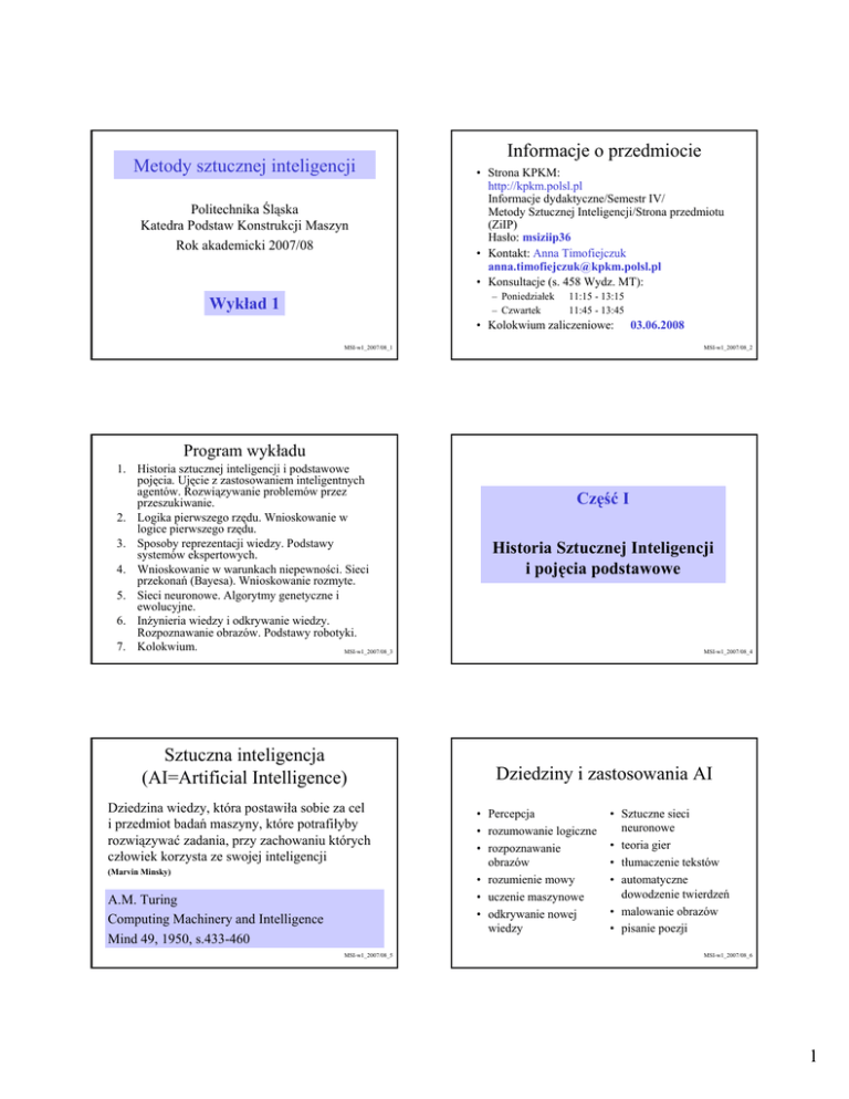 Metody sztucznej inteligencji Informacje o przedmiocie