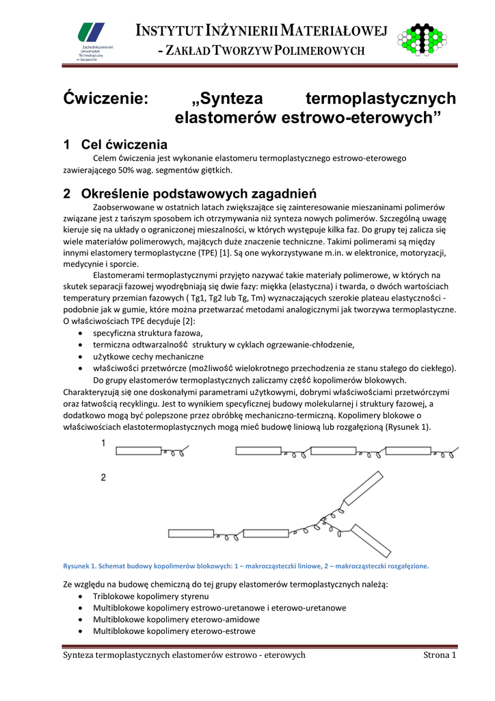 INSTYTUT INŻYNIERII MATERIAŁOWEJ - ZAKŁAD TWORZYW crosoft Word P- OLIMEROWYCH 22.doc Ćwiczenie: „Synteza termoplastycznych elastomerów estrowo-eterowych” 1 Cel ćwiczenia Celem ćwiczenia jest wykonanie elastomeru termoplastycznego estrowo-eterowego zawierającego 50% wag. segmentów giętkich. 2 Określenie podstawowych zagadnień Zaobserwowane w ostatnich latach zwiększające się zainteresowanie mieszaninami polimerów związane jest z tańszym sposobem ich otrzymywania niż synteza nowych polimerów. Szczególną uwagę kieruje się na układy o ograniczonej mieszalności, w których występuje kilka faz. Do grupy tej zalicza się wiele materiałów polimerowych, mających duże znaczenie techniczne. Takimi polimerami są między innymi elastomery termoplastyczne (TPE) [1]. Są one wykorzystywane m.in. w elektronice, motoryzacji, medycynie i sporcie. Elastomerami termoplastycznymi przyjęto nazywać takie materiały polimerowe, w których na skutek separacji fazowej wyodrębniają się dwie fazy: miękka (elastyczna) i twarda, o dwóch wartościach temperatury przemian fazowych ( Tg1, Tg2 lub Tg, Tm) wyznaczających szerokie plateau elastyczności podobnie jak w gumie, które można przetwarzać metodami analogicznymi jak tworzywa termoplastyczne. O właściwościach TPE decyduje [2]: specyficzna struktura fazowa, termiczna odtwarzalność struktury w cyklach ogrzewanie-chłodzenie, użytkowe cechy mechaniczne właściwości przetwórcze (możliwość wielokrotnego przechodzenia ze stanu stałego do ciekłego). Do grupy elastomerów termoplastycznych zaliczamy część kopolimerów blokowych. Charakteryzują się one doskonałymi parametrami użytkowymi, dobrymi właściwościami przetwórczymi oraz łatwością recyklingu. Jest to wynikiem specyficznej budowy molekularnej i struktury fazowej, a dodatkowo mogą być polepszone przez obróbkę mechaniczno-termiczną. Kopolimery blokowe o właściwościach elastotermoplastycznych mogą mieć budowę liniową lub rozgałęzioną (Rysunek 1). Rysunek 1. Schemat budowy kopolimerów blokowych: 1 – makrocząsteczki liniowe, 2 – makrocząsteczki rozgałęzione. Ze względu na budowę chemiczną do tej grupy elastomerów termoplastycznych należą: Triblokowe kopolimery styrenu Multiblokowe kopolimery estrowo-uretanowe i eterowo-uretanowe Multiblokowe kopolimery eterowo-amidowe Multiblokowe kopolimery eterowo-estrowe Synteza termoplastycznych elastomerów estrowo - eterowych Strona 1 INSTYTUT INŻYNIERII MATERIAŁOWEJ - ZAKŁAD TWORZYW crosoft Word P- OLIMEROWYCH 22.doc Kopoli(etero-blok-estry) (PEE lub TPE-E) są bardzo ważną grupą elastomerów termoplastycznych o segmentowej budowie makrocząsteczki (Rysunek 2) Rysunek 2. Ogólny wzór strukturalny PEE. Łączą one w sobie właściwości elastomerów z typowymi właściwościami tworzyw termoplastycznych, takich jak: elastyczność, duża udarność, odporność na warunki atmosferyczne, odporność na chemikalia, łatwość przetwórstwa, możliwość recyklingu Istnieje wiele doniesień literaturowych na temat otrzymywania, budowy i właściwości PEE [ 3-5]. Najczęściej wprowadzanym do kopolimeru segmentem sztywnym jest semikrystaliczny poliester, np. poli(tereftalan-butylenu). Jako giętkie segmenty stosuje się polietery: polioksytetrametylen, rzadziej polioksypropylen i polioksyetylen. Udział i rodzaj segmentu sztywnego ma decydujący wpływ na właściwości termiczne i mechaniczne kopolimeru, dlatego w celu uzyskania kopolimeru odpowiadającego wymaganym potrzebom użytkownik przeprowadza się chemiczne modyfikacje segmentu estrowego. Produkcja kopoli(etero-blok-estrów) rozwija się w ostatnich latach dynamicznie i są one przedmiotem intensywnych badań. Wynika to zapewne z ich bardzo dobrych właściwości. PEE znalazł y szerokie zastosowanie w przemyśle transportowym (zderzaki kolejowe, amortyzatory, gąsienice pojazdów śniegowych, wykładziny węży pożarniczych, węże do paliw płynnych; w przemyśle maszynowym (sprzęgła, łożyska, koła zębate, pokrycia kabli, izolatory); w przemyśle obuwniczym ( wkładki do butów, wyściółki spodów, obcasy); w przemyśle sportowym ( pił ki golfowe, buty i wiązania narciarskie, sprzęt stosowany w sportach zimowych i alpinizmie); w przemyśle włókienniczym (włókna pół plastyczne, folie, żyłki); w przemyśle spożywczym; w medycynie ( nici chirurgiczne, kapsuł ki do leków) [6-8]. 3 Metody 3.1 Polikondensacja w stanie stopionym 3.1.1 Zakres stosowania metody Metodę stosuje się do produkcji elastomerów termoplastycznych. 3.1.2 Materiały do syntezy W syntezie wykorzystuje się następujące substraty: tereftalan dimetylu 1,4 – butanodiol polieter – oligo(1,4-oksytetrametyleno)diol (PTMEG), Mn=1000g/mol Synteza termoplastycznych elastomerów estrowo - eterowych Strona 2 INSTYTUT INŻYNIERII MATERIAŁOWEJ - ZAKŁAD TWORZYW crosoft Word P- OLIMEROWYCH 22.doc stabilizator IRGANOX 1010 octan cynku i kompleks tytanowo-magnezowy jako katalizatory 3.1.3 Opis metody Do nagrzanego reaktora wprowadza się odważone substraty i uruchamia się mieszadło. Po osiągnięciu odpowiedniej temperatury (po ok. 20min) powinien rozpocząć się proces wymiany estrowej (oddestylowanie metanolu). Temperaturę wsadu podnosi się do ok. 190°C. W tym czasie następuje oddestylowanie ok. 95% metanolu (czas reakcji nie powinien przekroczy T 120 min). Po zakończeniu estryfikacji należy zmniejszyć obroty mieszadła, otworzyć reaktor i dodać drugą część katalizatora oraz PTMEG ze stabilizatorem. Następnie zamknąć reaktor, podwyższyć temperaturę do 257°C jednocześnie obniżając ciśnienie aż do 0,2 mmHg. Proces ten prowadzi się w atmosferze azotu przy ciągłym mieszaniu. Produktem ubocznym jest butanodiol. W chwili, gdy polimer osiągnie odpowiednią lepkość (ok. 120 min) należy go wytłoczyć z reaktora pod ciśnieniem azotu. Otrzymany produkt w postaci żyłki granuluje się i poddaje dalszym bad