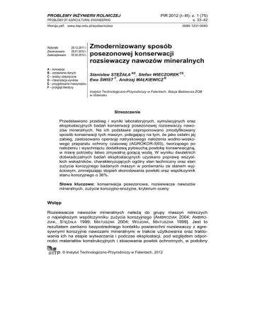 PROBLEMY INŻYNIERII ROLNICZEJ PIR 2012 (I–III): z. 1 (75) s. 33–42 PROBLEMS OF AGRICULTURAL ENGINEERING Wersja pdf: www.itep.edu.pl/wydawnictwo Wpłynęło Zrecenzowano Zaakceptowano 28.12.2011 r. 29.01.2012 r. 02.02.2012 r. A – koncepcja B – zestawienie danych C – analizy statystyczne D – interpretacja wyników E – przygotowanie maszynopisu F – przegląd literatury ISSN 1231-0093 Zmodernizowany sposób posezonowej konserwacji rozsiewaczy nawozów mineralnych Stanisław STĘŻAŁA AD, Stefan WIECZOREK CE, Ewa ŚWIST F, Andrzej MAŁKIEWICZ B Instytut Technologiczno-Przyrodniczy w Falentach, Stacja Badawcza ŻOB w Gdańsku Streszczenie Przedstawiono przebieg i wyniki laboratoryjnych, symulacyjnych oraz eksploatacyjnych badań konserwacji posezonowej rozsiewaczy nawozów mineralnych. Na ich podstawie zaproponowano zmodyfikowany sposób konserwacji tych maszyn, polegający na tym, że jako ostatni jej zabieg, zastosowano operację natryskowego nałożenia wodno-woskowego preparatu ochrony czasowej (AGROKOR-S93), tworzącego po nałożeniu i wyschnięciu dodatkową pyłosuchą powłokę konserwacyjną, w miarę potrzeby łatwo zmywalną gorącą wodą. W wyniku dwuletnich doświadczalnych badań eksploatacyjnych uzyskano poprawę wszystkich wskaźników, charakteryzujących ogólny stan techniczny oraz stan zużycia korozyjnego badanych maszyn w porównaniu ze stanem wyjściowym, zmniejszając stopień skorodowania powłoki oraz współczynnik stanu korozyjnego o 36%. Słowa kluczowe: konserwacja posezonowa, rozsiewacze nawozów mineralnych, zużycie korozyjno-erozyjne, kryterium oceny Wstęp Rozsiewacze nawozów mineralnych należą do grupy maszyn rolniczych o największym współczynniku zużycia korozyjnego [AMBROZIAK 2004; AMBROZIAK, STĘŻAŁA 1999; MATUSZAK 2004; WOJDAK, MATUSZAK 1999]. Jest to rezultatem zarówno bezpośredniego kontaktu powierzchni rozsiewaczy z agresywnymi korozyjnie nawozami mineralnymi w trakcie użytkowania oraz traktowania ich na etapie wytwarzania i podczas eksploatacji, pod względem odporności materiałów konstrukcyjnych i stosowania powłok ochronnych, w podobny © Instytut Technologiczno-Przyrodniczy w Falentach, 2012 Stanisław Stężała i in. sposób, jak pozostałe maszyny rolnicze (jakość powłok ochronnych i sposób przeprowadzania konserwacji). Dlatego o ile tradycyjna konserwacja innych maszyn rolniczych zmniejsza wskaźniki ich zużycia korozyjnego, szczególnie w okresach międzysezonowego przechowywania, to w przypadku rozsiewaczy nawozów mineralnych są one nadal wysokie [AMBROZIAK 2004; MATUSZAK 2004]. Celem pracy było udoskonalenie dotychczas zalecanej (chociaż nie zawsze w pełni przez użytkowników stosowanej) tradycyjnej metody konserwacji posezonowej maszyn rolniczych, w tym konserwacji rozsiewaczy nawozów mineralnych [WOJDAK 1980; WOJDAK, MATUSZAK 1999]. Założono, że zmodernizowana metoda, tylko nieznacznie zwiększająca koszty materiałów i robocizny, powinna zmniejszyć stopień zużycia korozyjnego szczególnie narażonych na takie zużycie maszyn, od średniej wartości współczynnika stanu korozyjnego α = 0,6 do α = 0,4 [AMBROZIAK 2004; MATUSZAK 2004], a tym samym zwiększyć ich trwałość użytkową i zmniejszyć częstotliwość napraw bieżących [STĘŻAŁA i in. 2008]. Zakres, metody i przebieg badań Badania przeprowadzono metodą eksperymentu czynnego w warunkach laboratoryjnych oraz w naturalnych warunkach eksploatacyjnych. Badania laboratoryjne Celem badań laboratoryjnych był dobór malarskich powłok ochronnych o zwiększonej odporności na zużycie korozyjno-erozyjne w porównaniu z powłokami stosowanymi przez producentów rozsiewaczy, ze wskazaniem na zastosowanie ich zarówno w fazie produkcji, jak i w trakcie renowacji eksploatacyjnej. Oceniano jakość czterech zestawów powłok malarskich, stosowanych lub możliwych do stosowania przez producentów rozsiewaczy do ich ochrony przed zużyciem korozyjno-erozyjnym. Zestaw I 1. Temacoat GPL-S PRIMER – dwuskładnikowy, grubowarstwowy grunt epoksydowy, utwardzany poliamidem – 2 warstwy. 2. Temadur 90 – dwuskładnikowa, poliuretanowa farba nawierzchniowa, utwardzana izocyjanianem alifatycznym – 2 warstwy. Zestaw II 1. Temaprime EUR – szybkoschnący, pigmentowany antykorozyjnie podkład alkidowy – 2 warstwy. 2. Temalak ML90 – wysokopołyskowa, alkidowa farba nawierzchniowa – 2 warstwy. Zestaw III 1. Podkład poliuretanowy do metalu – wyrób dwuskładnikowy – 2 warstwy. 2. Nobiakrylak – emalia poliuretanowa akrylowa, dwuskładnikowa – 2 warstwy. 34 © ITP w Falentach; PIR 2012 (I–III): z. 1 (75) Zmodernizowany sposób posezonowej konserwacji rozsiewaczy... Zestaw IV 1. Podkład elektroforetyczny. 2. Podkład epoksydowy chemoodporny. 3. Emalia epoksydowa chemoodporna. Badania laboratoryjne prowadzono jako badania symulacyjne, na podstawie metodyki opracowanej w IBMER, Oddział w Gdańsku, gdzie jako dominującymi czynnikami, wpływającymi na degradację powłoki ochronnej, były procesy zużywania korozyjnego, mechanicznego (erozyjnego) i starzeniowego [STĘŻAŁA i in. 2006]. Jakość powłok oceniano na podstawie wyników wartości modułu impedancji, wyznaczanego metodą elektrochemicznej spektroskopii impedancyjnej [SCULLY, HENSLEY 1994]. Jako kryterium oceny, kwalifikujące powłoki do stosowania w rozsiewaczach nawozów mineralnych, przyjęto 5 cykli badawczych [STĘŻAŁA i in. 2006], po zakończeniu których wyznaczany moduł impedancji wyniósł nie mniej niż |Z| = 106 Ω·cm2, przy czym im większa liczba cykli spowoduje osiągnięcie wartości |Z| ≥ 106 Ω·cm2, tym lepszymi własnościami ochronnymi w warunkach praktycznego użytkowania charakteryzować się będzie powłoka ochronna. Powłokę spełniającą przyjęte kryterium kwalifikacyjne wytypowano do badań eksploatacyjnych. Badania eksploatacyjne Prowadzono je w okresie od listopada 2008 r. do października 2010 r. w dwóch gospodarstwach ro