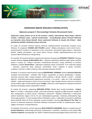 Informacja prasowa, 1 sierpnia 2013 r. WARSZAWA BĘDZIE WIELOKULTUROWĄ WYSPĄ Ogłaszamy program 9. Warszawskiego Festiwalu Skrzyżowanie Kultur Tegoroczna edycja potrwa od 25 do 29 września i pokaże różnorodność Wysp Świata. Zabrzmi muzyka z dziesięciu wysp i czterech kontynentów - od gardłowego śpiewu Ameryki Północnej po maoryskie rytmy Nowej Zelandii. Nowe wydarzenie festiwalu to Sounds Like Poland – dzień poświęcony polskiej i światowej muzyce etnicznej. W środę, 25 września festiwal otworzy pierwsza międzynarodowa prezentacja krajowej sceny folkowej. W programie SOUNDS LIKE POLAND: panele i debaty poświęcone scenie world music i pozycji polskich artystów na światowym rynku muzycznym. Rozmawiać będą eksperci z kilkunastu państw, zagrają wschodzący i już uznani polscy muzycy. Projekt współorganizowany jest przez Instytut Adama Mickiewicza. Wstęp wolny. W czwartek, 26 września koncerty zagranicznych gwiazd zainaugurują STRAŻNICY TRADYCJI. Wystąpi kwartet wokalny Tenores di Bitti Mialinu Pira - znakomici wykonawcy polifonicznego śpiewu Sardynii sprzed 3 tysięcy lat. Tradycje rdzennych mieszkańców Reunionu, wyspy położonej na Oceanie Indyjskim, przybliży Danyel Waro - legendarny wokalista, poeta i buntownik. To on wskrzesił maloya – powolny, oceaniczny blues dawnych niewolników. Waro zaśpiewa w języku kreolskim o polityce i rasizmie, a także o kulturze, która pozwala zachować wolność. W piątek, 27 września scenę festiwalu opanują MISTRZOWIE I SZAMANI. Podczas Koncertu Mistrzów wystąpią instrumentaliści i wokaliści kilku krajów: specjalistki od śpiewu gardłowego z Kanady, maoryscy tancerze haka z Nowej Zelandii, suficki wokalista z Dżerby, flecista z Sycylii i irlandzki bębniarz. Wcześniej poprowadzą tygodniowe warsztaty, a na scenie – tylko raz w tak niezwykłym składzie - będą improwizować i łączyć etniczne brzmienia. Tego samego wieczoru taneczną i funkową wersję maloya zagra ośmioosobowa grupa Lindigo z Reunionu, która doprawia tradycyjne brzmienie Reunionu brazylijską sambą i afrykańskim rytmem. W sobotę, 28 września, zaśpiewają KRÓLOWE RYTMU. Wielka diwa muzyki karaibskiej - Calypso Rose, to 73-latka o niespożytej energii i scenicznej charyzmie. Nagrała już 800 piosenek, wydała 20 płyt, występowała na jednej scenie z Marleyem, Jacksonem i Makebą. Publiczności w Warszawie pokaże żywiołowe calypso. Od lat 70. jest niedoścignioną gwiazdą i światową ambasadorką tego tanecznego gatunku. Po niej wystąpi Moana Maniapoto, jedna z najbardziej wyrazistych wokalistek Nowej Zelandii, która od 10 lat występuje z grupą muzyków i tancerzy jako Moana & The Tribe. Ich utwory to starannie wyważona mieszanka dawnych maoryskich brzmień ze współczesnym soulem, reggae, hip-hopem i muzyką klasyczną. W niedzielę, 29 września, na finał usłyszymy GŁOS CZARNYCH KARAIBÓW. Będzie to wspólny koncert Aurelio Martineza, znakomitego perkusisty, kompozytora i wokalisty z Hondurasu oraz zespołu The Garifuna Collective wywodzącego się z Belize. Wspólnie popularyzują bogatą kulturę Garifunów, czyli „Czarnych Karaibów”, którzy wywodzą się z Afryki i tworzą dziś społeczność złożoną z 600 tys. osób rozproszonych w kilku krajach. Muzyki artystów tegorocznej edycji można posłuchać na: https://soundcloud.com/wfsk Koncerty 9. Warszawskiego Festiwalu Skrzyżowanie Kultur odbędą się w namiocie przed Pałacem Kultury i Nauki. Dziś rusza sprzedaż biletów. Wejście na jeden dzień koncertowy kosztuje 30 zł, a karnet na wszystkie wydarzenia festiwalu - 90 zł. Bilety i karnety można kupować: - w sieci eBilet - w salonach Empik - w biurze festiwalowym mieszczącym się w Stołecznej Estradzie (ul. Marszałkowska 77/79; pon.-pt., godz. 10-17). Warszawski Festiwal Skrzyżowanie Kultur, poświęcony prezentacji wielokulturowości i różnorodności świata, odbywa się od 2005 r. W wydarzeniu wzięło dotąd 170 artystów z 54 krajów. Festiwal jest wydarzeniem o randze międzynarodowej, rekomendowanym przez prestiżowy magazyn „Songlines” jako jedno z 25 najciekawszych wydarzeń muzyki świata. Program tworzy Rada Programowa w składzie: Maria Pomianowska – Dyrektor Artystyczna, Maciej Szajkowski, Marta Dobosz. Organizatorem wydarzenia jest Stołeczna Estrada. Festiwal powstaje dzięki finansowemu wsparciu Urzędu m. st. Warszawy. Informacji udziela: Go Culture. Komunikacja dla kultury Katarzyna Petrykowska t: + 48 790 797 611, 22 499 10 20 [email protected] Paulina Wilk t: + 48 790 797 610, 22 416 53 37 [email protected] PROGRAM 9. WARSZAWSKIEGO FESTIWALU SKRZYŻOWANIE KULTUR. WYSPY ŚWIATA 25.09 (środa) SOUNDS LIKE POLAND Muzyka etniczna w Polsce i na świecie: panele / rozmowy / muzyka na żywo wstęp wolny 26.09 (czwartek), godz. 19.30 STRAŻNICY TRADYCJI Tenores di Bitti Mialinu Pira (Sardynia) Danyel Waro (Reunion) 27.09 (piątek), godz. 19.00 MISTRZOWIE I SZAMANI Koncert Mistrzów Lindigo (Reunion) 28.09 (sobota), godz. 19.00 KRÓLOWE RYTMU Calypso Rose (Trynidad i Tobago) Moana & The Tribe (Nowa Zelandia) 29.09 (niedziela), godz. 19.00 GŁOSY CZARNYCH KARAIBÓW The Garifuna Collective (Belize) & Aurelio Martinez (Honduras) Wejdź na: www.festival.warszawa.pl oraz na www.facebook.com/SkrzyzowanieKultur
