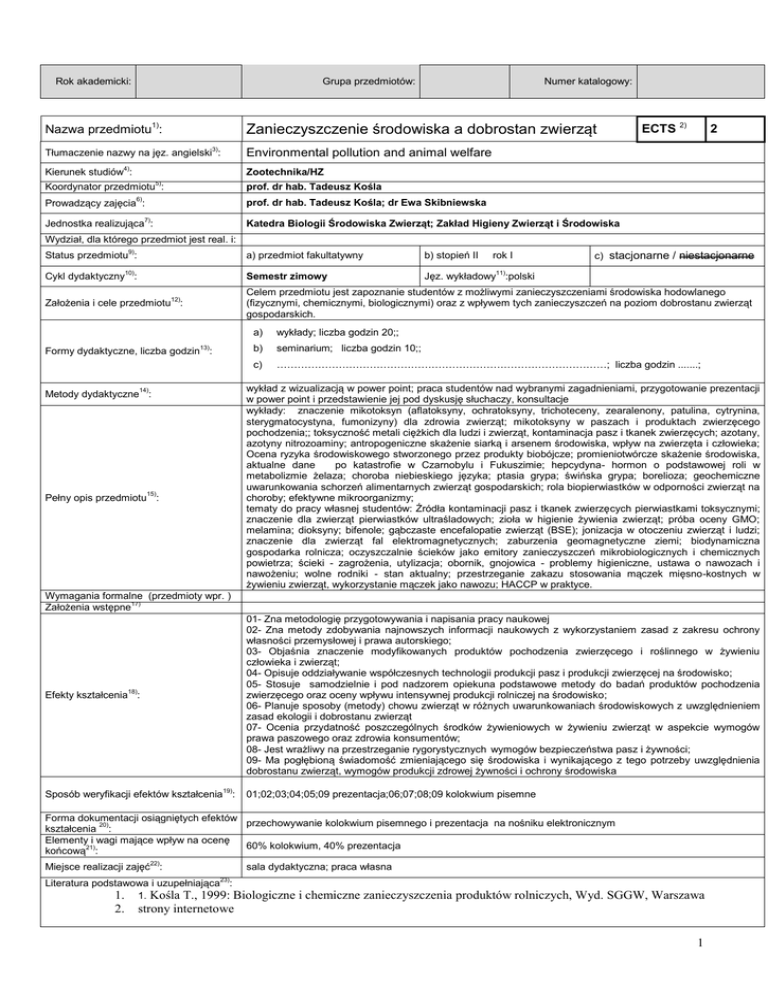 Grupa przedmiotów: Rok akademicki: Numer katalogowy: Nazwa przedmiotu1): Zanieczyszczenie środowiska a dobrostan zwierząt Tłumaczenie nazwy na jęz. angielski3): Environmental pollution and animal welfare 4) Kierunek studiów : Zootechnika/HZ Koordynator przedmiotu5): prof. dr hab. Tadeusz Kośla Prowadzący zajęcia6): prof. dr hab. Tadeusz Kośla; dr Ewa Skibniewska Jednostka realizująca7): Katedra Biologii Środowiska Zwierząt; Zakład Higieny Zwierząt i Środowiska ECTS 2) 2 Wydział, dla którego przedmiot jest real. i: Status przedmiotu9): a) przedmiot fakultatywny b) stopień II Cykl dydaktyczny10): Semestr zimowy Jęz. wykładowy11):polski Założenia i cele przedmiotu12): Celem przedmiotu jest zapoznanie studentów z możliwymi zanieczyszczeniami środowiska hodowlanego (fizycznymi, chemicznymi, biologicznymi) oraz z wpływem tych zanieczyszczeń na poziom dobrostanu zwierząt gospodarskich. 13) Formy dydaktyczne, liczba godzin : Metody dydaktyczne14): Pełny opis przedmiotu15): rok I c) stacjonarne / niestacjonarne a) wykłady; liczba godzin 20;; b) seminarium; liczba godzin 10;; c) ……………………………………………………………………………………; liczba godzin .......; wykład z wizualizacją w power point; praca studentów nad wybranymi zagadnieniami, przygotowanie prezentacji w power point i przedstawienie jej pod dyskusję słuchaczy, konsultacje wykłady: znaczenie mikotoksyn (aflatoksyny, ochratoksyny, trichoteceny, zearalenony, patulina, cytrynina, sterygmatocystyna, fumonizyny) dla zdrowia zwierząt; mikotoksyny w paszach i produktach zwierzęcego pochodzenia;; toksyczność metali ciężkich dla ludzi i zwierząt, kontaminacja pasz i tkanek zwierzęcych; azotany, azotyny nitrozoaminy; antropogeniczne skażenie siarką i arsenem środowiska, wpływ na zwierzęta i człowieka; Ocena ryzyka środowiskowego stworzonego przez produkty biobójcze; promieniotwórcze skażenie środowiska, aktualne dane po katastrofie w Czarnobylu i Fukuszimie; hepcydyna- hormon o podstawowej roli w metabolizmie żelaza; choroba niebieskiego języka; ptasia grypa; świńska grypa; borelioza; geochemiczne uwarunkowania schorzeń alimentarnych zwierząt gospodarskich; rola biopierwiastków w odporności zwierząt na choroby; efektywne mikroorganizmy; tematy do pracy własnej studentów: Źródła kontaminacji pasz i tkanek zwierzęcych pierwiastkami toksycznymi; znaczenie dla zwierząt pierwiastków ultraśladowych; zioła w higienie żywienia zwierząt; próba oceny GMO; melamina; dioksyny; bifenole; gąbczaste encefalopatie zwierząt (BSE); jonizacja w otoczeniu zwierząt i ludzi; znaczenie dla zwierząt fal elektromagnetycznych; zaburzenia geomagnetyczne ziemi; biodynamiczna gospodarka rolnicza; oczyszczalnie ścieków jako emitory zanieczyszczeń mikrobiologicznych i chemicznych powietrza; ścieki - zagrożenia, utylizacja; obornik, gnojowica - problemy higieniczne, ustawa o nawozach i nawożeniu; wolne rodniki - stan aktualny; przestrzeganie zakazu stosowania mączek mięsno-kostnych w żywieniu zwierząt, wykorzystanie mączek jako nawozu; HACCP w praktyce. Wymagania formalne (przedmioty wpr. ) Założenia wstępne17) Efekty kształcenia18): 01- Zna metodologię przygotowywania i napisania pracy naukowej 02- Zna metody zdobywania najnowszych informacji naukowych z wykorzystaniem zasad z zakresu ochrony własności przemysłowej i prawa autorskiego; 03- Objaśnia znaczenie modyfikowanych produktów pochodzenia zwierzęcego i roślinnego w żywieniu człowieka i zwierząt; 04- Opisuje oddziaływanie współczesnych technologii produkcji pasz i produkcji zwierzęcej na środowisko; 05- Stosuje samodzielnie i pod nadzorem opiekuna podstawowe metody do badań produktów pochodzenia zwierzęcego oraz oceny wpływu intensywnej produkcji rolniczej na środowisko; 06- Planuje sposoby (metody) chowu zwierząt w różnych uwarunkowaniach środowiskowych z uwzględnieniem zasad ekologii i dobrostanu zwierząt 07- Ocenia przydatność poszczególnych środków żywieniowych w żywieniu zwierząt w aspekcie wymogów prawa paszowego oraz zdrowia konsumentów; 08- Jest wrażliwy na przestrzeganie rygorystycznych wymogów bezpieczeństwa pasz i żywności; 09- Ma pogłębioną świadomość zmieniającego się środowiska i wynikającego z tego potrzeby uwzględnienia dobrostanu zwierząt, wymogów produkcji zdrowej żywności i ochrony środowiska Sposób weryfikacji efektów kształcenia19): 01;02;03;04;05;09 prezentacja;06;07;08;09 kolokwium pisemne Forma dokumentacji osiągniętych efektów przechowywanie kolokwium pisemnego i prezentacja na nośniku elektronicznym kształcenia 20): Elementy i wagi mające wpływ na ocenę 60% kolokwium, 40% prezentacja końcową21): Miejsce realizacji zajęć22): sala dydaktyczna; praca własna Literatura podstawowa i uzupełniająca23): 1. 1. Kośla T., 1999: Biologiczne 2. i chemiczne zanieczyszczenia produktów rolniczych, Wyd. SGGW, Warszawa strony internetowe 1 UWAGI24): Literatura podstawowa i uzupełniająca: Opis modułu kształcenia / przedmiotu (sylabus) Wskaźniki ilościowe charakteryzujące moduł/przedmiot 25) : Szacunkowa sumaryczna liczba godzin pracy studenta (kontaktowych i pracy własnej) niezbędna dla osiągnięcia zakładanych efektów kształcenia18) - na tej podstawie należy wypełnić pole ECTS2: 50 h Łączna liczba punktów ECTS, którą student uzyskuje na zajęciach wymagających bezpośredniego udziału nauczycieli akademickich: 1,5 ECTS Łączna liczba punktów ECTS, którą student uzyskuje w ramach zajęć o charakterze praktycznym, takich jak zajęcia laboratoryjne, projektowe, itp.: 0,5 ECTS Tabela zgodności kierunkowych efektów kształcenia efektami przedmiotu Nr /symbol efektu 01 02 03 04 05 26) Wymienione w wierszu efekty kształcenia: Zna metodologię przygotowywania i napisania pracy naukowej Zna metody zdobywania najnowszych informacji naukowych z wykorzystaniem zasad z zakresu ochrony 