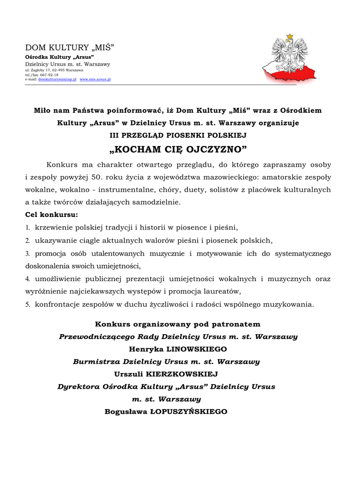 DOM KULTURY „MIŚ” Ośrodka Kultury „Arsus” Dzielnicy Ursus m. st. Warszawy ul. Zagłoby 17, 02-495 Warszawa tel./fax. 667-92-18 e-mail: [email protected] www.mis.arsus.pl Miło nam Państwa poinformować, iż Dom Kultury „Miś” wraz z Ośrodkiem Kultury „Arsus” w Dzielnicy Ursus m. st. Warszawy organizuje III PRZEGLĄD PIOSENKI POLSKIEJ „KOCHAM CIĘ OJCZYZNO” Konkurs ma charakter otwartego przeglądu, do którego zapraszamy osoby i zespoły powyżej 50. roku życia z województwa mazowieckiego: amatorskie zespoły wokalne, wokalno - instrumentalne, chóry, duety, solistów z placówek kulturalnych a także twórców działających samodzielnie. Cel konkursu: 1. krzewienie polskiej tradycji i historii w piosence i pieśni, 2. ukazywanie ciągle aktualnych walorów pieśni i piosenek polskich, 3. promocja osób utalentowanych muzycznie i motywowanie ich do systematycznego doskonalenia swoich umiejętności, 4. umożliwienie publicznej prezentacji umiejętności wokalnych i muzycznych oraz wyróżnienie najciekawszych występów i promocja laureatów, 5. konfrontacje zespołów w duchu życzliwości i radości wspólnego muzykowania. Konkurs organizowany pod patronatem Przewodniczącego Rady Dzielnicy Ursus m. st. Warszawy Henryka LINOWSKIEGO Burmistrza Dzielnicy Ursus m. st. Warszawy Urszuli KIERZKOWSKIEJ Dyrektora Ośrodka Kultury „Arsus” Dzielnicy Ursus m. st. Warszawy Bogusława ŁOPUSZYŃSKIEGO Konkurs przygotowany jest w jednej kategorii wiekowej: 50+ oraz w pięciu kategoriach muzycznych: soliści - wokaliści duety zespoły wokalno – instrumentalne (ocenie jury podlegają tylko wykonawcy - seniorzy) zespoły wokalne do 20 osób chóry Akompaniator lub instruktor wspomagający zespół nie podlega ocenie jury. Akompaniament zapewnia wykonawca. Wszyscy biorący udział w przesłuchaniach konkursowych mogą korzystać z półplaybacków nagranych wyłącznie na płytach CD, akompaniamentu na żywo bądź śpiewu a’capella. Preferowany akompaniament na żywo. Pełne playbacki będą dyskwalifikować wykonawcę. Soliści, członkowie duetów oraz zespołów wokalnych nie mogą wchodzić w skład innych zespołów! Repertuar Repertuar stanowić powinny piosenki i pieśni polskie. Każdy z uczestników przygotowuje dwa dowolne utwory z akompaniamentem lub podkładem muzycznym przygotowanym we własnym zakresie o łącznym czasie nieprzekraczającym 8 min. W przypadku prezentowanych dużej liczby utworów do zgłoszeń jednego. organizator Uczestnicy może ograniczyć nieposiadający ilość instrumentu muzycznego będą mieli możliwość uzyskania w tym zakresie pomocy ze strony Domu Kultury po uprzednim zgłoszeniu w karcie uczestnictwa. Organizator zapewnia kompletne nagłośnienie w zależności od wymagań uczestnika. Kryteria oceny uczestników konkursu dobór repertuaru zgodny z formułą przeglądu, poziom warsztatu wykonawczego, interpretacja prezentowanych utworów, ogólny wyraz artystyczny. Termin i miejsce konkursu Przesłuchania odbędą się w Ośrodku Kultury „Arsus" - sala widowiskowa, Warszawa ul. Traktorzystów 14: 13 kwietnia (poniedziałek) 2015 r. od godz. 1000. Szczegółowy plan przesłuchań dostępny będzie na stronie internetowej www.mis.arsus.pl Wyniki kwalifikacji do konkursu finałowego będą dostępne na stronie internetowej www.mis.arsus.pl lub telefonicznie 22 667 92 18 - 15.04.2015 r. Karty uczestnictwa należy przesłać lub dostarczyć osobiście do dnia 06 kwietnia 2015 roku na adres: Dom Kultury „Miś”, 02-495 Warszawa, ul. Zagłoby 17 „Kocham Cię Ojczyzno” tel. 22 667 92 18, fax 22 667 92 18, e-mail: [email protected] Kwota „wpisowego” od jednego zgłoszenia wynosi: (dla osób indywidualnych 10 zł; zespół lub chór 30 zł). Wpłaty należy dokonać na konto Ośrodka Kultury „Arsus” 02-495 Warszawa, ul. Traktorzystów 14: Bank PKO S.A. O/ Warszawa 83 1240 2887 1111 0010 0357 8215 z dopiskiem: „Opłata wpisowa – „Kocham Cię Ojczyzno” do dnia 06 kwietnia 2015 r. Opłata nie podlega zwrotowi, gdy uczestnik nie stawi się w dniu przesłuchania. Nagrody konkursowe Jury III Przeglądu Piosenki Polskiej „Kocham Cię Ojczyzno” przyzna po trzy nagrody w każdej kategorii muzycznej. W uzasadnionych przypadkach i w porozumieniu z organizatorem jury ma prawo przyznać indywidualne nagrody i wyróżnienia. Warunkiem otrzymania nagrody przyznanej wykonawcy przez jury jest gotowość uczestnictwa w Koncercie Laureatów, który odbędzie się 18 kwietnia 2015 roku o godzinie 15O0 w sali widowiskowej Ośrodka Kultury „Arsus”, Warszawa ul. Traktorzystów 14. Dane osobowe umieszczane na kartach zgłoszeniowych zgodnie z ustawą o ochronie danych osobowych będą wykorzystane jedynie do celów przeglądu i nie będą udostępniane osobom trzecim. Informacje Szczegółowych informacji udziela opiekun konkursu Bogdan Kałużny; Dom Kultury „Miś” ul. Zagłoby 17; 02-495 Warszawa kom. 0 603 518 464, tel. 22 667 92 18. Powyższa informacja będzie dostępna również na stronie internetowej organizatora w załączniku: III Przegląd Piosenki Polskiej „Kocham Cię Ojczyzno”. Zapraszamy do udziału! Warszawa, 03.02.2015 r. III PRZEGLĄD PIOSENKI POLSKIEJ „KOCHAM CIĘ OJCZYZNO” KARTA ZGŁOSZENIOWA PROSIMY WYPEŁNIĆ PISMEM DRUKOWANYM Nazwa placówki zgłaszającej (adres, telefon/faks/e-mail) ……………………………………………………………………………… ……………..……………………………………………………………….. ..…………………………………………………………………………….. …………………………………………………………………………….. Imię i nazwisko lub nazwa zespołu (w przypadku zespołu podać ilość osób) ……………………………………………………………………………… ………………………………………………………………………
