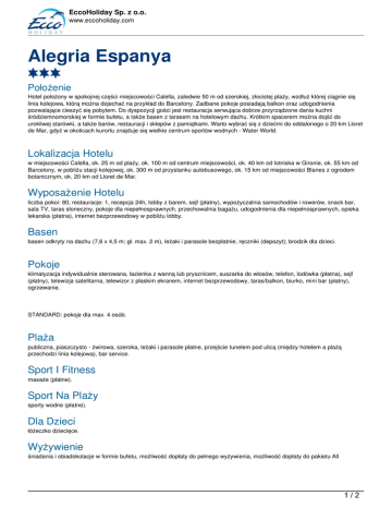 EccoHoliday Sp. z o.o. www.eccoholiday.com Alegria Espanya Położenie Hotel położony w spokojnej części miejscowości Calella, zaledwie 50 m od szerokiej, złocistej plaży, wzdłuż której ciągnie się linia kolejowa, którą można dojechać na przykład do Barcelony. Zadbane pokoje posiadają balkon oraz udogodnienia pozwalające cieszyć się pobytem. Do dyspozycji gości jest restauracja serwująca dobrze przyrządzone dania kuchni śródziemnomorskiej w formie bufetu, a także basen z tarasem na hotelowym dachu. Krótkim spacerem można dojść do urokliwej starówki, a także barów, restauracji i sklepów z pamiątkami. Warto wybrać się z dziećmi do oddalonego o 20 km Lloret de Mar, gdyż w okolicach kurortu znajduje się wielkie centrum sportów wodnych - Water World. Lokalizacja Hotelu w miejscowości Calella, ok. 25 m od plaży, ok. 100 m od centrum miejscowości, ok. 40 km od lotniska w Gironie, ok. 55 km od Barcelony, w pobliżu stacji kolejowej, ok. 300 m od przystanku autobusowego, ok. 15 km od miejscowości Blanes z ogrodem botanicznym, ok. 20 km od Lloret de Mar. Wyposażenie Hotelu liczba pokoi: 80, restauracje: 1, recepcja 24h, lobby z barem, sejf (płatny), wypożyczalnia samochodów i rowerów, snack bar, sala TV, taras słoneczny, pokoje dla niepełnosprawnych, przechowalnia bagażu, udogodnienia dla niepełnosprawnych, opieka lekarska (płatna), internet bezprzewodowy w pobliżu lobby. Basen basen odkryty na dachu (7,6 x 4,5 m; gł. max. 2 m), leżaki i parasole bezpłatnie, ręczniki (depozyt); brodzik dla dzieci. Pokoje klimatyzacja indywidualnie sterowana, łazienka z wanną lub prysznicem, suszarka do włosów, telefon, lodówka (płatna), sejf (płatny), telewizja satelitarna, telewizor z płaskim ekranem, internet bezprzewodowy, taras/balkon, biurko, mini bar (płatny), ogrzewanie. STANDARD: pokoje dla max. 4 osób. Plaża publiczna, piaszczysto - żwirowa, szeroka, leżaki i parasole płatne, przejście tunelem pod ulicą (między hotelem a plażą przechodzi linia kolejowa), bar service. Sport I Fitness masaże (płatne). Sport Na Plaży sporty wodne (płatne). Dla Dzieci łóżeczko dziecięce. Wyżywienie śniadania i obiadokolacje w formie bufetu, możliwość dopłaty do pełnego wyżywienia, możliwość dopłaty do pakietu All 1/2 EccoHoliday Sp. z o.o. www.eccoholiday.com Inclusive. All Inclusive Zawiera śniadanie (8.00 - 11.00), lunch (12.30 - 15.00) i kolację (18.30 - 21.00); lokalne alkohole i napoje bezalkoholowe od 11.00 23.00; przekąski serwowane między głównymi posiłkami; alkohole importowane dodatkowo płatne; wymagane noszenie opaski all inclusive (depozyt 10 EUR). Oferta: Wylot 01.01.1970 Powrót 01.01.1970 godz. godz. Zakwaterowanie -() Dni dni Cena os. dorosła 2/2 Powered by TCPDF (www.tcpdf.org)