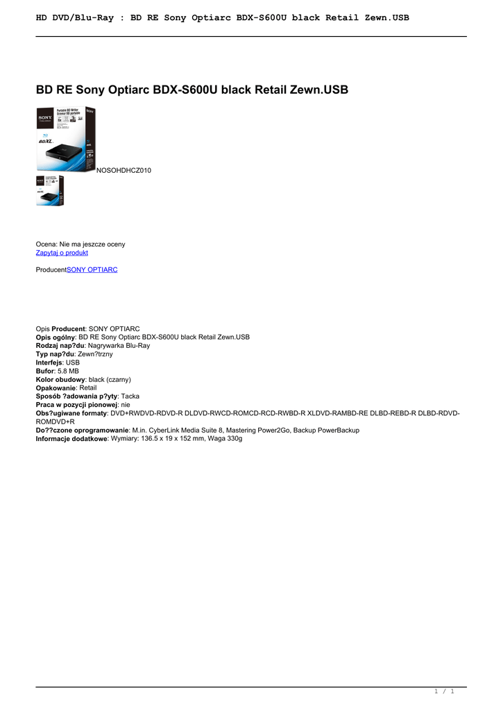 HD DVD/Blu-Ray : BD RE Sony Optiarc BDX-S600U black Retail Zewn.USB BD RE Sony Optiarc BDX-S600U black Retail Zewn.USB NOSOHDHCZ010 Ocena: Nie ma jeszcze oceny Zapytaj o produkt ProducentSONY OPTIARC Opis Producent: SONY OPTIARC Opis ogólny: BD RE Sony Optiarc BDX-S600U black Retail Zewn.USB Rodzaj nap?du: Nagrywarka Blu-Ray Typ nap?du: Zewn?trzny Interfejs: USB Bufor: 5.8 MB Kolor obudowy: black (czarny) Opakowanie: Retail Sposób ?adowania p?yty: Tacka Praca w pozycji pionowej: nie Obs?ugiwane formaty: DVD+RWDVD-RDVD-R DLDVD-RWCD-ROMCD-RCD-RWBD-R XLDVD-RAMBD-RE DLBD-REBD-R DLBD-RDVDROMDVD+R Do??czone oprogramowanie: M.in. CyberLink Media Suite 8, Mastering Power2Go, Backup PowerBackup Informacje dodatkowe: Wymiary: 136.5 x 19 x 152 mm, Waga 330g 1 / 1 Powered by TCPDF (www.tcpdf.org)