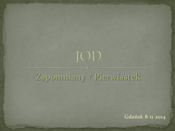 Zapomniany ? Pierwiastek Gdańsk 8 11 2014 Odkrycie jodu 1811 r 1820 – 40r rozkwit zastosowań – niemalże wszystkie przypadłości - i tak do pierwszej połowy XX wieku 1819r Coindet – 250 mg jodu u 150 pacjentów z wolem tarczycy, redukcja wola w ciągu tygodnia ; Encyklopedia Brytannica 1910/11 - informacja o dawkach 300 - 1800 mg/d jodu – czwartorzędowa kila – tu dawki gramowe choroba Graves-Basedowa 80 - 90 mg , prewencja wola, ale i miażdżyca, zatrucie metalami, infekcje skórne, astma, bronchity, paraliże Jako podstawowa forma płyn Lugola, dawki profilaktyczne - szeroko stosowane 12,5 - 37,5 mg Tinctura Iodii Compositum dawka podstawowa „Minim” – 1 kropla = 6,25mg jodu w okresie powojennym - odwrót od powszechnego leczenia jodem 1948/49 – prace Wolffa - Chaikoffa, koncepcja hamowania tarczycy (przejściowego) większymi dawkami jodu , ustalenie 2 mg za potencjalnie niebezpieczną, a RDA na poziomie 200ug 1968 rok (dawka dzienna jodu w diecie Japończyka to 1518mg/d) Powszechne skupienie się wyłącznie na tarczycy wprowadzenie jodowania soli –od 1920r 1993 Ghent Norweski ginekolog publikuje swoje doświadczenia w leczeniu zmian włóknisto torbielowatych piersi u 1300 pacjentek dawka 0,1mg/kg masy ciała (7,5mg/75kg) -rok suplementacji, ustąpienie zmian, brak efektu WolffaChaikoffa. odkrycie symporterów sodowo jodowych (NIS) – glikoprotein błony komórkowej transportujące jod tarczyca ale i tkanki pozatarczycowe -trzustka, wątroba, błona sluzowa żołądka, jelit, -sluzówka nosa, gardła, krtani, gruczoły łzowe, ślinianki -łożysko -gruczoły piersiowe , jajniki, prostata, nadnercza, k-ki nerwowe -mięsnie, tkanka tłuszczowa, -skóra, komórki krwi Ile jodu potrzebuje cały organizm? gruczoł piersiowy -wychwyt jodu przez prawidłowej struktury piersi porównywalny z wychwytem dobowym tarczycy. -Piersi zmienione – wychwytują jod intensywniej, co może wskazywać na niedobór jodu w nieprawidłowych gruczołach. - Badania na tkance gryzoni ale i ludzi – niedobór jodu prowadzi do powstania komórek atypowych, a nawet nowotworowych; zwiększona jest wówczas wrażliwość komórek na estradiol; pośrednio przez balansowanie estrogenów, aktywność onkogenu BRCA1 - Slinianki – produkuja T1, T2 – nie paruja ich do T3,T4 Poza tarczycowa produkcja T4 -Szczury pozbawione tarczycy – syntetyzują hormony tarczycy (T4) przy dawce 25mg/kg jodu ( porównywalna dawka dla człowieka 1,75 g jodu) – odwracał się negatywny efekt braku hormonu na wzrost, nadnercza, jajniki, czy jadra... -LEUKOCYTY - ludzkie syntetyzują T4 w czasie fagocytozy przy inkubacji w środowisku o stężeniu 10-6 M jodu . Obserwowano nadczynność tarczycy z wytrzeszczem w białaczce. komórki gruczołów ślinowych, żołądka, utleniają I organifikują jod , syntetyzują jodolipidy, T1, T2. Ślinianki – tu stezenie 20-40x wyższe niż w surowicy Fluor, brom – zaburzają ten transport, tiocyjanki zaburzają transport I utylizację jodu (dym papieros) Jod moduluje odpowiedź nadnerczy na stres, poprawia funkcje immunologiczne. Sugestia roli jodu w ochronie DNA przed uszkodzeniem wolnorodnikowym w każdej komórce (jodolaktony) przy odpowiednim poziomie jodu w surowicy krwi. 2000-2004r Abraham I inni – próba oceny zapotrzebowanie całego organizmu na jod. – pacjenci - głownie torbielowate zwłóknienie piersi ale nie tylko - dawki 12,5-50mg jodu w postaci tabletek Lugola - potwierdzenie wyników Ghenta - dawka 12,5 mg bardziej skuteczna , szybsza regresja zmian - brak poważnych działań ubocznych terapii. relacje pacjentów dużo lepsze samopoczucie ogólne, ustępowanie dolegliwości bólowych ciała, głowy, uczucia zimna, lepsza koncentracje, poprawa poziom energii, składu tkanki tłuszczowej 50mg elementarnego jodu- optymalna dawka do uzyskania tzw. “dobrego samopoczucia” Objawy nietolerancji/nadwrażliwości na jod obserwowano u 1% osób, głownie pod postacią pokrzywki. W badaniach wykorzystano nowo opracowany test obciążenia jodem, który w chwili obecnej stosowany jest w ośrodkach stosujących suplementację jodu. -w oparciu o symptomatologie pacjentów , - dawka obciążenia - 50mg jodu - ilość wydalanego jodu w 24godzinnej zbiórce moczu świadcząca o wysyceniu organizmu to 90% podanego jodu (45mg) Stan wysycenia – osiągany średnio po 3 miesiącach (różnie) stosowania dawki 50mg u niedoborowych pacjentów. W tym czasie: -organizm zatrzymywał ok 1500-2000mg jodu, -tarczyca ok 5mg/g suchej masy – średnio 50mg; -jodochwytność tarczycy osiągała plateau -stężenie w surowicy i płynie tkankowym 10_5 do 10_6M jodu W trakcie suplementacji obserwowano wzrost wydzielania - fluorków, bromków, - metali - kadm, rtęć, ołów, aluminium Stosując dawkę 50 mg zauważano wyraźna poprawę stanu gruczołów piersiowych już po 3miesiacach U trzech pacjentek z PCOS – zespołem policystycznych jajników uzyskano poprawę struktury jajników, uregulowanie cyklów, poprawę gospodarki węglowodanowej. U pacjentów otrzymujących hormony tarczycy obserwowano spadek ich zapotrzebowania. Dotyczyło to także pacjentów po całkowitej tyroidektomii – co może świadczyć o wpływie jodu na poziomie organów docelowych U pacjentów z cukrzyca leczonych insulina uzyskano lepszą kontrolę choroby, u niektórych odstawiono insulinę Podobnie poprawę obserwowano w chorobie nadciśnieniowej Najlepsze efekty uzyskano stosując jodo-terapię jako element terapii dietetycznej z uwzględnieniem roli magnezu inne obserwacje -Kobiety z rakiem piersi zatrzymują więcej jodu , eliminują więcej bromu -Pacjenci otyli – wymagają większej suplementacji – do 100mg jodu. rzadkie przypadki dysfunkcji trwalej NIS (2 przypadki) tu obserwuje się wysokie wydalanie jodu z moczem, przy niskim poziomie J w surowicy – jod nie jest transportowany do komórek, szybko eliminowany przez nerki. koncepcja ortojodosuplementacji –suplementacji jodu w ilo