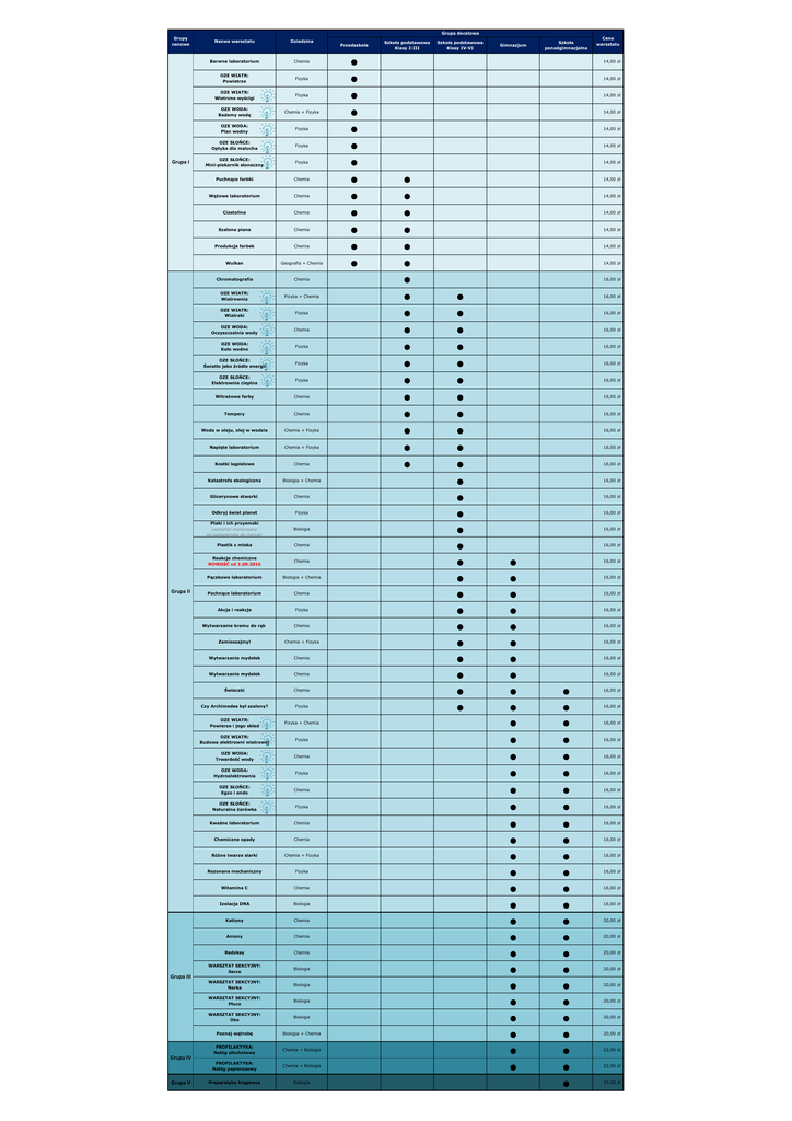 Grupa docelowa Grupy cenowe Grupa I Grupa II Grupa III Grupa IV Grupa V Nazwa warsztatu Dziedzina Barwne laboratorium Chemia OZE WIATR: Powietrze Fizyka OZE WIATR: Wietrzne wyścigi Fizyka OZE WODA: Badamy wodę Chemia + Fizyka OZE WODA: Plan wodny Fizyka OZE SŁOŃCE: Optyka dla malucha Fizyka OZE SŁOŃCE: Mini-piekarnik słoneczny Fizyka Puchnące farbki Chemia Wężowe laboratorium Chemia Ciastolina Chemia Szalona piana Chemia Produkcja farbek Chemia Wulkan Geografia + Chemia Chromatografia Chemia OZE WIATR: Wiatrownia Fizyka + Chemia OZE WIATR: Wiatraki Fizyka OZE WODA: Oczyszczalnia wody Chemia OZE WODA: Koło wodne Fizyka OZE SŁOŃCE: Światło jako źródło energii Fizyka OZE SŁOŃCE: Elektrownia cieplna Fizyka Witrażowe farby Chemia Tempery Chemia Woda w oleju, olej w wodzie Chemia + Fizyka Napięte laboratorium Chemia + Fizyka Kostki kąpielowe Chemia Katastrofa ekologiczna Biologia + Chemia Glicerynowe stworki Chemia Odkryj świat planet Fizyka Ptaki i ich przysmaki (warsztat realizowany od października do marca) Biologia Plastik z mleka Chemia Reakcje chemiczne NOWOŚĆ od 1.09.2016 Chemia Pączkowe laboratorium Biologia + Chemia Pachnące laboratorium Chemia Akcja i reakcja Fizyka Wytwarzanie kremu do rąk Chemia Zamieszajmy! Chemia + Fizyka Wytwarzanie mydełek Chemia Wytwarzanie mydełek Chemia Świeczki Chemia Czy Archimedes był szalony? Fizyka OZE WIATR: Powierze i jego skład Fizyka + Chemia OZE WIATR: Budowa elektrowni wiatrowej Fizyka OZE WODA: Trwardość wody Chemia OZE WODA: Hydroelektrownia Fizyka OZE SŁOŃCE: Egzo i endo Chemia OZE SŁOŃCE: Naturalna żarówka Fizyka Kwaśne laboratorium Chemia Chemiczne opady Chemia Różne twarze siarki Chemia + Fizyka Rezonans mechaniczny Fizyka Witamina C Chemia Izolacja DNA Biologia Kationy Chemia Aniony Chemia Redoksy Chemia WARSZTAT SEKCYJNY: Serce Biologia WARSZTAT SEKCYJNY: Nerka Biologia WARSZTAT SEKCYJNY: Płuco Biologia WARSZTAT SEKCYJNY: Oko Biologia Poznaj wątrobę Biologia + Chemia PROFILAKTYKA: Nałóg alkoholowy Chemia + Biologia PROFILAKTYKA: Nałóg papierosowy Chemia + Biologia Preparatyka kręgowca Biologia Przedszkole ● ● ● ● ● ● ● ● ● ● ● ● ● Szkoła podstawowa Klasy I-III Szkoła podstawowa Klasy IV-VI Gimnazjum Szkoła ponadgimnazjalna Cena warsztatu 14,00 zł 14,00 zł 14,00 zł 14,00 zł 14,00 zł 14,00 zł 14,00 zł ● ● ● ● ● ● ● ● ● ● ● ● ● ● ● ● ● ● 14,00 zł 14,00 zł 14,00 zł 14,00 zł 14,00 zł 14,00 zł 16,00 zł ● ● ● ● ● ● ● ● ● ● ● ● ● ● ● ● ● ● ● ● ● ● ● ● ● ● 16,00 zł 16,00 zł 16,00 zł 16,00 zł 16,00 zł 16,00 zł 16,00 zł 16,00 zł 16,00 zł 16,00 zł 16,00 zł 16,00 zł 16,00 zł 16,00 zł 16,00 zł 16,00 zł ● ● ● ● ● ● ● ● ● ● ● ● ● ● ● ● ● ● ● ● ● ● ● ● ● ● ● ● ● ● ● ● 16,00 zł 16,00 zł 16,00 zł 16,00 zł 16,00 zł 16,00 zł 16,00 zł 16,00 zł ● ● ● ● ● ● ● ● ● ● ● ● ● ● ● ● ● ● ● ● ● ● ● ● ● 16,00 zł 16,00 zł 16,00 zł 16,00 zł 16,00 zł 16,00 zł 16,00 zł 16,00 zł 16,00 zł 16,00 zł 16,00 zł 16,00 zł 16,00 zł 16,00 zł 20,00 zł 20,00 zł 20,00 zł 20,00 zł 20,00 zł 20,00 zł 20,00 zł 20,00 zł 22,00 zł 22,00 zł 33,00 zł