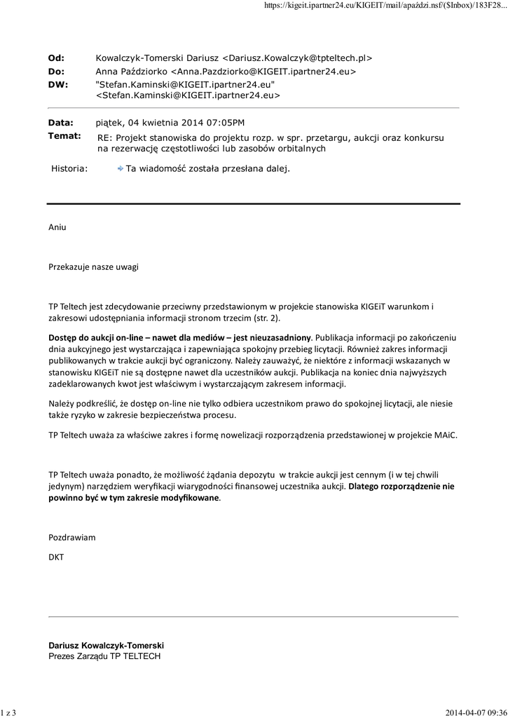 1z3 https://kigeit.ipartner24.eu/KIGEIT/mail/apaździ.nsf/($Inbox)/183F28... Od: Kowalczyk-Tomerski Dariusz <[email protected]> Do: Anna Paździorko <[email protected]> DW: "[email protected]" <[email protected]> Data: piątek, 04 kwietnia 2014 07:05PM Temat: RE: Projekt stanowiska do projektu rozp. w spr. przetargu, aukcji oraz konkursu na rezerwację częstotliwości lub zasobów orbitalnych Historia: Ta wiadomość została przesłana dalej. Aniu Przekazuje nasze uwagi TP Teltech jest zdecydowanie przeciwny przedstawionym w projekcie stanowiska KIGEiT warunkom i zakresowi udostępniania informacji stronom trzecim (str. 2). Dostęp do aukcji on-line – nawet dla mediów – jest nieuzasadniony. Publikacja informacji po zakończeniu dnia aukcyjnego jest wystarczająca i zapewniająca spokojny przebieg licytacji. Również zakres informacji publikowanych w trakcie aukcji być ograniczony. Należy zauważyć, że niektóre z informacji wskazanych w stanowisku KIGEiT nie są dostępne nawet dla uczestników aukcji. Publikacja na koniec dnia najwyższych zadeklarowanych kwot jest właściwym i wystarczającym zakresem informacji. Należy podkreślić, że dostęp on-line nie tylko odbiera uczestnikom prawo do spokojnej licytacji, ale niesie także ryzyko w zakresie bezpieczeństwa procesu. TP Teltech uważa za właściwe zakres i formę nowelizacji rozporządzenia przedstawionej w projekcie MAiC. TP Teltech uważa ponadto, że możliwość żądania depozytu w trakcie aukcji jest cennym (i w tej chwili jedynym) narzędziem weryfikacji wiarygodności finansowej uczestnika aukcji. Dlatego rozporządzenie nie powinno być w tym zakresie modyfikowane. Pozdrawiam DKT Dariusz Kowalczyk-Tomerski Prezes Zarządu TP TELTECH 2014-04-07 09:36 2z3 https://kigeit.ipartner24.eu/KIGEIT/mail/apaździ.nsf/($Inbox)/183F28... TP TELTECH Sp. z o.o. ul.Bartłomieja 2,02-683 Warszawa tel.225490111 tel.kom. 503027817 [email protected] P Czy musisz drukować tę wiadomość? Pomyśl o środowisku. Do you really need to print this message? Consider the environment. _______________________________________________________________________________ Treść tej wiadomości zawiera informacje przeznaczone tylko dla adresata. Jeżeli nie jesteście Państwo jej adresatem, bądź otrzymaliścieją przez pomyłkę, prosimy o powiadomienie o tym nadawcy oraz trwałe jej usunięcie. TP TELTECH Sp. z o.o. z siedzibą i adresem w Łodzi (90-418) AL. Tadeusza Kościuszki 5/7, wpisaną do Rejestru Przedsiębiorców prowadzonego przez Sąd Rejonowy dla Łodzi Śródmieście, XX Wydział Gospodarczy Krajowego Rejestru Sądowego, pod numerem KRS 0000056853; REGON 472919476; NIP: 725-18-20-520 z kapitałem zakładowym wynoszącym 48 505 000 PLN. From: Anna Paździorko [mailto:[email protected]] Sent: Friday, April 04, 2014 8:28 AM To: Kowalczyk-Tomerski Dariusz Subject: Projekt stanowiska do projektu rozp. w spr. przetargu, aukcji oraz konkursu na rezerwację częstotliwości lub zasobów orbitalnych Szanowni Członkowie Grupy Dyskusyjnej Regulacji Prawa Telekomunikacyjnego KIGEiT W nawiązaniu do poniższej wiadomości przesyłam przygotowany na bazie przesłanych przez Państwa uwag <projekt stanowiska> ws. projektu rozporządzenia Ministra Administracji i Cyfryzacji zmieniającego rozporządzenie w sprawie przetargu, aukcji oraz konkursu na rezerwację częstotliwości lub zasobów orbitalnych. Ewentualne uwagi i uzupełnienia do projektu proszę przesyłać na mój adres email w dniu dzisiejszym nie później niż do godz. 14:00. Pozdrawiam, Anna Paździorko Szanowni Członkowie Grupy Dyskusyjnej Regulacji Prawa Telekomunikacyjnego KIGEiT 2014-04-07 09:36 3z3 https://kigeit.ipartner24.eu/KIGEIT/mail/apaździ.nsf/($Inbox)/183F28... Uprzejmie informuję, że otrzymaliśmy w ramach konsultacji publicznych z Ministerstwa Administracji i Cyfryzacji <projekt rozporządzenia> zmieniającego rozporządzenie w sprawie przetargu, aukcji oraz konkursu na rezerwację częstotliwości lub zasobów orbitalnych z prośbą o zaopiniowanie projektu. Projekt dostępny jest również na stronie MAC w BIP <tutaj> MAC zaznacza, iż brak stanowiska w wyznaczonym terminie zostanie potraktowany jako akceptacja projektu. W związku z powyższym zachęcam do przesyłania Państwa uwag na mój adres email w terminie do dnia 3 kwietnia br. Pozdrawiam Anna Paździorko - Kierownik Projektu Krajowa Izba Gospodarcza Elektroniki i Telekomunikacji ul. Stępińska 22/30; 00-739 Warszawa tel.:+48 (22) 8510309; 8406522; fax.:+48 (22) 8510300; kom.: +48 515120275 e-mail: [email protected] http://www.kigeit.org.pl UWAGA! Jeżeli ten e-mail trafił na tzw. adres ogólny proszę o jego przekazanie do osób zainteresowanych tą tematyka w Waszej firmie. Jeżeli nie chcą Państwo otrzymywać informacji o regulacjach związanych z prawem telekomunikacyjnym proszę o odesłanie e-maila z wpisanym tematem “NIE-PT” na adres [email protected] . Jeżeli chcecie Państwo aby e-maile o tematyce prawa telekomunikacyjnego trafiały do innych osób z Waszej firmy proszę o przesłanie adresów e-mail tych osób na adres jak wyżej z informacją, żeby dopisać ich adresy do bazy wysyłkowej GDRPT KIGEiT. 2014-04-07 09:36