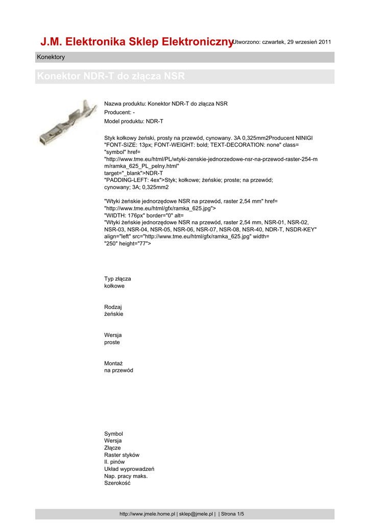 J.M. Elektronika Sklep ElektronicznyUtworzono: czwartek, 29 wrzesień 2011 Konektory Konektor NDR-T do złącza NSR Nazwa produktu: Konektor NDR-T do złącza NSR Producent: Model produktu: NDR-T Styk kołkowy żeński, prosty na przewód, cynowany. 3A 0,325mm2Producent NINIGI "FONT-SIZE: 13px; FONT-WEIGHT: bold; TEXT-DECORATION: none" class= "symbol" href= "http://www.tme.eu/html/PL/wtyki-zenskie-jednorzedowe-nsr-na-przewod-raster-254-m m/ramka_625_PL_pelny.html" target="_blank">NDR-T "PADDING-LEFT: 4ex">Styk; kołkowe; żeńskie; proste; na przewód; cynowany; 3A; 0,325mm2 "Wtyki żeńskie jednorzędowe NSR na przewód, raster 2,54 mm" href= "http://www.tme.eu/html/gfx/ramka_625.jpg"> "WIDTH: 176px" border="0" alt= "Wtyki żeńskie jednorzędowe NSR na przewód, raster 2,54 mm, NSR-01, NSR-02, NSR-03, NSR-04, NSR-05, NSR-06, NSR-07, NSR-08, NSR-40, NDR-T, NSDR-KEY" align="left" src="http://www.tme.eu/html/gfx/ramka_625.jpg" width= "250" height="77"> Typ złącza kołkowe Rodzaj żeńskie Wersja proste Montaż na przewód Symbol Wersja Złącze Raster styków Il. pinów Układ wyprowadzeń Nap. pracy maks. Szerokość http://www.jmele.home.pl | [email protected] | | Strona 1/5 J.M. Elektronika Sklep ElektronicznyUtworzono: czwartek, 29 wrzesień 2011 Konektory Konektor NDR-T do złącza NSR Wymiar B [mm] [V] [mm] [mm] "Wtyki żeńskie jednorzędowe NSR na przewód, raster 2,54 mm - NSR-01" href= "http://www.tme.eu/pl/katalog/?art=NSR-01">NSR-01 bez styków wtyk 2,54 1 1x1 250 2,65 - "Wtyki żeńskie jednorzędowe NSR na przewód, raster 2,54 mm - NSR-02" href= "http://www.tme.eu/pl/katalog/?art=NSR-02">NSR-02 bez styków wtyk 2,54 2 1x2 250 5,28 2,54 "Wtyki żeńskie jednorzędowe NSR na przewód, raster 2,54 mm - NSR-03" href= "http://www.tme.eu/pl/katalog/?art=NSR-03">NSR-03 bez styków wtyk 2,54 3 1x3 250 7,82 5,08 http://www.jmele.home.pl | [email protected] | | Strona 2/5 J.M. Elektronika Sklep ElektronicznyUtworzono: czwartek, 29 wrzesień 2011 Konektory Konektor NDR-T do złącza NSR "Wtyki żeńskie jednorzędowe NSR na przewód, raster 2,54 mm - NSR-04" href= "http://www.tme.eu/pl/katalog/?art=NSR-04">NSR-04 bez styków wtyk 2,54 4 1x4 250 10,36 7,62 "Wtyki żeńskie jednorzędowe NSR na przewód, raster 2,54 mm - NSR-05" href= "http://www.tme.eu/pl/katalog/?art=NSR-05">NSR-05 bez styków wtyk 2,54 5 1x5 250 12,9 10,16 "Wtyki żeńskie jednorzędowe NSR na przewód, raster 2,54 mm - NSR-06" href= "http://www.tme.eu/pl/katalog/?art=NSR-06">NSR-06 bez styków wtyk 2,54 6 1x6 250 15,44 12,7 "Wtyki żeńskie jednorzędowe NSR na przewód, raster 2,54 mm - NSR-07" href= "http://www.tme.eu/pl/katalog/?art=NSR-07">NSR-07 bez styków wtyk 2,54 7 1x7 250 17,98 15,24 http://www.jmele.home.pl | [email protected] | | Strona 3/5 J.M. Elektronika Sklep ElektronicznyUtworzono: czwartek, 29 wrzesień 2011 Konektory Konektor NDR-T do złącza NSR "Wtyki żeńskie jednorzędowe NSR na przewód, raster 2,54 mm - NSR-08" href= "http://www.tme.eu/pl/katalog/?art=NSR-08">NSR-08 bez styków wtyk 2,54 8 1x8 250 20,52 17,78 "Wtyki żeńskie jednorzędowe NSR na przewód, raster 2,54 mm - NSR-40" href= "http://www.tme.eu/pl/katalog/?art=NSR-40">NSR-40 bez styków wtyk 2,54 40 1x40 250 103,6 99,06 "Wtyki żeńskie jednorzędowe NSR na przewód, raster 2,54 mm - NDR-T" href= "http://www.tme.eu/pl/katalog/?art=NDR-T">NDR-T styk - Symbol Prąd maks. Materiał styku Pokrycie styku Przekrój przew. max http://www.jmele.home.pl | [email protected] | | Strona 4/5 J.M. Elektronika Sklep ElektronicznyUtworzono: czwartek, 29 wrzesień 2011 Konektory Konektor NDR-T do złącza NSR "Wtyki żeńskie jednorzędowe NSR na przewód, raster 2,54 mm - NDR-T" href="http://www.tme.eu/pl/katalog/?art=NDR-T">NDR-T 3 [A] mosiądz cynowany 0,325 [mm2] 2 Dostępność: Ten produkt został dodany do sklepu w dniu piątek, 03 czerwiec 2011 http://www.jmele.home.pl | [email protected] | | Strona 5/5