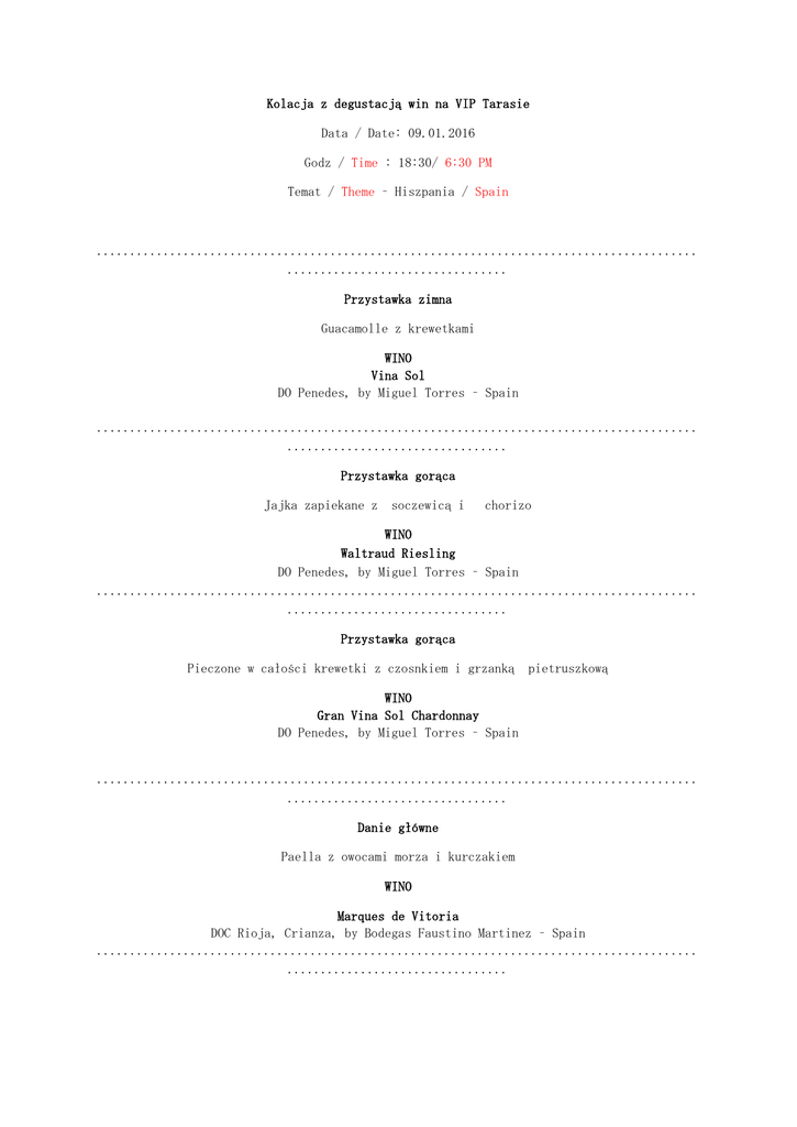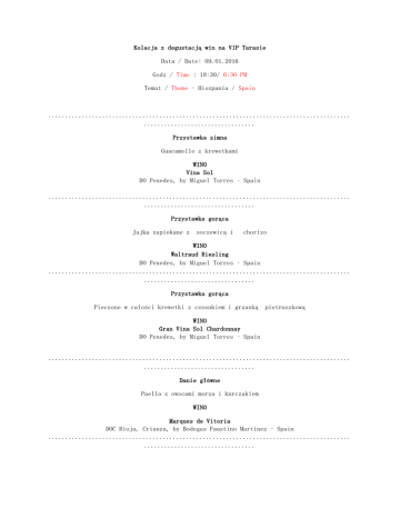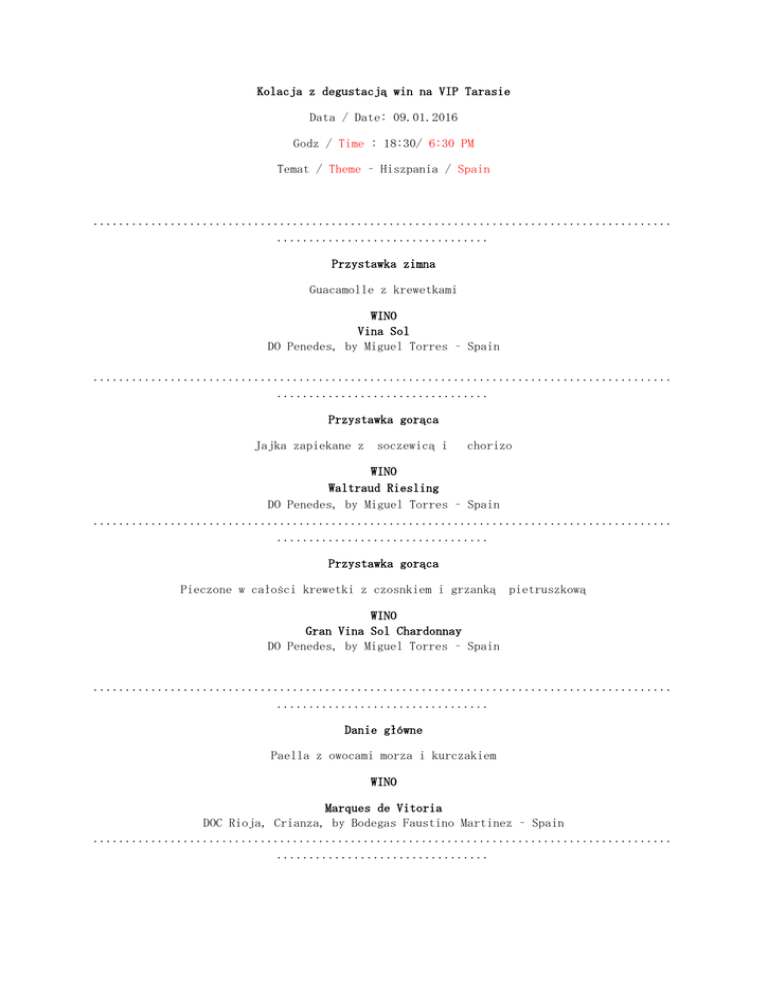 Kolacja z degustacją win na VIP Tarasie Data / Date: 09.01.2016 Godz / Time : 18:30/ 6:30 PM Temat / Theme – Hiszpania / Spain .......................................................................................... ................................. Przystawka zimna Guacamolle z krewetkami WINO Vina Sol DO Penedes, by Miguel Torres – Spain .......................................................................................... ................................. Przystawka gorąca Jajka zapiekane z soczewicą i chorizo WINO Waltraud Riesling DO Penedes, by Miguel Torres – Spain .......................................................................................... ................................. Przystawka gorąca Pieczone w całości krewetki z czosnkiem i grzanką pietruszkową WINO Gran Vina Sol Chardonnay DO Penedes, by Miguel Torres – Spain .......................................................................................... ................................. Danie główne Paella z owocami morza i kurczakiem WINO Marques de Vitoria DOC Rioja, Crianza, by Bodegas Faustino Martinez – Spain .......................................................................................... ................................. .......................................................................................... ................................. Danie główne Żebro wołowe duszone z pomidorami, czosnkiem i fasolą. WINO Marques de Vitoria DOC Rioja, Reserva, by Bodegas Faustino Martinez – Spain .......................................................................................... ................................. Deser Flan waniliowy z sosem owocowym WINO Floralis - Moscatel Oro DO Catalunya, vino De Licor – wino Likierowe, by Miguel Torres – Spain .......................................................................................... .................................