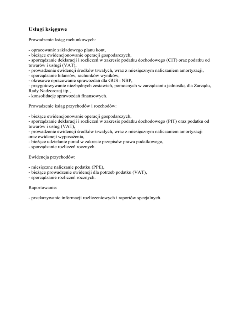 Usługi księgowe Prowadzenie ksiąg rachunkowych: - opracowanie zakładowego planu kont, - bieżące ewidencjonowanie operacji gospodarczych, - sporządzanie deklaracji i rozliczeń w zakresie podatku dochodowego (CIT) oraz podatku od towarów i usługi (VAT), - prowadzenie ewidencji środków trwałych, wraz z miesięcznym naliczaniem amortyzacji, - sporządzanie bilansów, rachunków wyników, - okresowe opracowanie sprawozdań dla GUS i NBP, - przygotowywanie niezbędnych zestawień, pomocnych w zarządzaniu jednostką dla Zarządu, Rady Nadzorczej itp., - konsolidację sprawozdań finansowych. Prowadzenie ksiąg przychodów i rozchodów: - bieżące ewidencjonowanie operacji gospodarczych, - sporządzanie deklaracji i rozliczeń w zakresie podatku dochodowego (PIT) oraz podatku od towarów i usług (VAT), - prowadzenie ewidencji środków trwałych, wraz z miesięcznym naliczaniem amortyzacji oraz ewidencji wyposażenia, - bieżące udzielanie porad w zakresie przepisów prawa podatkowego, - sporządzanie rozliczeń rocznych. Ewidencja przychodów: - miesięczne naliczanie podatku (PPE), - bieżące prowadzenie ewidencji dla potrzeb podatku (VAT), - sporządzanie rozliczeń rocznych. Raportowanie: - przekazywanie informacji rozliczeniowych i raportów specjalnych.