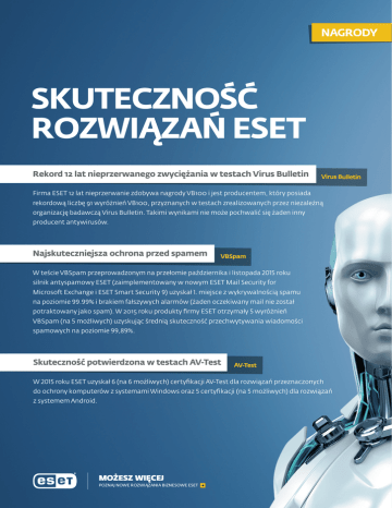 NAGRODY SKUTECZNOŚĆ ROZWIĄZAŃ ESET Rekord 12 lat nieprzerwanego zwyciężania w testach Virus Bulletin Virus Bulletin Firma ESET 12 lat nieprzerwanie zdobywa nagrody VB100 i jest producentem, który posiada rekordową liczbę 91 wyróżnień VB100, przyznanych w testach zrealizowanych przez niezależną organizację badawczą Virus Bulletin. Takimi wynikami nie może pochwalić się żaden inny producent antywirusów. Najskuteczniejsza ochrona przed spamem VBSpam W teście VBSpam przeprowadzonym na przełomie października i listopada 2015 roku silnik antyspamowy ESET (zaimplementowany w nowym ESET Mail Security for Microsoft Exchange i ESET Smart Security 9) uzyskał 1. miejsce z wykrywalnością spamu na poziomie 99.99% i brakiem fałszywych alarmów (żaden oczekiwany mail nie został potraktowany jako spam). W 2015 roku produkty firmy ESET otrzymały 5 wyróżnień VBSpam (na 5 możliwych) uzyskując średnią skuteczność przechwytywania wiadomości spamowych na poziomie 99,89%. Skuteczność potwierdzona w testach AV-Test AV-Test W 2015 roku ESET uzyskał 6 (na 6 możliwych) certyfikacji AV-Test dla rozwiązań przeznaczonych do ochrony komputerów z systemami Windows oraz 5 certyfikacji (na 5 możliwych) dla rozwiązań z systemem Android. MOŻESZ WIĘCEJ POZNAJ NOWE ROZWIĄZANIA BIZNESOWE ESET NAGRODY SKUTECZNOŚĆ ROZWIĄZAŃ ESET ESET najwyżej ocenianym rozwiązaniem przez AV-Comparatives AV-Comparatives ESET uzyskał tytuł najwyżej ocenianego rozwiązania antywirusowego w 2015 roku, uzyskując w tym roku 7 wyróżnień Advanced+ w testach. Pewne zabezpieczenie przed phishingiem AV-Comparatives ESET otrzymał nagrodę Advanced+ w teście antyphishingowym organizacji AV-Comparatives i tym samym znalazł się w gronie najlepszych i najskuteczniejszych rozwiązań chroniących przed wyłudzeniem danych użytkownika. Wysoka skuteczność wykrywania zagrożeń AV-Comparatives W teście przeprowadzonym przez AV-Comparatives we wrześniu 2015 roku, ESET wykrył 99,2% zagrożeń i nie zgłosił żadnych fałszywych alarmów. Tym samym udowodnił swoją wysoką skuteczność w wykrywaniu zagrożeń i otrzymał nagrodę Advanced+. Certyfikowana kontrola rodzicielska AV-Comparatives Kontrola rodzicielska dostępna w rozwiązaniu ESET Smart Security uzyskała w recenzji organizacji AV-Comparatives certyfikat Approved Parental Control Product. MOŻESZ WIĘCEJ POZNAJ NOWE ROZWIĄZANIA BIZNESOWE ESET WYRÓŻNIENIA SATYSFAKCJA KLIENTA Produkt roku 2015 IT Professional /grudzień 2015 Redakcja oraz czytelnicy magazynu IT Professional, adresowanego do ekspertów branży informatycznej w Polsce, każdego roku wyróżniają najlepsze rozwiązania IT, przyznając im tytuły Produktów Roku. W 2015 roku, po raz czwarty z rzędu czytelnicy IT Professional przyznali produktowi ESET Endpoint Security tytuł Produktu Roku. Poprzednie tytuły Produktu Roku przypadły rozwiązaniom firmy ESET w latach 2012, 2013 oraz 2014. Produkt roku 2015 IT w Administracji /grudzień 2015 ESET Smart Security 9 otrzymał tytuł Produktu Roku 2015 magazynu IT w Administracji. Wyborem czytelników i redakcji zajął 1. miejsce w kategorii „oprogramowanie - bezpieczeństwo”. Producent rozwiązań ochronnych roku 2014 CRN /maj 2015 Resellerzy rozwiązań IT w Polsce - czytelnicy magazynów CRN i Vademeców VAR-ów i integratorów - wybrali firmę ESET Producentem Rozwiązań Ochronnych Roku 2014. Rekomendacja portalu Instalki.pl Instalki.pl /listopad 2015 Redakcja Instalki.pl, jednego z najpopularniejszych w Polsce serwisów poświęconych nowym technologiom, zalicza ESET NOD32 Antivirus do grona najlepszych programów. Rekomendacja stanowi gwarancję wysokiej jakości oprogramowania ESET, które zostało docenione przez ekspertów, tworzących serwis Instalki.pl. Rekomendacja AVlab AVLab /listopad 2015 ESET Smart Security oraz ESET Parental Control for Android otrzymały od serwisu AVLab certyfikat potwierdzający wysoką skuteczność. Programy te podczas testów charakteryzowały się bardzo dobrą ochroną, wzorową wydajnością, a i ich cena była na przystępnym poziomie. MOŻESZ WIĘCEJ POZNAJ NOWE ROZWIĄZANIA BIZNESOWE ESET WYRÓŻNIENIA POTENCJAŁ FIRMY Czołowy producent rozwiązań zabezpieczających CRN Magazine /listopad 2015 Podobnie jak w roku ubiegłym, niemiecka edycja magazynu CRN, adresowana do resellerów rozwiązań IT, sklasyfikowała firmę ESET wśród trzech najważniejszych producentów rozwiązań zabezpieczających. ESET w Wielkiej Piątce Deloitte Deloitte /listopad 2015 Firma ESET po raz trzynasty została doceniona przez międzynarodową firmę audytorsko -doradczą Deloitte i sklasyfikowana wśród 50 najszybciej rozwijających się firm technologicznych Europy Środkowej. W aktualnym zestawieniu „Technology Fast 50” firma ESET została wskazana przez Deloitte jako część tzw. Wielkiej Piątki ze średnim rocznym wzrostem przychodów na poziomie 223%. Najpopularniejsze rozwiązania antywirusowe w Polsce Gartner /maj 2013 Z opublikowanego w 2013 roku raportu „Gartner Market Share: Security Software, Worldwide, 2012” wynika, że w Polsce najlepiej sprzedawały się antywirusy firmy ESET. To właśnie ten producent miał według Gartnera, największy udział w sprzedaży antywirusów na polskim rynku konsumenckim i biznesowym. MOŻESZ WIĘCEJ POZNAJ NOWE ROZWIĄZANIA BIZNESOWE ESET