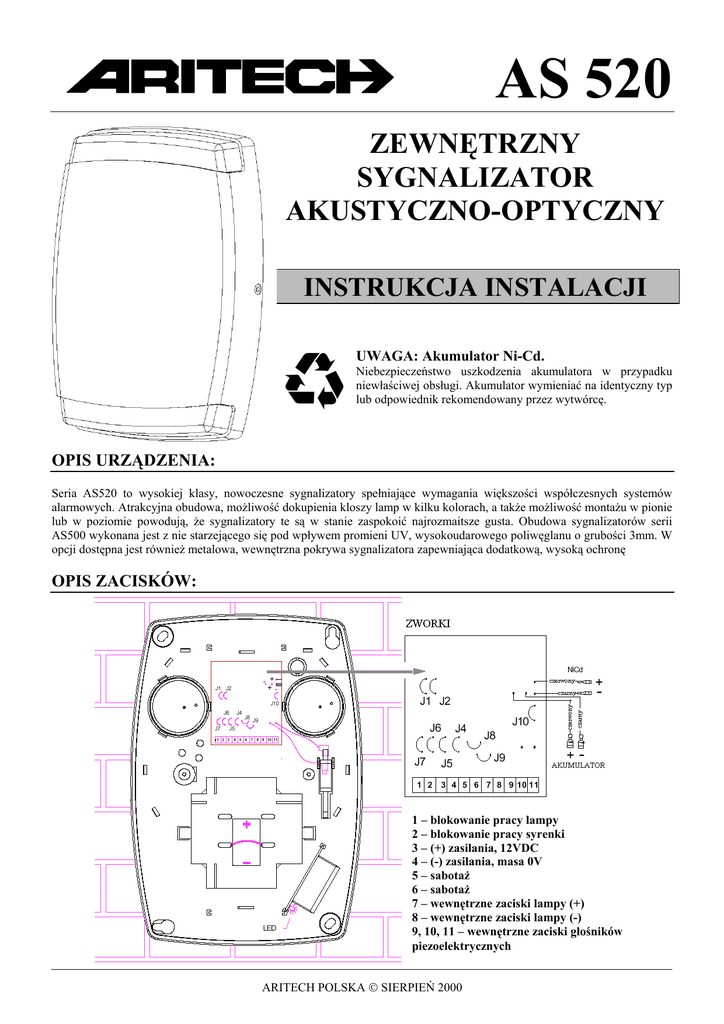 AS 520 ZEWNĘTRZNY SYGNALIZATOR AKUSTYCZNO-OPTYCZNY INSTRUKCJA INSTALACJI UWAGA: Akumulator Ni-Cd. Niebezpieczeństwo uszkodzenia akumulatora w przypadku niewłaściwej obsługi. Akumulator wymieniać na identyczny typ lub odpowiednik rekomendowany przez wytwórcę. OPIS URZĄDZENIA: Seria AS520 to wysokiej klasy, nowoczesne sygnalizatory spełniające wymagania większości współczesnych systemów alarmowych. Atrakcyjna obudowa, możliwość dokupienia kloszy lamp w kilku kolorach, a także możliwość montażu w pionie lub w poziomie powodują, że sygnalizatory te są w stanie zaspokoić najrozmaitsze gusta. Obudowa sygnalizatorów serii AS500 wykonana jest z nie starzejącego się pod wpływem promieni UV, wysokoudarowego poliwęglanu o grubości 3mm. W opcji dostępna jest również metalowa, wewnętrzna pokrywa sygnalizatora zapewniająca dodatkową, wysoką ochronę OPIS ZACISKÓW: 1 – blokowanie pracy lampy 2 – blokowanie pracy syrenki 3 – (+) zasilania, 12VDC 4 – (-) zasilania, masa 0V 5 – sabotaż 6 – sabotaż 7 – wewnętrzne zaciski lampy (+) 8 – wewnętrzne zaciski lampy (-) 9, 10, 11 – wewnętrzne zaciski głośników piezoelektrycznych ARITECH POLSKA SIERPIEŃ 2000 AS 520 ZWORKI: PROGRAMOWANIE CZASU PRACY SYRENA (wybór napięcia blokowania) Ustawienia fabryczne LAMPA (wybór napięcia blokowania) ZACISK 1 ZACISK 2 Ustawienia fabryczne Ustawienia fabryczne 12 V lub odłączone 12 V lub odłączone 0 V lub odłączone 0 V lub odłączone PĘTLA SABOTAŻOWA zaciski 5 i 6 SABOTAŻ Ustawienia fabryczne SABOTAŻ izolowany izolowany Nie podłączać zacisku 6 w przypadku używania uziemionej pętli sabotażowej AKCESORIA: AKUMULATOR OŁOWIOWO-KWASOWY (SYGNALIZATOR W POZYCJI PIONOWEJ) WEWNĘTRZNA POKRYWA METALOWA AKUMULATOR OŁOWIOWO-KWASOWY (SYGNALIZATOR W POZYCJI POZIOMEJ) KLOSZE (CZERWONY, ŻÓŁTY, NIEBIESKI, PRZEŹROCZYSTY) ARITECH POLSKA SIERPIEŃ 2000 Ustawienia fabryczne AS 520 SCHEMAT PODŁĄCZENIA DO CENTRAL ARITECH: Uwaga: W syrenie serii AS520 należy przeciąć zwory J4 oraz J6 (podtrzymanie blokady syreny i lampy wysokim poziomem). Dwa rezystory 4k7 - + - + - + - + 13.8V 0101 1 2 3 4 5 6 Powyżej przedstawiono sposób podłączenia sygnalizatora do centrali CS1518. W przypadku podłączenia do central: CD 15018, CD 9518, CD7218, CD3418 i CS 352 nie jest wymagane zastosowanie dodatkowych rezystorów (pomiędzy (+) zasilania, a sygnałami blokującymi lampę i syrenę) 4k7 przedstawionych na powyższym rysunku. Poza tym konieczne jest przecięcie zworki J8 (załączenie rezystora EOL w pętli sabotażowej). ARITECH POLSKA SIERPIEŃ 2000 AS 520 Tabela opisujące zaciski dla poszczególnych central alarmowych: Zaciski centrali alarmowej Zaciski sygnalizatora CS1518 CS352 CD3418 CD7218 CD9518/15018 AS520 1 7 7 24 10 51 2 9 5 26 12 53 3 1,6,8 2,4,6 27,25,23 9,11,13 58,54,52 4 2,21 3,16 14,28 8,30 57,33 6 20 17 15 31 34 W przypadku wystąpienia w tabeli większej liczby zacisków, należy wybrać najbardziej dogodny z punktu widzenia okablowania systemu. URUCHOMIENIE: Na początku należy podłączyć przewody wychodzące z centrali alarmowej (przy odłączonym zasilaniu) do odpowiednich zacisków w sygnalizatorze (przed podłączeniem akumulatora). Przy pierwszym podłączeniu akumulatora syrenka wygeneruje krótki sygnał dźwiękowy. Sygnalizator nie może być uruchomiony dopóki wszystkie wejścia (zasilanie i sygnały blokujące) nie będą prawidłowo podłączone (ważna polaryzacja wejść). Uruchomienie sygnalizatora następuje w przypadku utraty zasilania zewnętrznego lub jego znacznym spadku oraz gdy zaniknie sygnał blokujący. DANE TECHNICZNE: Obudowa: Moduł akustyczny: Układ elektroniczny: Zabezpieczenia sabotażowe: Zasilanie: Prąd spoczynkowy: Prąd w stanie alarmu: Poziom natężenia dźwięku: Częstotliwość sygnału: Czas odcięcia sygnału: Częstotliwość błysków: Strumień świetlny Temperatura pracy: Akumulator podtrzymujący: Wskaźnik stanu pracy: Wymiary: Waga: Wewnętrzna pokrywa metalowa: Akumulator ołowiowo-kwasowy: Ogranicznik przepięciowy Układ detekcji spadku napięcia: poliwęglan (3 [mm]) dwa przetworniki piezoelektryczne całkowicie hermetyzowany próby otwarcia i oderwania; 28 [VDC], max. 100 [mA] 10 ÷ 14,5 [Vdc] 70 [mA] (wraz z akumulatorem) 26 [mA] (bez akumulatora) 500 [mA] (wraz z lampą); lampa 110 [mA] 114 [dB] dla 1 [m] 85 [dB] dla 3 [m] 0,5 ÷ 3 [kHz] ustawiany: 3, 5, 10 lub 20 [min] 1 [Hz] max. 100000 [lm] -25 ÷ +55 [oC] Ni-Cd 6 [V] / 280 [mAh] Ołowiowo-kwasowy 12 [V]/1,2 [Ah] LED 300 x 210 x 55 [mm] 1 [kg] opcjonalnie opcjonalnie wyposażenie fabryczne wyposażenie fabryczne ARITECH POLSKA SIERPIEŃ 2000 AS 520 SCHEMAT PODŁĄCZENIA DO INNYCH CENTRAL: Uwaga: Syreny serii AS500 są urządzeniami z osobnym wejściem zasilania. Wymagają podania napięcia zasilania +12Vdc z centrali alarmowej przez cały czas (w stanie czuwania oraz alarmu) na zaciski 3 (+) i 4 (-). Sterowanie odbywa się poprzez zmianę napięcia na zaciskach 1 (lampa) oraz 2 (syrena), zgodnie z polaryzacją zdefiniowaną wcześniej zworami J4 do J7. Przy podłączaniu syreny należy kierować się zaleceniami instrukcji centrali dot. podłączenia syreny z własnym zasilaniem. Uwaga: W syrenie serii AS500 należy przeciąć zworę J9 A B C D E F Zaciski centrali alarmowej A- Wyjście sterowania sygnalizatora wewnętrznego. W zależności od konstrukcji centrali może być oznakowane jako ‘+’ lub jako ‘-‘ : należy sprawdzić w instrukcji centrali, na którym zacisku zmienia się napięcie przy alarmie. Przy podłączeniu do wyjścia ‘+’ należy przeciąć zwory J5 oraz J7. Przy podłączeniu do wyjścia ‘-‘: przeciąć zwory J4 i J6 B- Wyjście sterowania sygnalizatora zewnętrznego. W zależności od konstrukcji centrali może być oznakowane jako ‘+’ lub jako ‘-‘. C- Zacisk centrali, na którym jest zawsze +12Vdc. Najczęściej jest to wyjście do zasilania czujek lub zacisk + sygnalizatora zewnętrzn