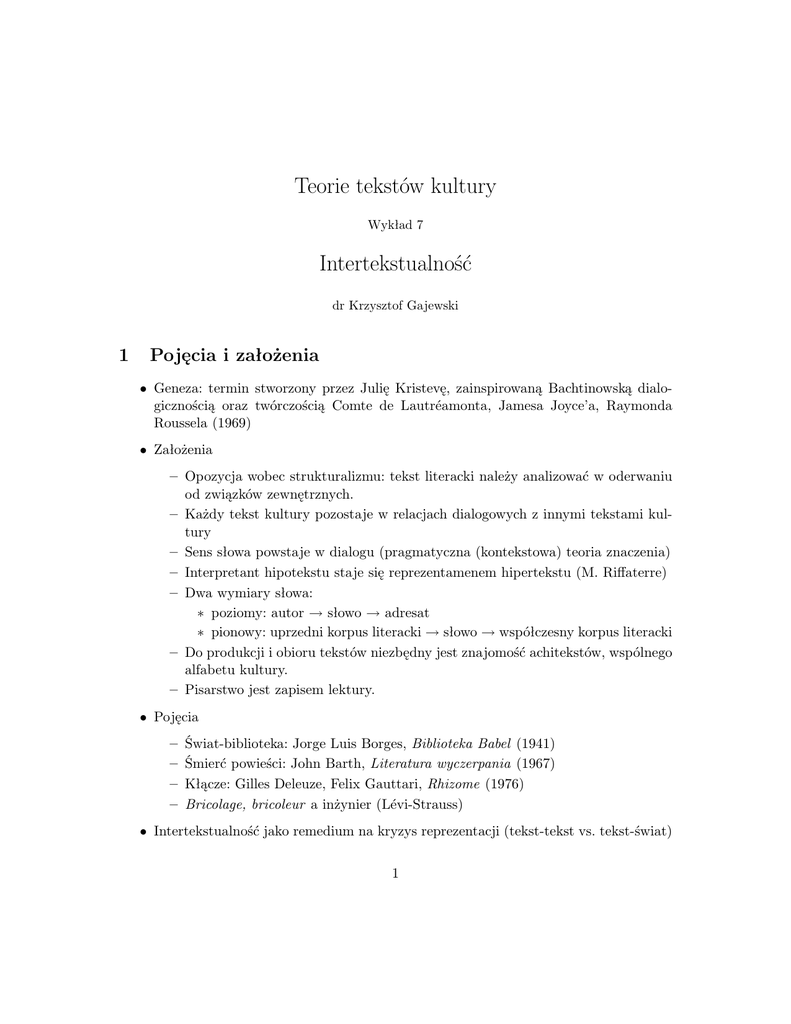 Teorie tekstów kultury Wykład 7 Intertekstualność dr Krzysztof Gajewski 1 Pojęcia i założenia • Geneza: termin stworzony przez Julię Kristevę, zainspirowaną Bachtinowską dialogicznością oraz twórczością Comte de Lautréamonta, Jamesa Joyce’a, Raymonda Roussela (1969) • Założenia – Opozycja wobec strukturalizmu: tekst literacki należy analizować w oderwaniu od związków zewnętrznych. – Każdy tekst kultury pozostaje w relacjach dialogowych z innymi tekstami kultury – Sens słowa powstaje w dialogu (pragmatyczna (kontekstowa) teoria znaczenia) – Interpretant hipotekstu staje się reprezentamenem hipertekstu (M. Riffaterre) – Dwa wymiary słowa: ∗ poziomy: autor → słowo → adresat ∗ pionowy: uprzedni korpus literacki → słowo → współczesny korpus literacki – Do produkcji i obioru tekstów niezbędny jest znajomość achitekstów, wspólnego alfabetu kultury. – Pisarstwo jest zapisem lektury. • Pojęcia – – – – Świat-biblioteka: Jorge Luis Borges, Biblioteka Babel (1941) Śmierć powieści: John Barth, Literatura wyczerpania (1967) Kłącze: Gilles Deleuze, Felix Gauttari, Rhizome (1976) Bricolage, bricoleur a inżynier (Lévi-Strauss) • Intertekstualność jako remedium na kryzys reprezentacji (tekst-tekst vs. tekst-świat) 1 Intertekstualność 2 Odmiany intertekstualności • pięć typów transtekstualności (Gérard Genette, Palimpsesty. Literatura drugiego stopnia, 1982) 1. intertekstualność (cytat, plagiat, aluzja) 2. paratekstualność (tytuł, wstęp, posłowie) 3. metatekstualność (komentarz) 4. hipertekstualność (parodia, pastisz) 5. architekstualność (wzorzec gatunkowy) • Mowa pozornie zależna – podstawowe sposoby przytaczania wypowiedzi 1. mowa niezależna (oratio obliqua) Ciężar z ramion zrzuciwszy, narzekać zaczyna: ”Kiedyż za swą niedolę doczekam zapłaty?” (La Fontaine, Drwal i śmierć, przeł. W. Noskowski) 2. mowa zależna (oratio recta) Ciężar z ramion zrzuciwszy, narzekać zaczyna, pytając, kiedy za swą niedolę doczeka zapłaty. 3. mowa pozornie zależna (discours indirect libre) Ciężar z ramion zrzuciwszy, narzekać zaczyna. Kiedyż za swą niedolę doczeka zapłaty? – Słowa postaci „podszywające się” pod słowa narratora. – J. W. Goethe (1749-1832), Jane Austen (1775-1817), Gustave Flaubert (18211880), Franz Kafka (1883-1924), Juliusz Kaden-Bandrowski (1885-1944) – Podstawa techniki monologu wewnętrznego i strumienia świadomości (Édouard Dujardin, James Joyce, Wirginia Woolf) • Intertekstualne gatunki wypowiedzi: – reminiscencja, aluzja, skrzydlate słowo, klisza (cliché) – parodia, trawestacja, pastisz – polemika, palinodia (pozorne odwołanie) – parafraza, cytat, kryptocytat, plagiat, autoplagiat – centon, kolaż – remiks, mem Teorie tekstów kultury 2 Intertekstualność • Stylizacja językowa na socjolekt, dialekt lub styl funkcjonalny (Miron Białoszewski) • Mimetyzm formalny (Głowiński): Stanisław Lem, Doskonała próżnia (1971) • Literatura autotematyczna: André Gide, Fałszerze (1926); Jerzy Andrzejewski, Miazga (1979) • „Manuskrypt, to oczywiste”: Umberto Eco, Imię róży (1980) • Jorge Luis Borges, Pierre Menard, autor „Don Kichota” („prawda, której matką jest historia”) Literatura [1] Michał Głowiński, O intertekstualności, „Pamiętnik Literacki” 1986 z. 4. [2] Ryszard Nycz, Tekstowy świat. Poststrukturalizm a wiedza o literaturze, Warszawa 1993 [3] Julia Kristeva, Słowo, dialog i powieść, w: M. Bachin, Dialog – język – literatura, red. E. Czaplejewicz i E. Kasperski, Warszawa 1983. [4] Henryk Markiewicz, Andrzej Romanowski, Skrzydlate słowa, Kraków 1990. Teorie tekstów kultury 3