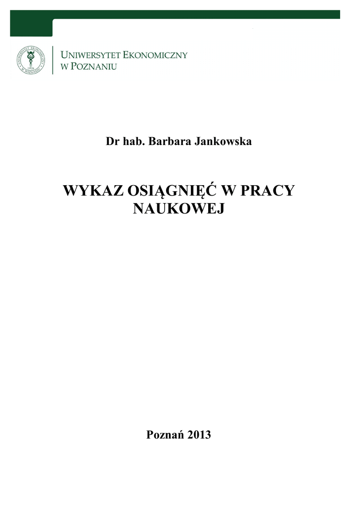Katedra Bankowości 0 0000000000000000000000000000000000 Dr hab. Barbara Jankowska WYKAZ OSIĄGNIĘĆ W PRACY NAUKOWEJ Poznań 2013 Wykaz osiągnięć w pracy naukowej Barbara Jankowska, ur. 22.08.1975 r. 1. Rozprawa doktorska „Międzynarodowa konkurencyjność polskiej branży budowlanej”, 4 lipca 2003. 2. 2.1 Oryginalne opublikowane naukowe prace twórcze udostępniane w obiegu społecznym Opublikowane przed rozprawą doktorską 2.1.1 Publikacje w czasopismach 2.1.1.1 Jankowska B., Branża jako mezosystem gospodarczy, „Ruch Prawniczy, Ekonomiczny i Socjologiczny”, nr 2, 2002, s. 233-243. 2.1.1.2 Jankowska B., Konkurencja wewnątrzbranżowa jako determinanta konkurencyjności przedsiębiorstwa, „Gospodarka Narodowa”, nr 4, 2002, s. 66-82. 2.1.1.3 Jankowska B., Wpływ grup interesów na konkurencyjność w świetle koncepcji rent-seeking, „Gospodarka Narodowa”, nr 1-2, 2001, s. 38-51. 2.1.1.4 Gorynia M., Jankowska B. (33%) , Maślak E., Branża jako przedmiot badań w ekonomii „Ruch Prawniczy, Ekonomiczny i Socjologiczny”, nr 3, 2000 s. 3654. Udział własny: współudział w koncepcji pracy, studiach literaturowych i przygotowaniu tekstu. 2.1.1.5 Jankowska B., Koniec polsko-niemieckiej kooperacji w budownictwie?, „Gospodarka Eksport-Import”, nr 37, 2000, s. 31-33. 2.1.1.6 Jankowska B., Polska branża budowlana i jej pozycja konkurencyjna na rynku RFN (część I), „TWG-Informacje”, nr 3, 2000, s. 4-6. 2.1.1.7 Jankowska B., Polska branża budowlana i jej pozycja konkurencyjna na rynku RFN (część II), „TWG-Informacje”, nr 4, 2000, s. 5. 2.1.2 Publikacje w zeszytach naukowych 2.1.2.1 Jankowska B., Internacjonalizacja polskich przedsiębiorstw budowlanych w perspektywie integracji z Unią Europejską, w: J. Rymarczyk (red.) Regionalizacja i globalizacja w gospodarce światowej, Prace Naukowe Akademii Ekonomicznej we Wrocławiu nr 976, 2003, s. 280-291. 2.1.2.2 Jankowska B., Kierunki badań mezoekonomii a poprawa konkurencyjności gospodarki, w: Źródła konkurencyjności przedsiębiorstw i instytucji w warunkach globalizacji rynków, Zeszyt Naukowy AE w Poznaniu, 2003, s. 719. 2 2.1.2.3 Gorynia M., Jankowska B. (50%), Opinie przedsiębiorstw na temat wybranych aspektów przystąpienia Polski do Unii Europejskiej (dot. firm przemysłu przetwórczego), w: J. Rymarczyk, T. Szeląg (red.), Internacjonalizacja i globalizacja gospodarki polskiej, Prace naukowe Akademii Ekonomicznej we Wrocławiu nr 893, Wrocław 2001, s. 167-176. Udział własny: współudział w koncepcji pracy, studiach literaturowych, badaniach empirycznych i przygotowaniu tekstu. 2.1.3 Publikacje w materiałach konferencyjnych 2.1.3.1 Jankowska B., Międzynarodowa konkurencyjność branży a konkurencyjność przedsiębiorstwa, w E. Najlepszy (red.), Strategie przedsiębiorstw na rynkach zagranicznych: implikacje dla Polski, Wyd. AE w Poznaniu, 2002, s. 131-148. 2.1.3.2 Gorynia M., Jankowska B. (50%), Strategie konkurencyjne polskich przedsiębiorstw w perspektywie integracji z Unią Europejską., w: . J. Bliski, T. Miziołek (red.), Liberalizacja stosunków ekonomicznych Polski z gospodarką światową, Wyd. Uniwersytetu Łódzkiego, 2001, s. 131 – 146. Udział własny: współudział w koncepcji pracy, studiach literaturowych, badaniach empirycznych i przygotowaniu tekstu. 2.1.3.3 Gorynia M., Jankowska B. (33%), Sulimowska-Formowicz M., Opinie przedsiębiorstw na temat wybranych aspektów przystąpienia Polski do Unii Europejskiej, w: U. Janeczek (red.), Zachowania podmiotów rynkowych w Polsce a proces integracji europejskiej, Wyd. AE w Katowicach, 2001. s. 19-33. Udział własny: współudział w koncepcji pracy, studiach literaturowych, badaniach empirycznych i przygotowaniu tekstu. 2.1.3.4 Jankowska B. (50%), Krajewski Z., Polska branża budowlana i jej pozycja konkurencyjna na rynkach Unii Europejskiej, w: J. Schroeder (red.), Procesy przystosowawcze w polskim handlu zagranicznym w kontekście członkostwa w Unii Europejskiej, Wydaw. AE w Poznaniu, 2000, s. 146-169. Udział własny: współudział w koncepcji pracy, studiach literaturowych, badaniach empirycznych i przygotowaniu tekstu. 2.1.4 Rozdział w monografii naukowej 2.1.4.1 Jankowska B. (50%), Krajewski Z., Luka konkurencyjna w przedsiębiorstwach sektora budowlanego, w: M. Gorynia (red.), Luka konkurencyjna na poziomie przedsiębiorstwa a przystąpienie Polski do Unii Europejskiej, Wyd. AE w Poznaniu, 2002, s. 155-177. Udział własny: współudział w koncepcji pracy, studiach literaturowych, badaniach empirycznych i przygotowaniu tekstu. 2.1.4.2 Jankowska B. (50%), Kulczyński K., Studium przypadku – studium konkurencyjności BUDIMEX S.A., w: M. Gorynia (red.), Luka konkurencyjna na poziomie przedsiębiorstwa a przystąpienie Polski do Unii Europejskiej, Wyd. AE w Poznaniu, 2002, s. 177-188. Udział własny: opracowanie koncepcji pracy, współudział w przygotowaniu tekstu. 2.2 Prace opublikowane po rozprawie doktorskiej ( oceniane jako dorobek w procedurze habilitacyjnej) 2.2.1 Monografia 3 2.2.1.1 Jankowska B., Koopetycja w klastrach kreatywnych. Przyczynek do teorii regulacji w gospodarce rynkowej, Wyd. Uniwersytetu Ekonomicznego w Poznaniu, 2012 (rozprawa habilitacyjna). 2.2.1.2 Gorynia M. (red.), Jankowska B. (red.) (25%), Pietrzykowski M., Tarka P., Dzikowska M., Wejście Polski do strefy euro a międzynarodowa konkurencyjność i internacjonalizacja polskich przedsiębiorstw , Difin, Warszawa, 2011 [punkty podano w pozycji 2.2.2. - za poszczególne rozdziały monografii]. Udział własny: współudział w koncepcji pracy, studiach literaturowych, badaniach empirycznych i przygotowaniu tekstu. 2.2.1.3 Czyżewska D., Jankowska B. (red.) (17%), Kowalski T. (red.), MatysekJędrych A., Pietrzykowski M. (red.), Polowczyk J., Zenka-Podlaszewska D., Dimesions of competitiveness, Poznań University of Economics, Poznań 2010 [punkty podano w pozycji 2.2.2. - za poszczególne rozdziały monografii]. Udział własny: wsp