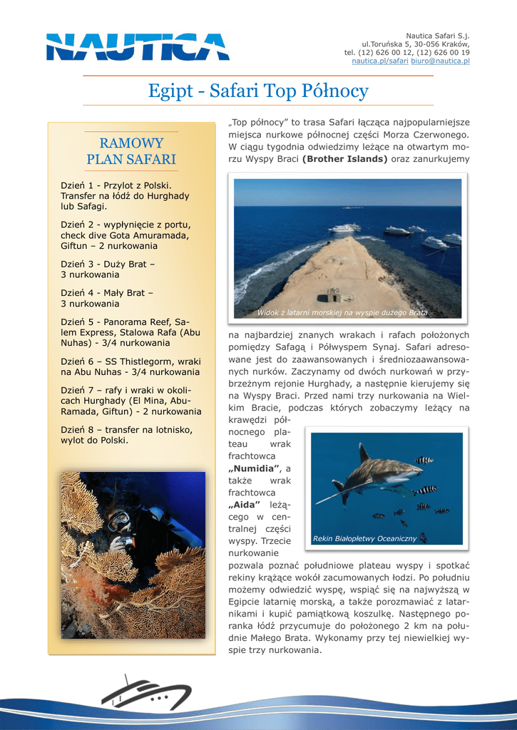 Nautica Safari S.j. ul.Toruńska 5, 30-056 Kraków, tel. (12) 626 00 12, (12) 626 00 19 nautica.pl/safari [email protected] Egipt - Safari Top Północy RAMOWY PLAN SAFARI „Top północy” to trasa Safari łącząca najpopularniejsze miejsca nurkowe północnej części Morza Czerwonego. W ciągu tygodnia odwiedzimy leżące na otwartym morzu Wyspy Braci (Brother Islands) oraz zanurkujemy Dzień 1 - Przylot z Polski. Transfer na łódź do Hurghady lub Safagi. Dzień 2 - wypłynięcie z portu, check dive Gota Amuramada, Giftun – 2 nurkowania Dzień 3 - Duży Brat – 3 nurkowania Dzień 4 - Mały Brat – 3 nurkowania Dzień 5 - Panorama Reef, Salem Express, Stalowa Rafa (Abu Nuhas) - 3/4 nurkowania Dzień 6 – SS Thistlegorm, wraki na Abu Nuhas - 3/4 nurkowania Dzień 7 – rafy i wraki w okolicach Hurghady (El Mina, AbuRamada, Giftun) - 2 nurkowania Dzień 8 – transfer na lotnisko, wylot do Polski. Widok z latarni morskiej na wyspie dużego Brata na najbardziej znanych wrakach i rafach położonych pomiędzy Safagą i Półwyspem Synaj. Safari adresowane jest do zaawansowanych i średniozaawansowanych nurków. Zaczynamy od dwóch nurkowań w przybrzeżnym rejonie Hurghady, a następnie kierujemy się na Wyspy Braci. Przed nami trzy nurkowania na Wielkim Bracie, podczas których zobaczymy leżący na krawędzi północnego plateau wrak frachtowca „Numidia”, a także wrak frachtowca „Aida” leżącego w centralnej części Rekin Białopłetwy Oceaniczny wyspy. Trzecie nurkowanie pozwala poznać południowe plateau wyspy i spotkać rekiny krążące wokół zacumowanych łodzi. Po południu możemy odwiedzić wyspę, wspiąć się na najwyższą w Egipcie latarnię morską, a także porozmawiać z latarnikami i kupić pamiątkową koszulkę. Następnego poranka łódź przycumuje do położonego 2 km na południe Małego Brata. Wykonamy przy tej niewielkiej wyspie trzy nurkowania. Nautica Safari S.j. ul.Toruńska 5, 30-056 Kraków, tel. (12) 626 00 12, (12) 626 00 19 nautica.pl/safari [email protected] KURSY W czasie safari istnieje możliwość wykonania następujących kursów pod okiem polskiego instruktora: AOWD Deep Wreck Foto Nitrox DPV – specjalizacja skuterowa Rajd na skuterach SUEX X-JOY7 Wrak SS Thistlegorm Poranne nurkowanie na północnym plateau jest okazją do spotkania z szarymi rekinami rafowymi, majestatycznie wypływającymi do nurków z błękitnej toni. Na nurkowaniu przy wschodnim brzegu wyspy zobaczymy rzędy potężnych gorgonii, wśród których uwijają się ławice ryb. Popołudniowe nurkowanie wykonamy wzdłuż zachodniego brzegu rafy, kończąc je przy plateau południowym. Rozpoczynając powrót do brzegu w rejonie Safagi odwiedzimy rafę Panorama lub Abu Kafan oraz zanurkujemy na wraku pasażerskiego promu Salem Express. Kolejne godziny upłyną na rejsie w stronę Hurghady, którą mijamy i cumujemy do Stalowej Rafy (Abu Nuhas). Wykonamy tutaj nurkowanie na wraku „Gianis D” i nurkowanie nocne przy ścianie rafy. Nad ranem przepływamy przez cieśninę Gubal i dwukrotnie nurkujemy na wraku najsłynniejszego wraku na Morzu Czerwonym – SS „Thistlegorm”. Następnie wracamy w kierunku Abu Nuhas i zanurzamy się przy wraku „Carnatica” lub „Chrysouli”. Ostatniego dnia odwiedzamy rafy w pobliżu Hurghady (Abu Ramada lub Giftun) oraz wrak ścigacza „El Mina” zatopionego podczas wojny 7dniowej. ZAPEWNIAMY Sprawdzoną i doświadczoną załogę Opiekę polskiego instruktora Ubezpieczenie nurkowe Wpis do CEOTiPT nr Z/7/2012 Koncesja Organizatora Turystyki Kompleksowa obsługa biura w Polsce Wrak SS Thistlegorm Nautica Safari S.j. ul.Toruńska 5, 30-056 Kraków, tel. (12) 626 00 12, (12) 626 00 19 nautica.pl/safari [email protected] CENA SAFARI: 790 EUR + 1550 PLN CENA ZAWIERA: Transfer na trasie: lotnisko – łódź – lotnisko. 7 noclegów, pierwszy lub ostatni może mieć miejsce w hotelu. Trzy posiłki dziennie oraz owoce i przekąski. Polski przewodnik nurkowy. Butle 11l (oraz ich napełnianie). Balast (bez taśm lub kieszeni balastowych). Napoje: kawa, herbata, napoje gazowane. 2 nurkowania pierwszego dnia. 3-4 nurkowania w dniach 2-5. 2 nurkowania ostatniego dnia. Ubezpieczenie KL, NW uwzględniające wypadki nurkowe. Przelot na trasie Polska – Egipt - Polska. CENA NIE ZAWIERA: Wizy egipskiej – 25$, Napiwku dla załogi – 30€, Dodatkowych posiłków poza łodzią, Pozostałego sprzętu nurkowego, Opłaty Reef Protection – 15€ Opłaty parkowej – 50€ Rekiny przy wyspie dużego Brata