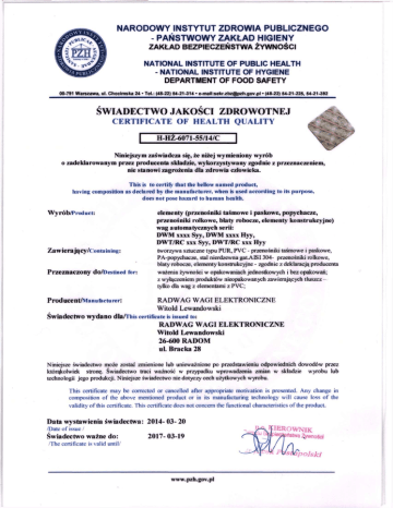NARODOWY INSTYTUT ZDROWIA PUBLICZNEGO - PAŃSTWOWY ZAKŁAD HIGIENY ZAKŁAD BEZPIECZEŃSTWA ŻYWNOŚCI NATIONAL INSTITUTE OF PUBLIC HEALTH - NATIONAL INSTITUTE OF HYGIENE DEPARTMENT O F FOOD S A F E T Y 00-791 Warszawa, ul. Chocimska 24 «Tel.: (48-22) 54-21-314 • e-mail:[email protected] • (48-22) 54-21-225, 54-21-392 ŚWIADECTWO JAKOŚCI ZDROWOTNEJ CERTIFICATE OF HEALTH QUALITY H-HZ-6071-55/14/C Niniejszym zaświadcza się, że niżej wymieniony w y r ó b o zadeklarowanym przez producenta składzie, wykorzystywany zgodnie z przeznaczeniem, nie stanowi zagrożenia dla zdrowia człowieka. This is to certify that the bellow named product, having composition as declared by the manufacturer, when is used according to its purpose, does not pose hazard to human health. Wy rób/P rod uct: Zawiera ją cy/Containing: Przeznaczony do/Destined for: Producent/Manufacturer: elementy (przenośniki taśmowe i paskowe, popycliacze, przenośniki rolkowe, blaty rotmcze, elementy konstrukcyjne) wag automatycznych serii: D W M xxxx Syy, D W M xxxx Hyy, D W T / R C xxx Syy, D W T / R C xxx Hyy tworzywa sztuczne typu PUR, PVC - przenośniki taśmowe i paskowe, PA-popychacze, stal nierdzewna gat.AISI 304- przenośniki rolkowe, blaty robocze, elementy konstrukcyjne - zgodnie z deklaracją producenta ważenia żywności w opakowaniach jednostkowych i bez opakowań; z wyłączeniem produktów nieopakowanych zawierających tłuszcz tylko dla wag z elementami z PVC; RADWAG WAGI ELEKTRONICZNE Witold Lewandowski Świadectwo wydano dla/This certificate is issued to: RADWAG WAGI E L E K T R O N I C Z N E Witold Lewandowski 26-600 RADOM ul. Bracka 28 Niniejsze świadectwo może zostać zmienione lub unieważnione po przedstawieniu odpowiednich dowodów przez którąkolwiek stronę. Świadectwo traci ważność w przypadku wprowadzenia zmian w składzie wyrobu lub technologii jego produkcji. Niniejsze świadectwo nie dotyczy cech użytkowych wyrobu. This certificate may be corrected or cancelled after appropriate motivation is presented. Any change in composition of the above mentioned product or in its manufacturing technology will cause loss of the validity of this certificate. This certificate does not concem the fiinctional characteristics of the product. Data wystawienia świadectwa: 2014- 03- 20 /Date of issue / Świadectwo ważne do: 2017- 03-19 lEROWNlK 'ństwa ^nośd /The certificate is valid until/ polski ww^. pzh.gov.pl