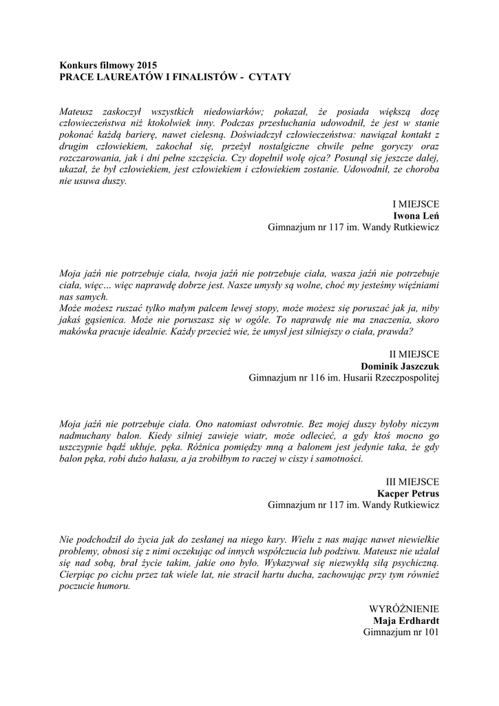 Konkurs filmowy 2015 PRACE LAUREATÓW I FINALISTÓW - CYTATY Mateusz zaskoczył wszystkich niedowiarków; pokazał, że posiada większą dozę człowieczeństwa niż ktokolwiek inny. Podczas przesłuchania udowodnił, że jest w stanie pokonać każdą barierę, nawet cielesną. Doświadczył człowieczeństwa: nawiązał kontakt z drugim człowiekiem, zakochał się, przeżył nostalgiczne chwile pełne goryczy oraz rozczarowania, jak i dni pełne szczęścia. Czy dopełnił wolę ojca? Posunął się jeszcze dalej, ukazał, że był człowiekiem, jest człowiekiem i człowiekiem zostanie. Udowodnił, ze choroba nie usuwa duszy. I MIEJSCE Iwona Leń Gimnazjum nr 117 im. Wandy Rutkiewicz Moja jaźń nie potrzebuje ciała, twoja jaźń nie potrzebuje ciała, wasza jaźń nie potrzebuje ciała, więc… więc naprawdę dobrze jest. Nasze umysły są wolne, choć my jesteśmy więźniami nas samych. Może możesz ruszać tylko małym palcem lewej stopy, może możesz się poruszać jak ja, niby jakaś gąsienica. Może nie poruszasz się w ogóle. To naprawdę nie ma znaczenia, skoro makówka pracuje idealnie. Każdy przecież wie, że umysł jest silniejszy o ciała, prawda? II MIEJSCE Dominik Jaszczuk Gimnazjum nr 116 im. Husarii Rzeczpospolitej Moja jaźń nie potrzebuje ciała. Ono natomiast odwrotnie. Bez mojej duszy byłoby niczym nadmuchany balon. Kiedy silniej zawieje wiatr, może odlecieć, a gdy ktoś mocno go uszczypnie bądź ukłuje, pęka. Różnica pomiędzy mną a balonem jest jedynie taka, że gdy balon pęka, robi dużo hałasu, a ja zrobiłbym to raczej w ciszy i samotności. III MIEJSCE Kacper Petrus Gimnazjum nr 117 im. Wandy Rutkiewicz Nie podchodził do życia jak do zesłanej na niego kary. Wielu z nas mając nawet niewielkie problemy, obnosi się z nimi oczekując od innych współczucia lub podziwu. Mateusz nie użalał się nad sobą, brał życie takim, jakie ono było. Wykazywał się niezwykłą siłą psychiczną. Cierpiąc po cichu przez tak wiele lat, nie stracił hartu ducha, zachowując przy tym również poczucie humoru. WYRÓŻNIENIE Maja Erdhardt Gimnazjum nr 101 Był świadom swoich działań również w kontekście bezpośrednich przyjaźni, ich przejawów, dotyczących wyłącznie jego i drugiej osoby. Był w stanie wyrazić empatię tak jak również powinien zwykły, ale prawdziwy mężczyzna. Umiał wyrazić choćby normalny ludzki opór, gdy z czymś się nie zgadzał. Jego ojciec byłby z niego dumny. WYRÓŻNIENIE Adam Smolarek Gimnazjum nr 1 z Oddziałami Dwujęzycznymi im. Roberta Schumana Prace finalistów Umysł jako nieokiełznany i piękny dar boży nie może być ograniczony niemocną powłoką. Pusta w środku marionetka bez uczuć, roślina, jaką nazywano mnie przez fakt, że moje ciało jest zbyt słabe, by ukazać to, co kryje się w świadomym umyśle. Dominika Narbut Gimnazjum nr 82 Jestem bardzo wdzięczny mojemu czarodziejowi, który był najlepszym ojcem na świecie. Sądził, że jestem prawdziwym mężczyzną, że można ze mną robić wszystko. Pamiętam wyścigi., naprawianie klamek. Emilia Kotowicz Gimnazjum nr 117 Zrozumiałem, że ludzie, których nie ogranicza ciało, hamowani są przez inne blokady, często bardziej nierealne niż moja bezwładność. Zuzanna Dąbek Gimnazjum nr 117 Są ludzie, którzy kochają swoje ciała. Odnaleźli dzięki nim szczęście, żyją z nimi w harmonii, są zdrowi, piękni. Moje ciało było zawsze moim największym wrogiem. Gabriela Włoszek Gimnazjum nr 117 Mateusz podbił moje serce właśnie tym, że bez żadnych słów potrafił pokazać, co czuje. Zdrowi fizycznie ludzie czasami nie umieją nawet tego powiedzieć. Marta Drabek Gimnazjum nr 18 Jego wytrwałość oraz wewnętrzna siła wzbudzają ogromny podziw. Niesamowite jest to, ze mimo więzienia, jakim było jego ciało, bohater nigdy nie stracił nadziei na porozumienie się z innymi. Malwina Hendzel Gimnazjum nr 18 Trud samodzielnego funkcjonowania w codzienności nie jest dla niego przeszkodą, by prowadzić życie z uśmiechem na twarzy. Towarzyszą mu emocje znane ludziom zdrowym. Potrafi kochać, nienawidzić, buntować się. Marta Sawicka Gimnazjum nr 18 Wiedział o tym, że został wyrzucony na margines społeczeństwa i dlatego starał się nie myśleć o przeszłości, tylko o tym, co będzie, co nadejdzie, wierzył w to, ze przyszłość zależy tylko od niego. Kasia Gawryluk Gimnazjum nr 82 Ludzie myśleli, ze jestem rośliną, czyli po prostu jestem. Nie czuję nic, nie słyszę, nie rozumiem. Porównywali mnie do psa, który się ślini na widok jedzenia. Tak nie było. Tak wcale nie jest. Rozumiem doskonale ludzi i mam swoje uczucia. Tylko moje sparaliżowane ciało nie robi tego, co powinno. Maria Torosian Gimnazjum nr 14 Co znaczy być prawdziwym mężczyzną? Kiedyś mówiono, że prawdziwy mężczyzna powinien zasadzić drzewo, zbudować dom i spłodzić syna. Mateusz nigdy tego nie zrobi, ma tylko swój umysł. Urszula Wojtaś Gimnazjum nr 49 Można powiedzieć, że mężczyzna to rycerz opiekujący się swoją rodziną i trzymający się swoich wyznaczonych zasad jak kodeksu rycerskiego. Zofia Gruba Społeczne Gimnazjum nr 14 Jestem taki sam jak reszta, a jednak inny. Ale co z tego? Oni mogą się śmiać z mojej inności. Ja mogę się śmiać, że wszyscy są identyczni. Kinga Babarowski Gimnazjum Integracyjne nr 52 Nic nie było mi obojętne. Byłem po prostu jak inni, tylko nie wszyscy to widzieli. Nawet moi bliscy często zapominali o tym. To się działo, gdy siostra zawiozła mnie do ośrodka, gdy mama nie chciała mnie z niego zabrać. Tomasz Płatek Gimnazjum nr 101 Przecież nie każdy może kierować firmą lub nawet państwem. Najtrudniej mieć władzę nad samym sobą. Podejmować właściwe decyzje tak, aby się nie wstydzić. Adam Zuba Gimnazjum nr 49 Poznając mnie, wejdziesz w moje buty i poczujesz w drobnym stopniu, jak to jest być na moim miejscu. Kamila Prętkopowicz Gimnazjum nr 15 P