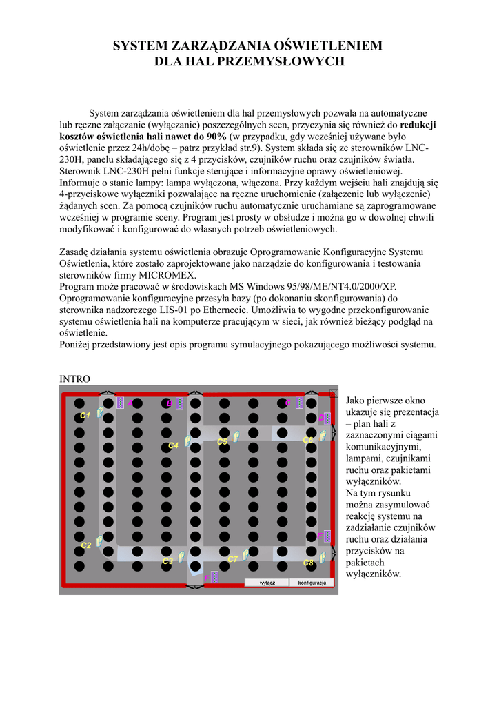 SYSTEM ZARZĄDZANIA OŚWIETLENIEM DLA HAL PRZEMYSŁOWYCH System zarządzania oświetleniem dla hal przemysłowych pozwala na automatyczne lub ręczne załączanie (wyłączanie) poszczególnych scen, przyczynia się również do redukcji kosztów oświetlenia hali nawet do 90% (w przypadku, gdy wcześniej używane było oświetlenie przez 24h/dobę – patrz przykład str.9). System składa się ze sterowników LNC230H, panelu składającego się z 4 przycisków, czujników ruchu oraz czujników światła. Sterownik LNC-230H pełni funkcje sterujące i informacyjne oprawy oświetleniowej. Informuje o stanie lampy: lampa wyłączona, włączona. Przy każdym wejściu hali znajdują się 4-przyciskowe wyłączniki pozwalające na ręczne uruchomienie (załączenie lub wyłączenie) żądanych scen. Za pomocą czujników ruchu automatycznie uruchamiane są zaprogramowane wcześniej w programie sceny. Program jest prosty w obsłudze i można go w dowolnej chwili modyfikować i konfigurować do własnych potrzeb oświetleniowych. Zasadę działania systemu oświetlenia obrazuje Oprogramowanie Konfiguracyjne Systemu Oświetlenia, które zostało zaprojektowane jako narządzie do konfigurowania i testowania sterowników firmy MICROMEX. Program może pracować w środowiskach MS Windows 95/98/ME/NT4.0/2000/XP. Oprogramowanie konfiguracyjne przesyła bazy (po dokonaniu skonfigurowania) do sterownika nadzorczego LIS-01 po Ethernecie. Umożliwia to wygodne przekonfigurowanie systemu oświetlenia hali na komputerze pracującym w sieci, jak również bieżący podgląd na oświetlenie. Poniżej przedstawiony jest opis programu symulacyjnego pokazującego możliwości systemu. INTRO Jako pierwsze okno ukazuje się prezentacja – plan hali z zaznaczonymi ciągami komunikacyjnymi, lampami, czujnikami ruchu oraz pakietami wyłączników. Na tym rysunku można zasymulować reakcję systemu na zadziałanie czujników ruchu oraz działania przycisków na pakietach wyłączników. Aby zasymulować działanie czujnika ruchu należy kliknąć pomarańczowy symbol ,lub poruszyć wskaźnikiem w obszarze działania czujnika (zaznaczoną szaroniebieską poświatą poruszającą się wokół symbolu czujnika). Wtedy symbole lamp przypisanych do czujników zmienią kolor oznaczając świecenie się lampy . Przycisk „wyłącz” „gasi” wszystkie lampy tzn. przywraca pierwotny czarny kolor. Przycisk „konfiguracja” uruchamia właściwy program konfiguracyjny. Po podaniu użytkownika oraz hasła mamy dostęp do opcji konfiguracyjnych systemu. Panele przy wejściach. Przy wejściach znajdują się panele gdzie każdy ma 4 przyciski pozwalające uruchomić indywidualnie przypisaną mu scenę. Po kliknięciu symbolu panelu powiększa się on i uaktywnia przyciski. Po wybraniu któregoś z nich symbol pakietu zmniejsza się dezaktywując włączniki. Uwaga 1. Na rysunku w wersji Demo załączana jest permanentnie scena załączona programem konfiguracyjnym symulując odczytywanie stanu aktualnego z systemu. 2. Zarówno symulacją ruchu jak i przyciskami z paneli następuje jedynie załączenie lamp ich wyłączenie uzyskujemy wciskając przycisk „wyłącz” na rysunku. 3. MENU GŁÓWNE Po uruchomieniu programu konfiguracyjnego hala.exe ukaże się główne okno programu z menu głównym w ich podstawowej formie. Okno przedstawia tablicę 108 sektorów, na które została podzielona hala zakładu. Każdy z sektorów odpowiada zainstalowanej oprawie oświetleniowej. Każdy z sektorów jest polem edycyjnym (przyciskiem), który może przybrać trzy kolory: SZARY - sprawna lampa nie włączoną (np. nie wchodzącą w skład sceny aktualnie załączonej) ŻÓŁTY - pracująca lampa CZERWONY – AWARIA (lampa wymaga interwencji serwisu nie działa prawidłowo) Po wybraniu klawisza z tablicy sektorów (opraw) pojawia się okno ze szczegółową informacją o stanie oprawy lampy. Punkty C1-C8 oznaczają czujniki ruchu. W momencie zadziałania któregoś z czujników lokalizacja (punkt) mu odpowiadający zmieni kolor na jasnozielony. Okno z zakładką „Konfiguracja” służy do zdefiniowania parametrów pracy systemu: • Czas wyłączenia oświetlenia przy braku ruchu – Czas (min), po którym przy braku ruchu w pomieszczeniu nastąpi samoczynne wyłączenie oświetlenia. Okno „Sceny” pozwala przypisać poszczególne lampy do jednej z ośmiu scen. Każdy czujnik ruchu można przypisać do jednej sceny ( najlepiej wszystkie czujniki do sceny gdzie załączają się ciągi komunikacyjne) oraz jeden z czterech przycisków przy wejściach do odpowiadającej mu sceny. Przyciski przy wejściach można konfigurować niezależnie. Konfiguracja polega na: - wybraniu zakładki odpowiadającej scenie, którą chcemy konfigurować - zaznaczeniu pól odpowiadającym oprawom oświetleniowym, które chcemy przypisać danej scenie. - zaznaczeniu pól czujników ruchu przypisywanych do sceny (pamiętając, że każdy czujnik jest tylko w jednej scenie) - przypisaniu numerów scen dla klawiszy kaset przy wejściach na halę. Klawisz „Zapisz” powoduje przesłanie informacji do systemu Wybranie innej zakładki bez wcześniejszego wciśnięcia klawisza „Zapisz” spowoduje utratę wprowadzonych zmian. Okno „harmonogram” pozwala ustalić kolejność i czas załączania się scen oświetlenia w zależności od pory dnia i dnia tygodnia. Konfiguracja przebiega następująco: zaznaczyć pola dni tygodnia dla których ma obowiązywać ten harmonogram przycisnąć klawisz „dalej” w nowym oknie wybieramy godzinę, minuty i sceny, które mają się załączyć o tym czasie. przycisnąć klawisz „Zapisz” w celu zapisania ustawień w systemie aby powrócić do poprzedniego okna należy przycisnąć klawisz „Anuluj” Można ustalić harmonogram dla określonej daty. w zakładce „harmonogram” przyciskamy klawisz „harmonogram szczególny” w nowym oknie klikamy przycisk kalendarza w oknie kalendarza ustalamy konkret
