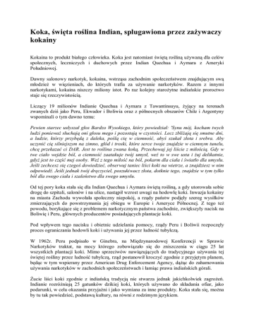 Koka, święta roślina Indian, splugawiona przez zażywaczy kokainy Kokaina to produkt białego człowieka. Koka jest natomiast świętą rośliną używaną dla celów społecznych, leczniczych i duchowych przez Indian Quechua i Aymara z Ameryki Południowej. Dawny salonowy narkotyk, kokaina, wstrząsa zachodnim społeczeństwem znajdującym swą młodzież w więzieniach, do których trafia za używanie narkotyków. Razem z innymi narkotykami, kokaina niszczy miliony istot. Po raz kolejny starożytne indiańskie proroctwo staje się rzeczywistością. Liczący 19 milionów Indianie Quechua i Aymara z Tawantinsuyu, żyjący na terenach zwanych dziś jako Peru, Ekwador i Boliwia oraz z północnych obszarów Chile i Argentyny wspominali o tym dawno temu: Pewien starzec usłyszał głos Bardzo Wysokiego, który powiedział: 'Synu mój, kocham twych ludzi ponieważ słuchają oni głosu mego i pozostają w czystości. Lecz zbliżają się smutne dni, a ludzie, którzy przybędą z daleka, poślą cię w ciemność, abyś szukał złota i srebra. Aby uczynić cię silniejszym na zimno, głód i troski, które serce twoje znajdzie w ciemnym tunelu, chcę przekazać ci DAR. Jest to roślina zwana koką. Przechowaj jej liście z miłością. Gdy w twe ciało wejdzie ból, a ciemność zaatakuje twój umysł, weź to w swe usta i żuj delikatnie, gdyż jest to część mej osoby. Weź z tego miłość na ból, pokarm dla ciała i światło dla umysłu. Jeśli zechcesz się czegoś dowiedzieć, obserwuj taniec liści koki na wietrze, a znajdziesz w nim odpowiedź. Jeśli jednak twój dręczyciel, poszukiwacz złota, dotknie tego, znajdzie w tym tylko ból dla swego ciała i szaleństwo dla swego umysłu. Od tej pory koka stała się dla Indian Quechua i Aymara świętą rośliną, a gdy utorowała sobie drogę do szpitali, salonów i na ulice, nastąpił wzrost uwagi na hodowlę koki. Inwazja kokainy na miasta Zachodu wywołała społeczny niepokój, a rządy państw podjęły szereg wysiłków zmierzających do powstrzymania jej obiegu w Europie i Ameryce Północnej. Z tego też powodu, borykające się z problemem narkotycznym państwa zachodnie, zwiększyły nacisk na Boliwię i Peru, głównych producentów posiadających plantacje koki. Pod wpływem tego nacisku i obietnic udzielania pomocy, rządy Peru i Boliwii rozpoczęły proces ograniczania hodowli koki i używania jej przez ludność tubylczą. W 1962r. Peru podpisało w Ginebra, na Międzynarodowej Konferencji w Sprawie Narkotyków traktat, na mocy którego zobowiązało się do zniszczenia w ciągu 25 lat wszystkich plantacji koki. Mimo sprzeciwów nawiązujących do tradycyjnego używania tej świętej rośliny przez ludność tubylczą, rząd postanowił kroczyć zgodnie z przyjętym planem, będąc w tym wspierany przez American Drug Enforcement Agency, dążąc do zahamowania używania narkotyków w zachodnich społeczeństwach i łamiąc prawa indiańskich górali. Żucie liści koki zgodnie z indiańską tradycją nie stwarza jednak jakichkolwiek zagrożeń. Indianie rozróżniają 25 gatunków dzikiej koki, których używano do składania ofiar, jako podarunki, w celu okazania przyjaźni i jako wymiana za inne produkty. Koka stała się, można by tu tak powiedzieć, podstawą kultury, na równi z rodzimym językiem. Indianie Quechua i Aymara znoszą w gruncie rzeczy społeczną, polityczną i ekonomiczną piramidę przytłaczających ich cierpień poprzez żucie koki, która ma też zarazem wielkie znaczenie w ich odżywianiu się. I tak na przykład - 100 gram koki równoważne jest 100 gramom mięsa lub jednego i pół jajka. Zgodnie z przeprowadzonymi badaniami, osoby spożywające dziennie 100 gram koki dostarczają tym samym organizmowi wymagane dawki wapnia, fosforu oraz witaminy A, B2 i C. Koka zawiera więcej wapnia niż mleko. Liści koki używa się również powszechnie podczas spotkań społecznych, kiedy to ofiarowane są starszyźnie i gościom. Zmarłą osobę spala się wraz z woreczkiem koki. Podczas odbywanych ceremonii liście koki ofiarowywane są Matce Ziemi - Pachamama, duchowi gór - Apus oraz Czterem Wiatrom i wszelkim innym duchom przy różnych innych okazjach. Kiedy autor tego artukułu podróżował po Kanadzie (co zajęło mu łącznie 3 lata), miał często kłopoty w nawiązaniu kontaktu ze swą rodziną z powodu różnych, nie planowanych opóźnień. Gdy moja rodzina chciała się wtedy dowiedzieć czegoś o mnie, czyniła tak, jak to robili nasi przodkowie. Zgodnie z nauką Stwórcy stawiali pytania duchom przy pomocy liści koki. Moja babka brała wtedy delikatnie w swe dłonie liście koki, a następnie zamykała razem dłonie i szeptała coś w rodzaju modlitwy, zadając zarazem pytanie. Posługując się indiańskim językiem runasimi pytała: Mamo Koka, proszę, powiedz mi, co się dzieje z mym synem? Czy jest on bezpieczny? Czy żyje? itp. Następnie otwierała swe dłonie, a liście koki dawały jej odpowiedź. Był to sposób porozumiewania się między nami aż do czasu, gdy 5 lat temu przeszła ona na chrześcijaństwo. Istniały też liczne lecznicze sposoby wykorzystywania tej świętej rośliny. Tubylcy wykorzystywali jej siłę leczniczą już od czasów Inków. Stosowano ją przy bólach głowy, zębów, żołądka i przy gorączce, a także jako napój poprawiający trawienie. Kokaina została po raz pierwszy wyodrębniona z koki przez białych naukowców w 1862r. Pracę nad działaniem koki zaczął prowadzić Zygmunt Freud, ojciec psychoanalityki. Freud eksperymentował początkowo z kokainą jako lokalnym środkiem znieczulającym przy operacji oka, dochodząc do odkrycia jej działania antydepresyjnego. Napój coca-cola zawierał w swych pierwszych normach produkcyjnych czystą kokainę. Dzisiaj kokainę uważa się za odpowiedzialną za wyniszczenie młodzieży Ameryki Północnej. Stworzyła też ona multibilionowy interes w zysku dolarowym płynącym z handlu narkoty