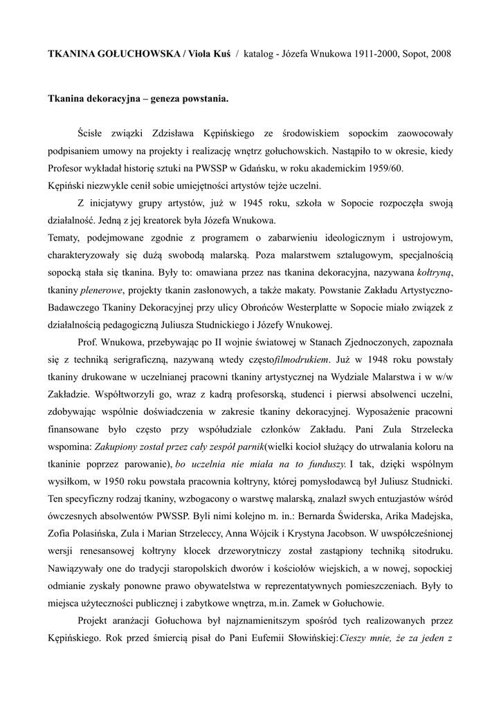 TKANINA GOŁUCHOWSKA / Viola Kuś / katalog - Józefa Wnukowa 1911-2000, Sopot, 2008 Tkanina dekoracyjna – geneza powstania. Ścisłe związki Zdzisława Kępińskiego ze środowiskiem sopockim zaowocowały podpisaniem umowy na projekty i realizację wnętrz gołuchowskich. Nastąpiło to w okresie, kiedy Profesor wykładał historię sztuki na PWSSP w Gdańsku, w roku akademickim 1959/60. Kępiński niezwykle cenił sobie umiejętności artystów tejże uczelni. Z inicjatywy grupy artystów, już w 1945 roku, szkoła w Sopocie rozpoczęła swoją działalność. Jedną z jej kreatorek była Józefa Wnukowa. Tematy, podejmowane zgodnie z programem o zabarwieniu ideologicznym i ustrojowym, charakteryzowały się dużą swobodą malarską. Poza malarstwem sztalugowym, specjalnością sopocką stała się tkanina. Były to: omawiana przez nas tkanina dekoracyjna, nazywana kołtryną, tkaniny plenerowe, projekty tkanin zasłonowych, a także makaty. Powstanie Zakładu ArtystycznoBadawczego Tkaniny Dekoracyjnej przy ulicy Obrońców Westerplatte w Sopocie miało związek z działalnością pedagogiczną Juliusza Studnickiego i Józefy Wnukowej. Prof. Wnukowa, przebywając po II wojnie światowej w Stanach Zjednoczonych, zapoznała się z techniką serigraficzną, nazywaną wtedy częstofilmodrukiem. Już w 1948 roku powstały tkaniny drukowane w uczelnianej pracowni tkaniny artystycznej na Wydziale Malarstwa i w w/w Zakładzie. Współtworzyli go, wraz z kadrą profesorską, studenci i pierwsi absolwenci uczelni, zdobywając wspólnie doświadczenia w zakresie tkaniny dekoracyjnej. Wyposażenie pracowni finansowane było często przy współudziale członków Zakładu. Pani Zula Strzelecka wspomina: Zakupiony został przez cały zespół parnik(wielki kocioł służący do utrwalania koloru na tkaninie poprzez parowanie), bo uczelnia nie miała na to funduszy. I tak, dzięki wspólnym wysiłkom, w 1950 roku powstała pracownia kołtryny, której pomysłodawcą był Juliusz Studnicki. Ten specyficzny rodzaj tkaniny, wzbogacony o warstwę malarską, znalazł swych entuzjastów wśród ówczesnych absolwentów PWSSP. Byli nimi kolejno m. in.: Bernarda Świderska, Arika Madejska, Zofia Polasińska, Zula i Marian Strzeleccy, Anna Wójcik i Krystyna Jacobson. W uwspółcześnionej wersji renesansowej kołtryny klocek drzeworytniczy został zastąpiony techniką sitodruku. Nawiązywały one do tradycji staropolskich dworów i kościołów wiejskich, a w nowej, sopockiej odmianie zyskały ponowne prawo obywatelstwa w reprezentatywnych pomieszczeniach. Były to miejsca użyteczności publicznej i zabytkowe wnętrza, m.in. Zamek w Gołuchowie. Projekt aranżacji Gołuchowa był najznamienitszym spośród tych realizowanych przez Kępińskiego. Rok przed śmiercią pisał do Pani Eufemii Słowińskiej:Cieszy mnie, że za jeden z tematów maturalnych wybrała Pani sprawy plastyczne, a konkretniej Zamek w Gołuchowie. Otrzymał on po dewastacjach wojennych nowy wystrój, przy tym częściowo ultra-nowoczesny; jak na możliwości sztuki polskiej w latach 50-tych, ale dostosowany jak najstaranniej do klimatu i tradycji budowli. Zamek, ongiś renesansowy o formach polskiej architektury XVI wieku, został w wieku XIX odbudowany wedle pojęć wówczas nowych, nowoczesnych, ale to znaczyło neorenesansowych. Chciano nawiązać do epok dawniejszych. Jednak z uwzględnieniem nowoczesnych potrzeb w zakresie użytkowym, a zwłaszcza wystawienniczym jako, że budowla została przeznaczona na muzeum, skarbnicę zbiorów Czartoryskich uzupełniającą Muzeum ich imienia w Krakowie. Po tej linii, utrzymanie wątku tradycji, jednak z wniesieniem akcentu odzwierciedlającego pojęcie artystyczne i specyfiki sztuki naszego czasu, poszła moja koncepcja renowacji. Problemem szczególnie trudnym a istotnym była sprawa tkanin obiciowych na ścianach, które poprzednio we wszystkich pomieszczeniach pokryto czerwonym, fabrycznym pluszem, stosowanym w całej Europie dla sal muzealnych i wystawowych. Tkaninę tę, to jest plusze naścienne, ludność powycinała doszczętnie i wyniosła. Można było z tego poszyć płaszczyki dla dzieci i dziewcząt z całego powiatu. Było to zrozumiałe w warunkach nędzy lat okupacyjnych i tradycyjnej biedoty miejscowego ludu rolniczego. Myślę, że szybko się z tego ocknięto, gdyż nie widziałem ani jednego płaszczyka na niczyich plecach. Problem tkanin stał jednak przed nami poważnie. Tak się złożyło, że w czasie planowania odbudowy zyskała duży rozgłos, nawet międzynarodowy, "tkanina polska" wykonana przez artystów, głównie malarzy, i to o bardzo znanych nazwiskach ze środowiska Szkoły Sztuk Plastycznych w Sopotach. Tą materią zdecydowałem się, jako ówczesny dyrektor Muzeum Narodowego w Poznaniu, któremu podlegał Zamek jako filia, obić wnętrza gołuchowskie według specjalnych projektów opracowanych przez artystów indywidualnie dla każdej sali zamkowej i w osobistym własnoręcznym wykonaniu przez autorów. Realizację moich zamiarów podjęła grupa artystów wybitnych, działając na gruncie wspólnie przedyskutowanego planu. 1 Profesor przeciwstawił wizji Działyńskiej własną kreację, nie mniej sugestywną, chociaż w charakterze zupełnie odmienną. Ścisłe kontakty Kępińskiego ze środowiskiem sopockim zaowocowały współpracą, której celem były projekty i realizacja tkaniny artystycznej we wnętrzach gołuchowskich. Dzięki obiciom ściennym w postaci nowoczesnej kołtryny, Dyrektor MNP konstruował rytm i gradację napięcia kolorystycznego poszczególnych sal. Kępiński aranżował przestrzeń z dużą dbałością o zestawienia tonacji barwnej, nie próbował rekonstruować, lecz tworzył indywidualną kreację. Paradoksalnie można by stwierdzić, że intencje, jakimi kierował się powojenny państwowy właściciel Zamku Gołuchowskiego, miały takie same idee, co niegdyś 1 . List Z. Kępińskiego do Eufemii Słowińskiej, Pozna