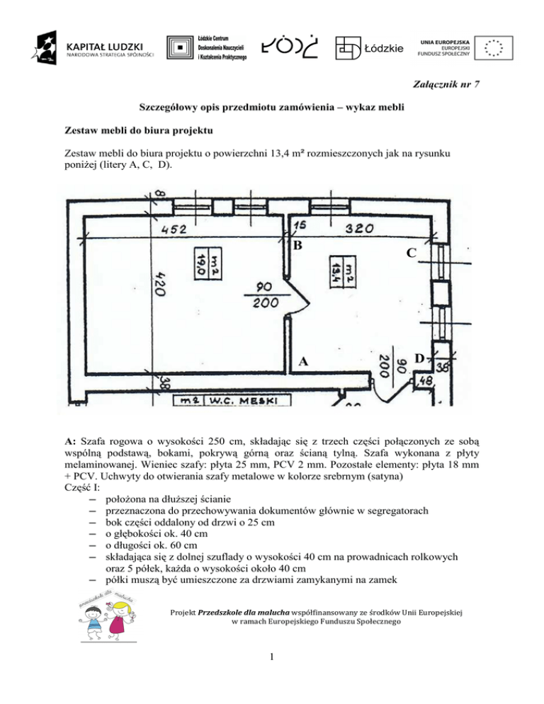 Załącznik nr 7 Szczegółowy opis przedmiotu zamówienia – wykaz mebli Zestaw mebli do biura projektu Zestaw mebli do biura projektu o powierzchni 13,4 m² rozmieszczonych jak na rysunku poniŜej (litery A, C, D). B A C D A: Szafa rogowa o wysokości 250 cm, składając się z trzech części połączonych ze sobą wspólną podstawą, bokami, pokrywą górną oraz ścianą tylną. Szafa wykonana z płyty melaminowanej. Wieniec szafy: płyta 25 mm, PCV 2 mm. Pozostałe elementy: płyta 18 mm + PCV. Uchwyty do otwierania szafy metalowe w kolorze srebrnym (satyna) Część I: ─ połoŜona na dłuŜszej ścianie ─ przeznaczona do przechowywania dokumentów głównie w segregatorach ─ bok części oddalony od drzwi o 25 cm ─ o głębokości ok. 40 cm ─ o długości ok. 60 cm ─ składająca się z dolnej szuflady o wysokości 40 cm na prowadnicach rolkowych oraz 5 półek, kaŜda o wysokości około 40 cm ─ półki muszą być umieszczone za drzwiami zamykanymi na zamek Projekt Przedszkole dla malucha współfinansowany ze środków Unii Europejskiej w ramach Europejskiego Funduszu Społecznego 1 Część II: połoŜona pomiędzy częścią I i III, wypełniająca cały róg składająca się z dolnej półki o wysokości ok. 30 cm, górnej półki o wysokości ok. 40 cm i przestrzeni do wieszania odzieŜy wierzchniej na drąŜku ─ zamykana na zamek Część III: ─ połoŜona na krótszej ścianie ─ zabudowany bok części oddalony od drzwi o 20 cm ─ o głębokości ok. 32 cm ─ o długości ok. 60 cm ─ składająca się z dolnej szuflady o wysokości 40 cm na prowadnicach rolkowych, 6 półek otwartych z przodu, kaŜda o wysokości ok. 40 cm, głębokości ok. 32 cm ─ ─ C: Biurko naroŜne o wymiarach: 160x120x75cm z pionowym kanałem kablowym w nogach. Nogi metalowe w kolorze srebrnym (satyna) odporne na zadrapania, zmianę koloru. Blat biurka z płyty melaminowanej o grubości 25 mm, obrzeŜe PVC o grubości 2 mm. Kontener do biurka o wysokości 60 cm, szerokości 40 cm i głębokości 50 cm na trwałych kółkach swobodnie poruszających się po róŜnego rodzaju podłoŜach.. Kontener musi zawierać 3 szuflady na prowadnicach rolkowych zamykane na zamek centralny. Kontener wykonany z płyty melaminowanej. Uchwyty do otwierania szuflad metalowe w kolorze srebrnym (satyna) Rysunek poglądowy biurka i konteneru D: Regał zamykany o wysokości 210 cm, szerokości 80 cm i głębokości 40 cm. Regał powinien składać się z dwóch części. Dolna część złoŜona z trzech równomiernie rozłoŜonych półek, a górna złoŜona z czterech równomiernie rozłoŜonych półek. Dolna i górna część zamykana osobno 2-skrzydłowymi drzwiami z zamkiem. Regał wykonany z płyty melaminowanej Wieniec regału: płyta 25 mm, PCV 2 mm. Pozostałe elementy: płyta 18 mm + PCV. Uchwyty do otwierania regału metalowe w kolorze srebrnym (satyna). Projekt Przedszkole dla malucha współfinansowany ze środków Unii Europejskiej w ramach Europejskiego Funduszu Społecznego 2 Opisane powyŜej meble powinny stanowić komplet. Meble powinny być koloru klon. Ergonomiczne krzesło biurowe z profilem siedziska oraz oparcia z regulacją wysokości i połoŜenia oparcia w kolorze czarnym. Oparcie z wysokogatunkowej siatki, miękkie, tapicerowane siedzisko. 5-ramienna podstawa metalowa w kolorze srebrnym (satyna). Kółka odpowiednie do kaŜdego rodzaju powierzchni. Projekt Przedszkole dla malucha współfinansowany ze środków Unii Europejskiej w ramach Europejskiego Funduszu Społecznego 3