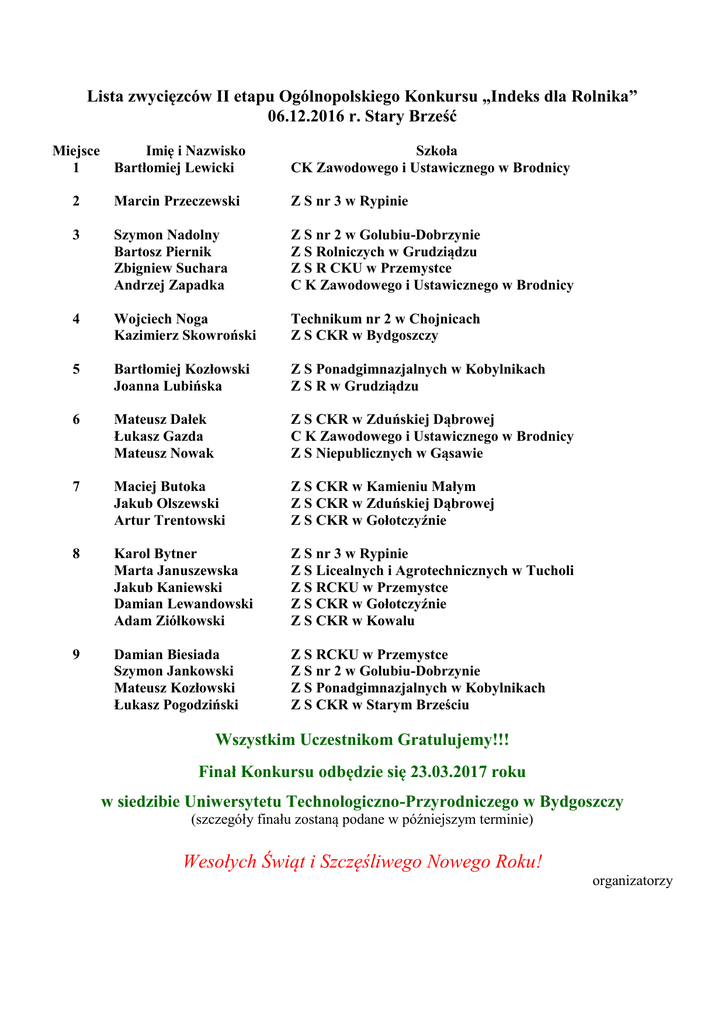 Lista zwycięzców II etapu Ogólnopolskiego Konkursu „Indeks dla Rolnika” 06.12.2016 r. Stary Brześć Miejsce Imię i Nazwisko 1 Bartłomiej Lewicki Szkoła CK Zawodowego i Ustawicznego w Brodnicy 2 Marcin Przeczewski Z S nr 3 w Rypinie 3 Szymon Nadolny Bartosz Piernik Zbigniew Suchara Andrzej Zapadka Z S nr 2 w Golubiu-Dobrzynie Z S Rolniczych w Grudziądzu Z S R CKU w Przemystce C K Zawodowego i Ustawicznego w Brodnicy 4 Wojciech Noga Kazimierz Skowroński Technikum nr 2 w Chojnicach Z S CKR w Bydgoszczy 5 Bartłomiej Kozłowski Joanna Lubińska Z S Ponadgimnazjalnych w Kobylnikach Z S R w Grudziądzu 6 Mateusz Dałek Łukasz Gazda Mateusz Nowak Z S CKR w Zduńskiej Dąbrowej C K Zawodowego i Ustawicznego w Brodnicy Z S Niepublicznych w Gąsawie 7 Maciej Butoka Jakub Olszewski Artur Trentowski Z S CKR w Kamieniu Małym Z S CKR w Zduńskiej Dąbrowej Z S CKR w Gołotczyźnie 8 Karol Bytner Marta Januszewska Jakub Kaniewski Damian Lewandowski Adam Ziółkowski Z S nr 3 w Rypinie Z S Licealnych i Agrotechnicznych w Tucholi Z S RCKU w Przemystce Z S CKR w Gołotczyźnie Z S CKR w Kowalu 9 Damian Biesiada Szymon Jankowski Mateusz Kozłowski Łukasz Pogodziński Z S RCKU w Przemystce Z S nr 2 w Golubiu-Dobrzynie Z S Ponadgimnazjalnych w Kobylnikach Z S CKR w Starym Brześciu Wszystkim Uczestnikom Gratulujemy!!! Finał Konkursu odbędzie się 23.03.2017 roku w siedzibie Uniwersytetu Technologiczno-Przyrodniczego w Bydgoszczy (szczegóły finału zostaną podane w późniejszym terminie) Wesołych Świąt i Szczęśliwego Nowego Roku! organizatorzy