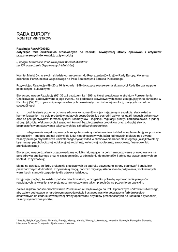 RADA EUROPY KOMITET MINISTRÓW Rezolucja ResAP(2005)2 dotycząca farb drukarskich stosowanych do zadruku zewnętrznej strony opakowań i artykułów przeznaczonych do kontaktu z żywnością (Przyjęta 14 września 2005 roku przez Komitet Ministrów na 937 posiedzeniu Deputowanych Ministrów) Komitet Ministrów, w swoim składzie ograniczonym do Reprezentantów krajów Rady Europy, którzy są członkami Porozumienia Częściowego na Polu Społecznym i Zdrowia Publicznego,1 Przywołując Rezolucję (59) 23 z 16 listopada 1959 dotyczącą rozszerzenia aktywności Rady Europy na polu społecznym i kulturalnym; Biorąc pod uwagę Rezolucję (96) 35 z 2 października 1996, w której zrewidowano struktury Porozumienia Częściowego i zadecydowano o jego trwaniu, na podstawie zrewidowanych zasad zastępujących te określone w Rezolucji (59) 23, czynności przeprowadzanych i rozwiniętych w duchu tej rezolucji; mających na celu w szczególności: a. podniesienie poziomu ochrony zdrowia konsumentów w jak najszerszym aspekcie: stały wkład w harmonizowanie – na polu produktów mających bezpośredni lub pośredni wpływ na ludzki łańcuch pokarmowy oraz na polu pestycydów, farmaceutyków i kosmetyków – legislacji, regulacji i praktyk zarządzających, z jednej strony, jakością, efektywnością i zasadami kontroli bezpieczeństwa produktów oraz, z drugiej strony, bezpieczeństwem stosowania toksycznych lub szkodliwych produktów; b. integrowanie niepełnosprawnych ze społecznością: definiowanie – i wkład w implementację na poziomie europejskim – modelu spójnej polityki dla ludzi niepełnosprawnych, która jednocześnie bierze pod uwagę zasady pełnego obywatelstwa i niezależnego życia; wkład w eliminowanie barier dla integracji, jakiejkolwiek by były natury, psychologicznej, edukacyjnej, rodzinnej, kulturowej, społecznej, zawodowej, finansowej lub architektonicznej; Biorąc pod uwagę działania przeprowadzane od kilku lat, mające na celu harmonizowanie prawodawstwa na polu zdrowia publicznego oraz, w szczególności, w odniesieniu do materiałów i artykułów przeznaczonych do kontaktu z żywnością; Mając na uwadze, że farby drukarskie stosowanych do zadruku zewnętrznej strony opakowań i artykułów przeznaczonych do kontaktu z żywnością mogą, poprzez migrację składników do pożywienia, w określonych warunkach, stanowić zagrożenie dla zdrowia ludzkiego; Przyjmując pogląd, że każde z państw członkowskich, w przypadku potrzeby wprowadzenia przepisów regulujących tą kwestię, skorzysta na zharmonizowaniu takich przepisów na poziomie europejskim, Zaleca rządom państw członkowskich Porozumienia Częściowego na Polu Społecznym i Zdrowia Publicznego, aby wzięły pod uwagę w narodowym prawodawstwie i ustawodawstwie dotyczącym farb drukarskich stosowanych do zadruku zewnętrznej strony opakowań i artykułów przeznaczonych do kontaktu z żywnością zasady wyznaczone poniżej. 1 Austria, Belgia, Cypr, Dania, Finlandia, Francja, Niemcy, Irlandia, Włochy, Luksemburg, Holandia, Norwegia, Portugalia, Słowenia, Hiszpania, Szwecja, Szwajcaria i Zjednoczone Królestwo. Załącznik do Rezolucji ResAP(2005)2 1. CEL 1.1. Rezolucja ma zastosowanie do farb i lakierów drukarskich (od tej pory zwanych “farbami do opakowań”) i każdej warstwy farb lub lakierów drukarskich, kolorowej lub nie, nałożonej podczas odpowiedniego procesu na zewnętrznej strony opakowań i artykułów przeznaczonych do kontaktu z żywnością. 1.2. Warstwy farb do opakowań w bezpośrednim kontakcie z żywnością są wyłączone z zakresu zastosowania niniejszej rezolucji. 1.3. W przypadku istnienia dowodów, że użyte podłoże uniemożliwia migrację jakichkolwiek substancji z farby do opakowań, i możliwe jest uniknięcie odbijania lub innego przechodzenia substancji, niniejsza rezolucja nie ma zastosowania. 2. DEFINICJE Na potrzeby niniejszej rezolucji przyjmuje się, że: 2.1. farby do opakowań to farby i lakiery drukarskie stosowane do zadruku zewnętrznej strony opakowań i artykułów przeznaczonych do kontaktu z żywnością; 2.2. farby do opakowań oznaczają każdą mieszaninę wytworzoną z pigmentów, spoiw, plastyfikatorów, rozcieńczalników, suszek i innych dodatków. Oparte na bazie rozcieńczalników, wody, oleo – żywiczne, lub utrwalane poprzez dostarczenie energii (promieniowaniem UV lub strumieniem elektronów). Stosowane w procesie drukowania lub lakierowania, techniką fleksograficzną, wklęsłodrukową, offsetową, sitodrukową (farba lub lakier); 2.3. farby do opakowań, w swoim gotowym stanie, są cienkimi warstwami wyschniętej lub utrwalonej farby lub lakieru na zewnętrznej stronie podłoża; 2.4. podłoże to każdy materiał lub artykuł przeznaczony do kontaktu z żywnością, taki jak szkło, metal, papier, karton, plastik, tkanina lub laminat wytworzony z tych materiałów. 3. WYMAGANIA 3.1. Zadrukowane materiały i artykuły przeznaczone do kontaktu z żywnością, nie powinny, w swoim gotowym stanie i przy normalnych i możliwych do przewidzenia warunkach użycia, przekazywać swoich składników do pożywienia w ilościach, które zagrażać mogą ludzkiemu zdrowiu lub w sposób nieakceptowany zmieniać skład żywności lub pogarszać jej charakterystyki organoleptyczne, zgodnie z Artykułem 3 Rozporządzenia (WE) nr 1935/2004. 3.2. Aby spełnić ten cel, należy spełnić następujące wymagania: 3.2.1. substancje wchodzące w skład farb do opakowań powinny być dobrane w zgodności z wymaganiami dotyczącymi doboru substancji do produkcji farb do opakowań wyznaczonymi w Dokumencie Technicznym Nr 1: 3.2.1.1 do produkcji farb objętych niniejszą rezolucją można użyć jedynie substancji wymienionych w spisie substancji; 3.2.1.2 substancje wymienione w spisie, ale nie określone toksykologicznie mogą być zastosowane pod warunkiem udowodnienia, że nie będą one migrować do pożywienia.2 W tym celu należy zastoso
